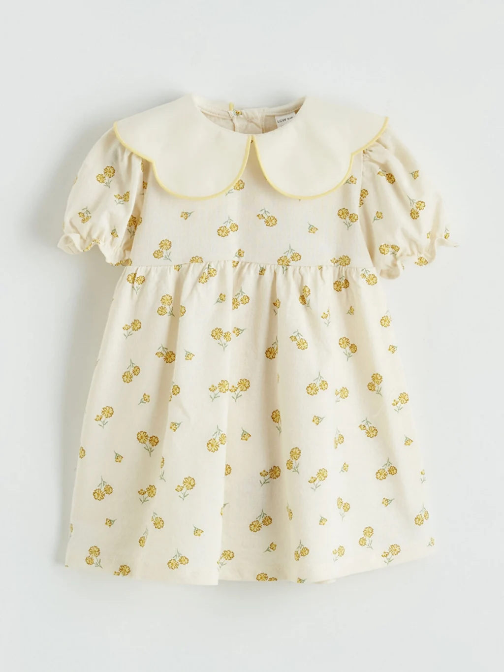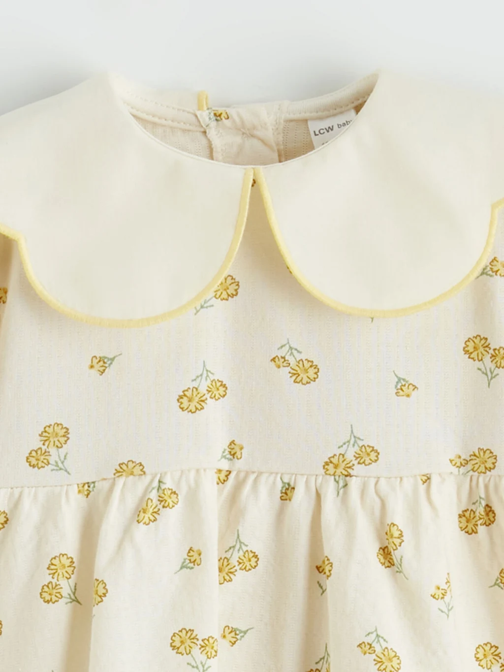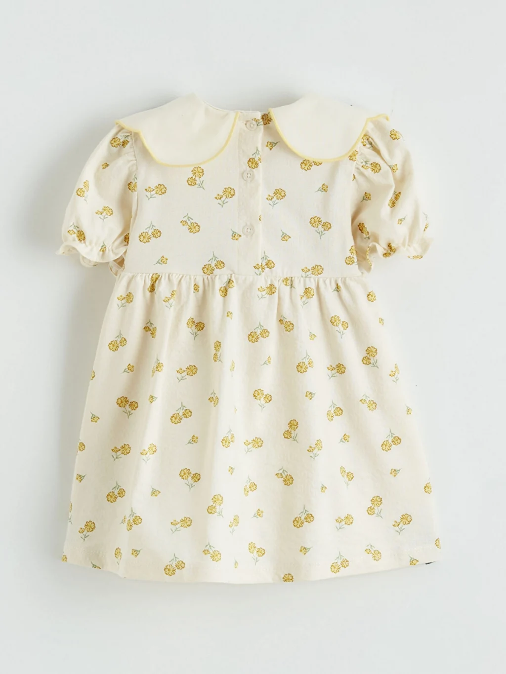 Bebe yaka, kısa balon kollu ve çiçek desenli kız bebek elbise, %100 pamuk krinkle kumaştan üretilmiştir. Arkadan düğme kapamalıdır.