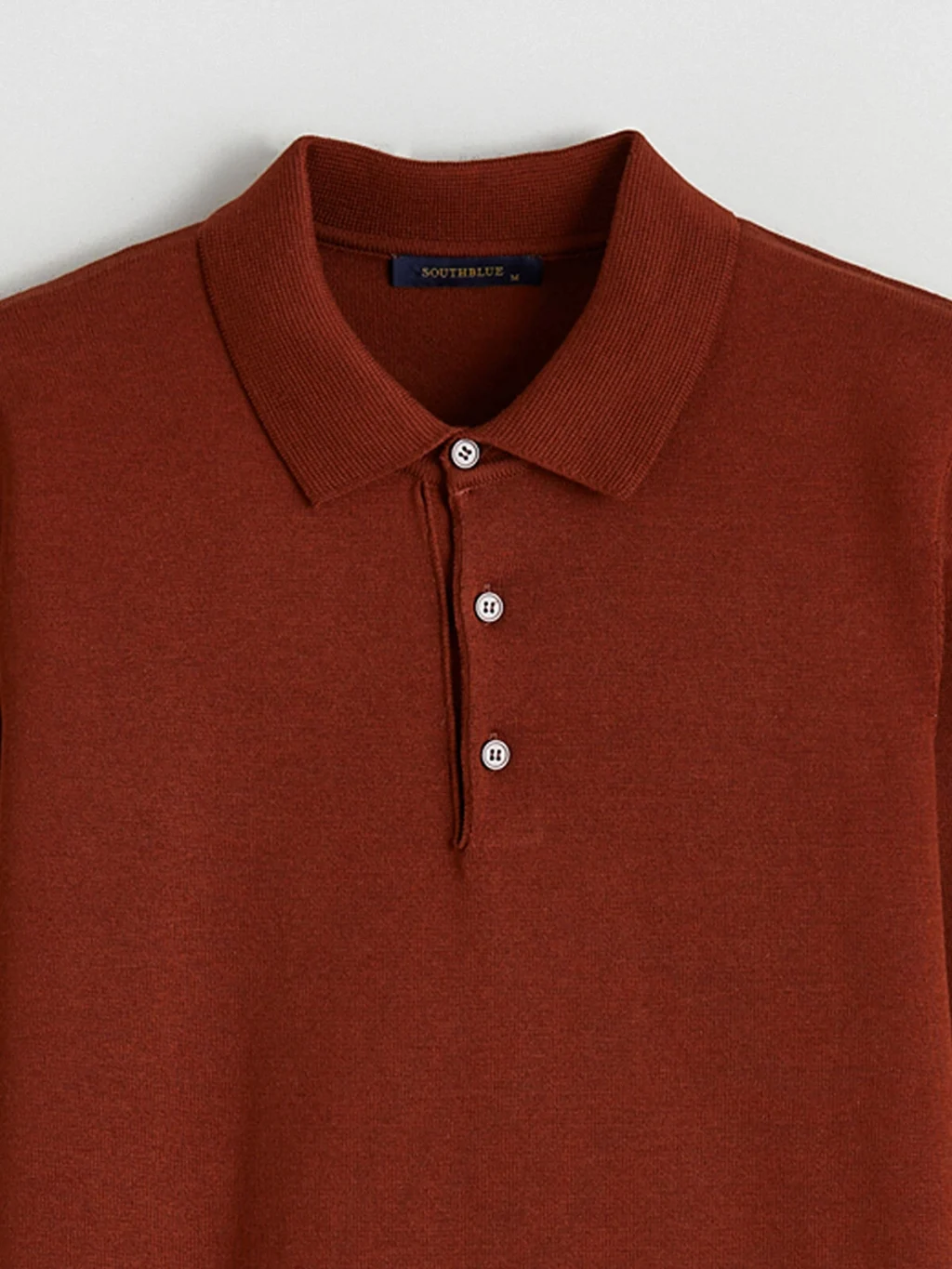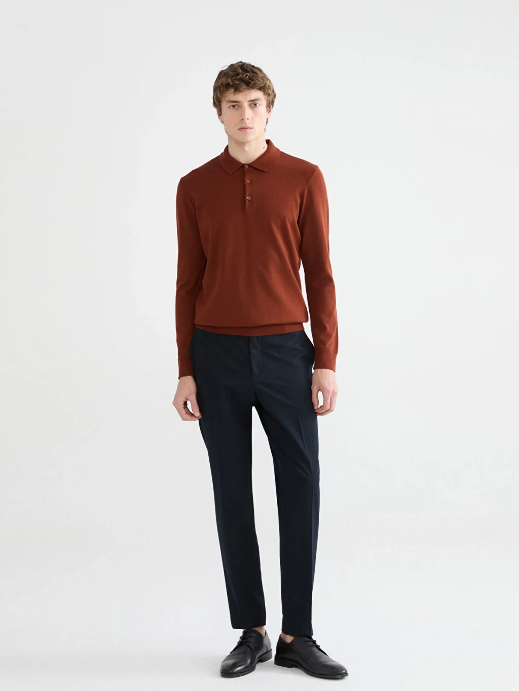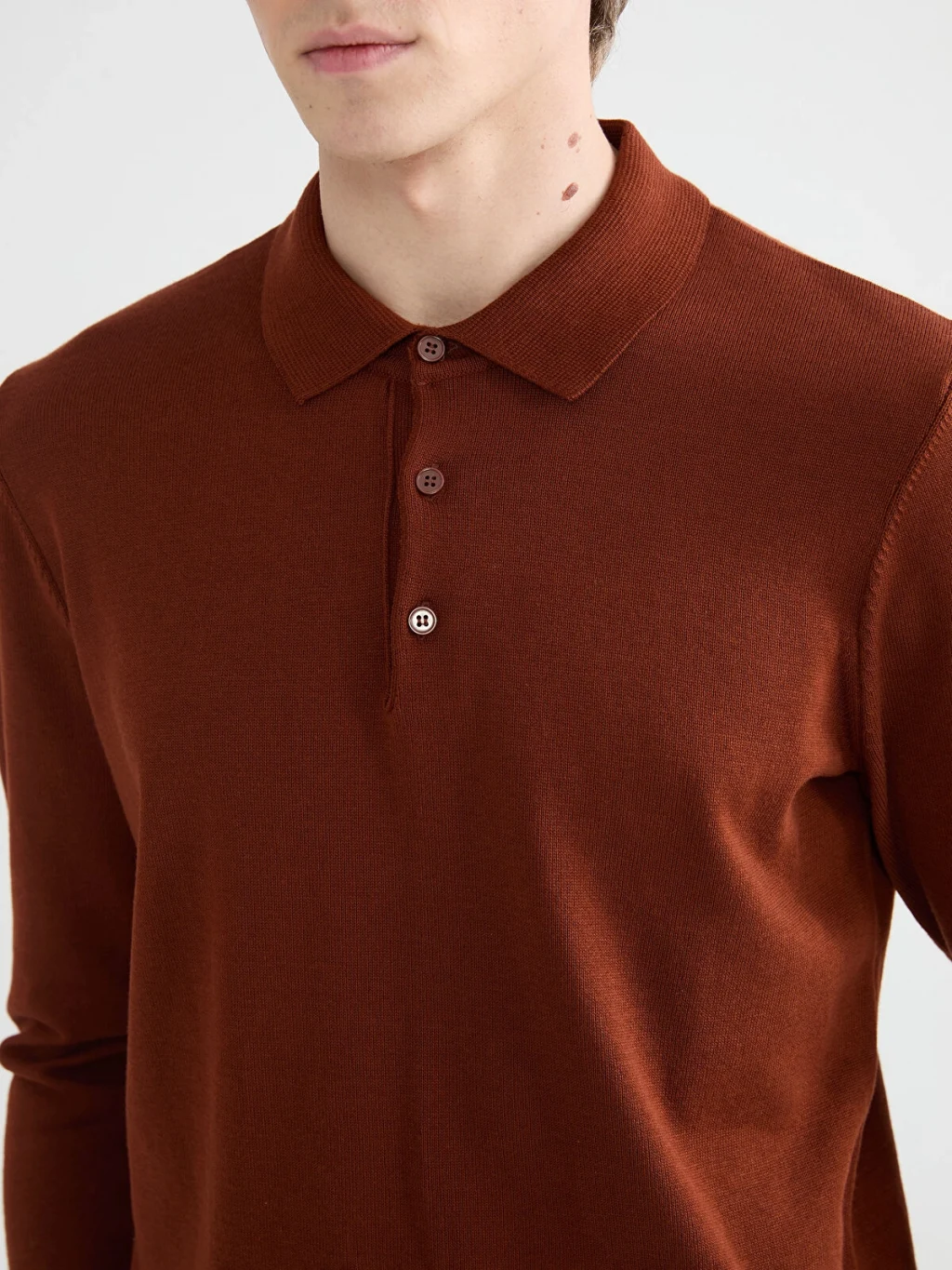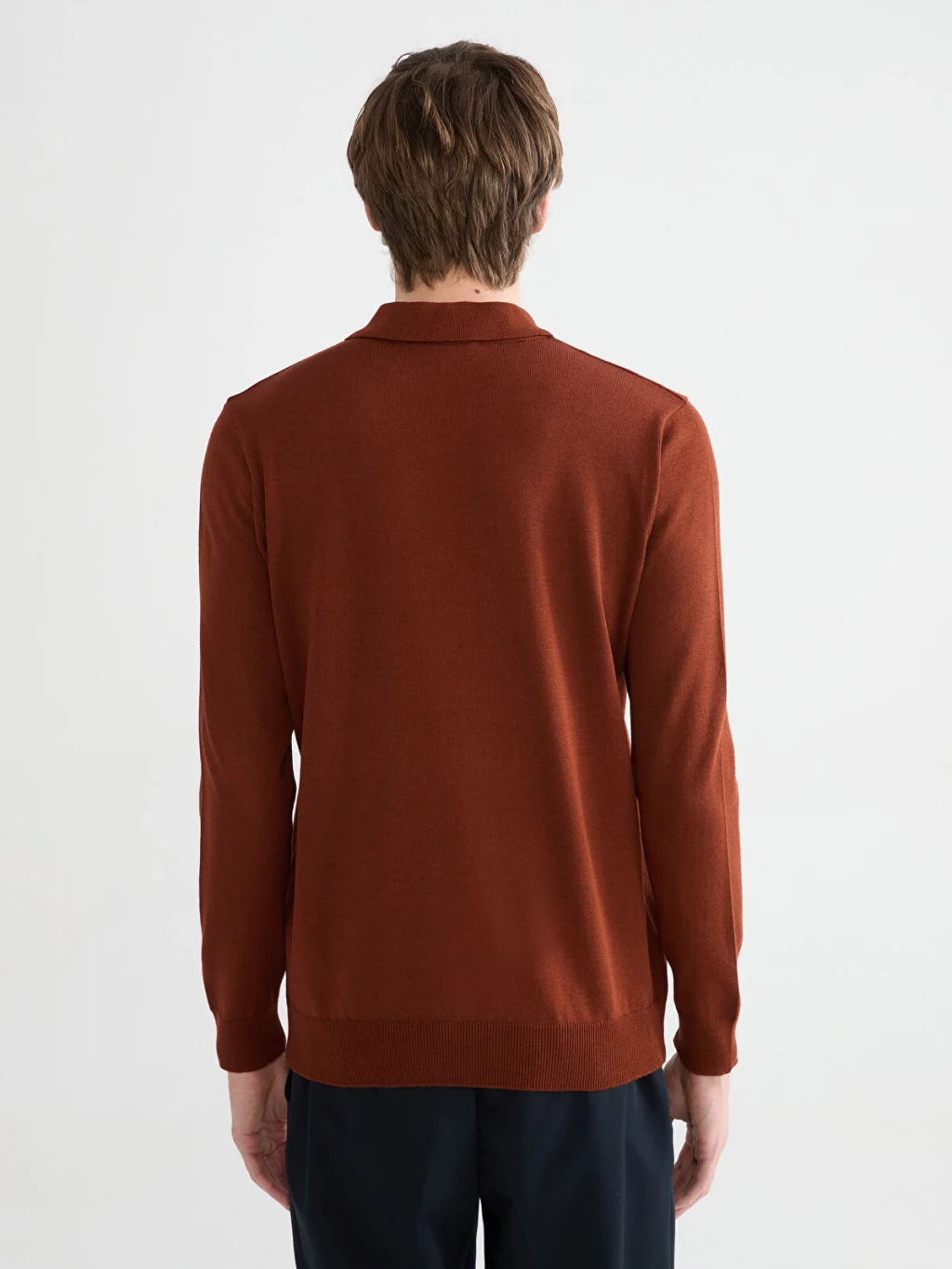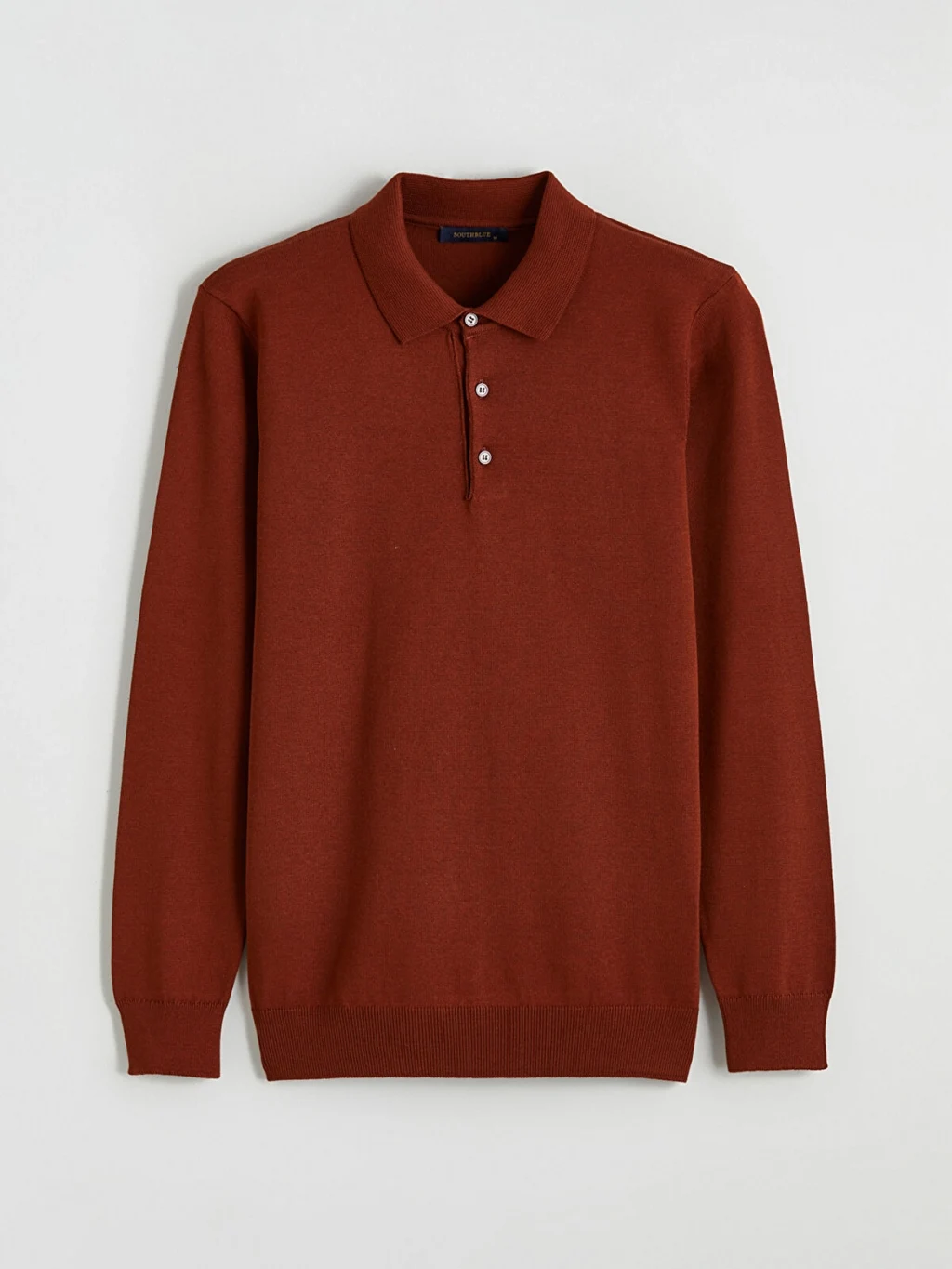Polo yaka ve uzun kollu erkek kazak, yaka kısmında düğme kapaması bulunur. Manşetleri ve etek ucu ribanalıdır.