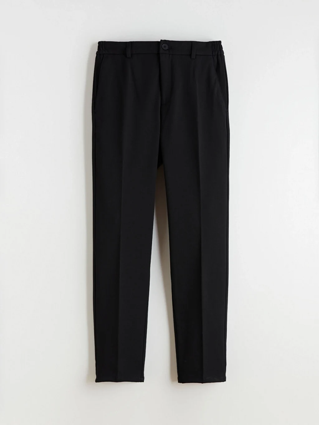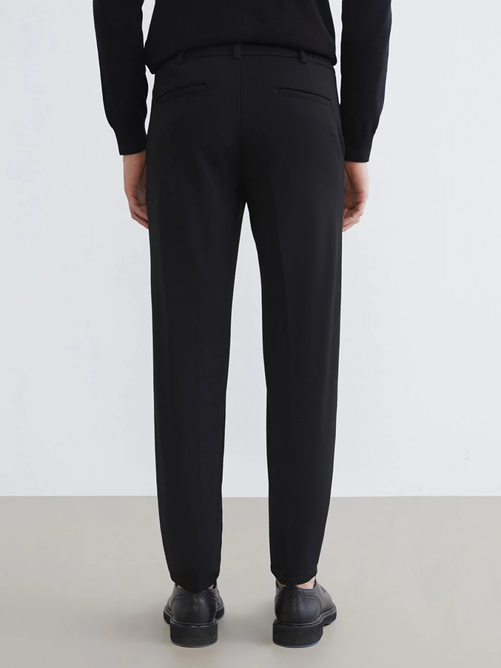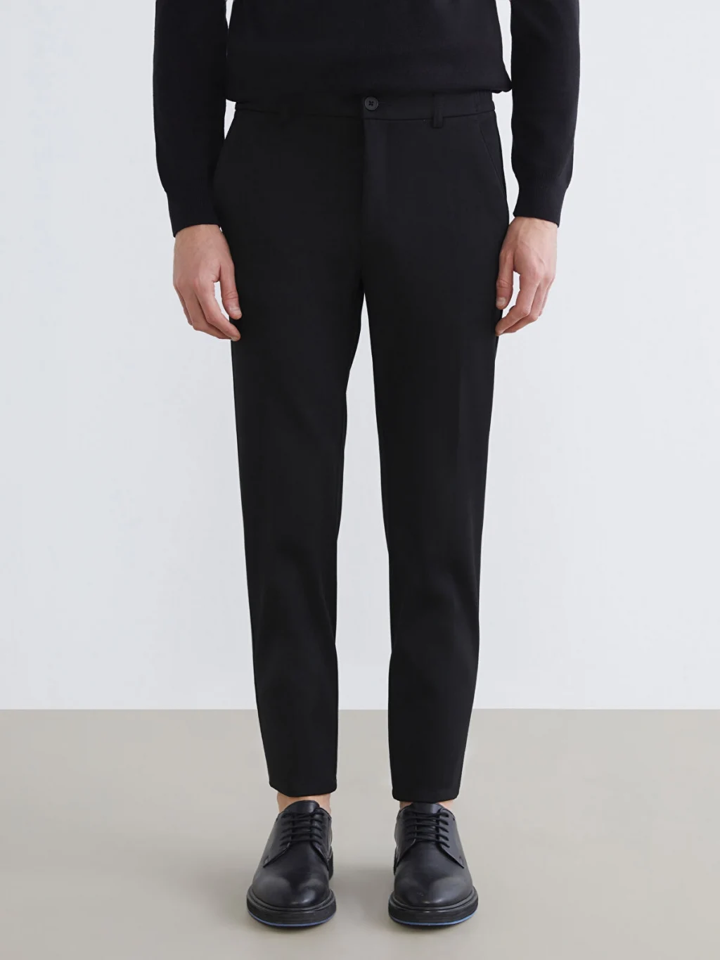 Standart kalıp erkek pantolon, poliviskon kumaştan üretilmiştir. Beli kısmen lastiklidir, düğme ve fermuar kapamalıdır. Yan cepleri bulunur.
