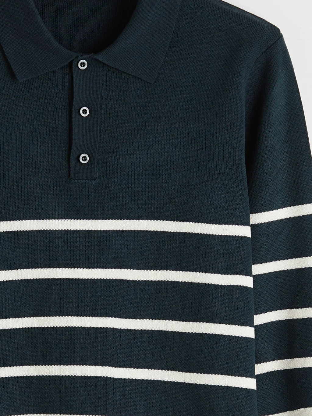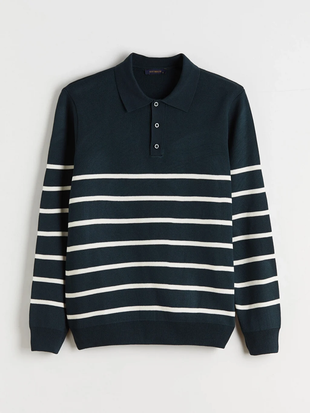 Polo yakalı, uzun kollu erkek kazak, çizgili desene sahiptir. Önden düğme kapamalı modelin kol ve etek uçları ribanalıdır.