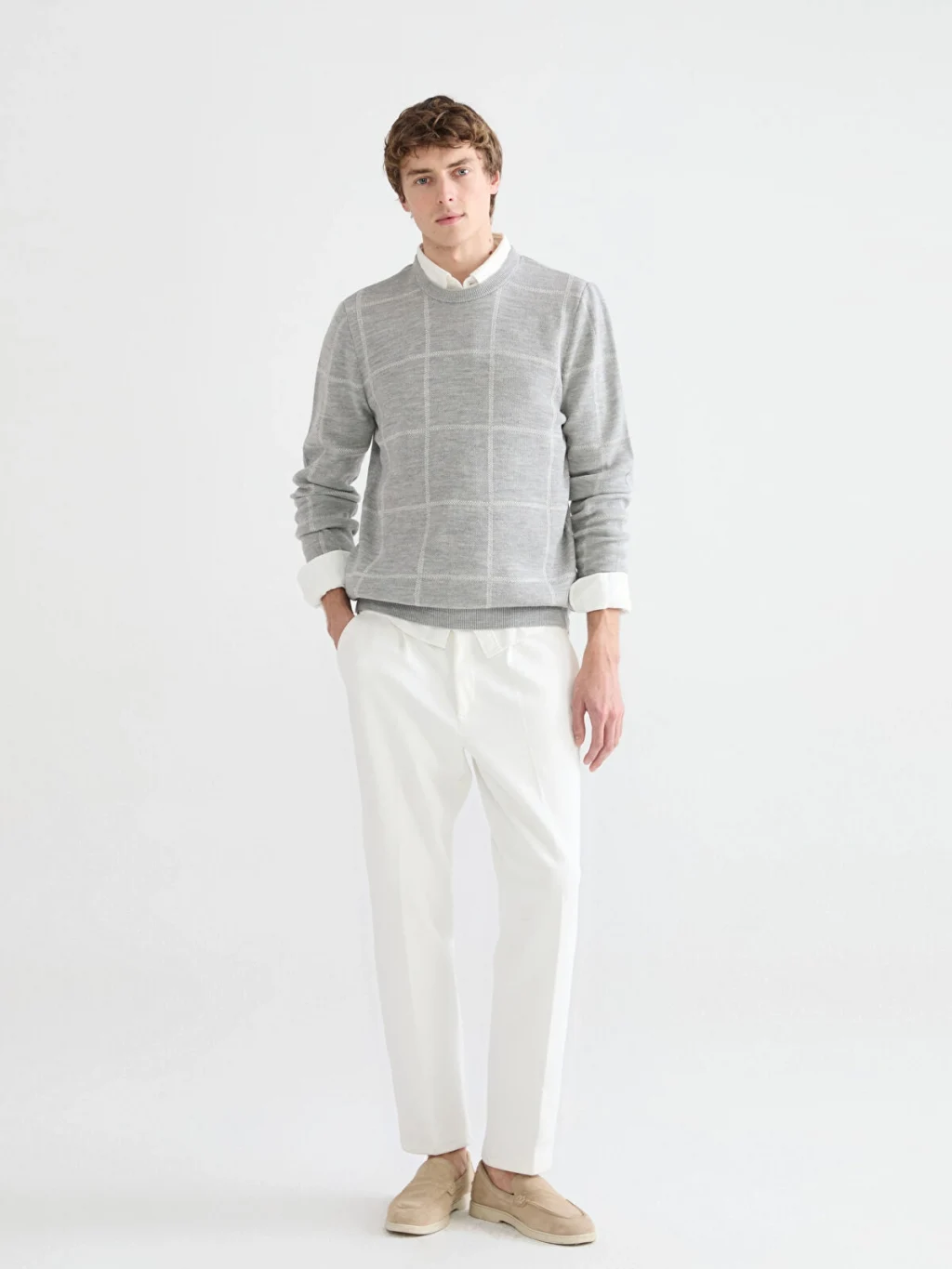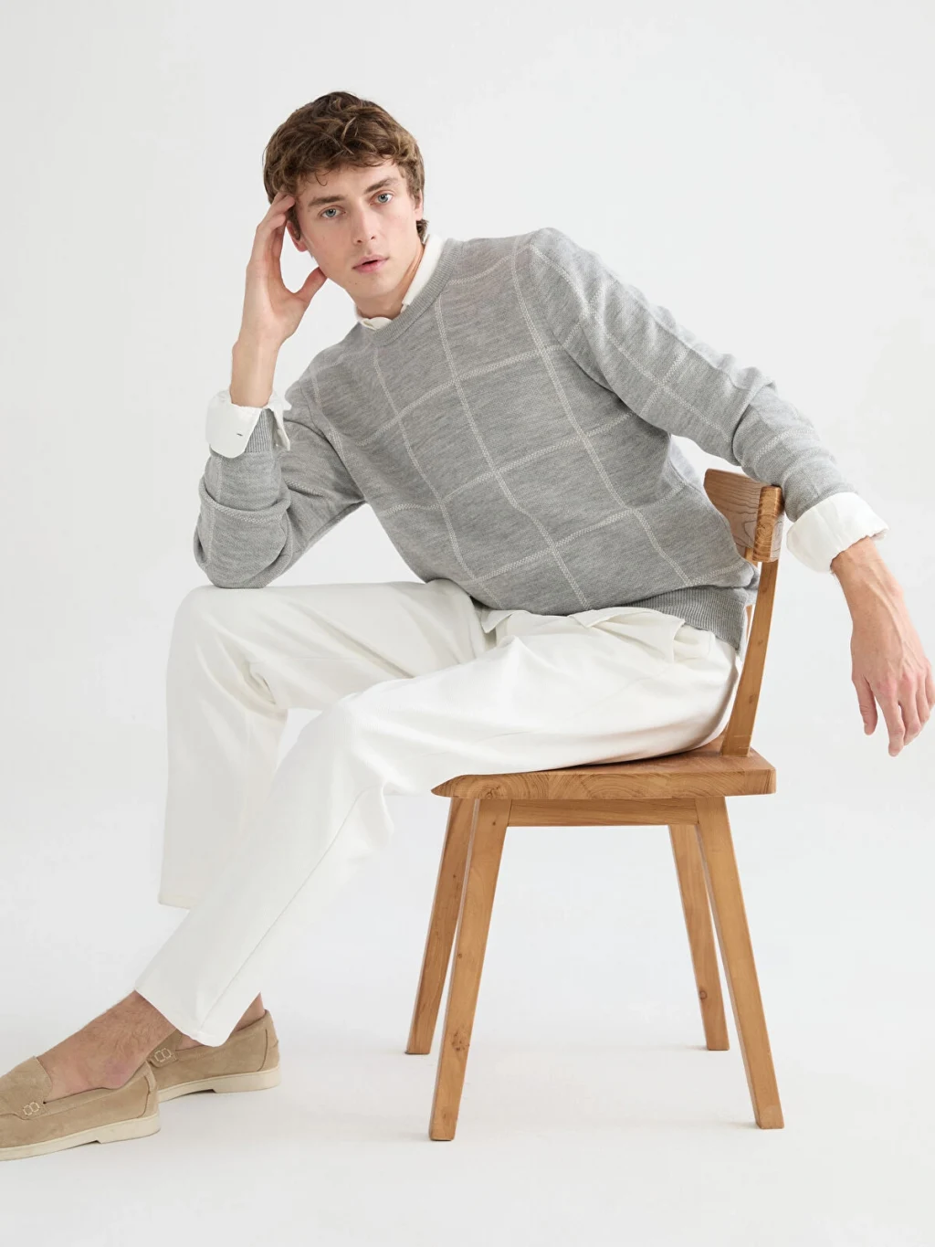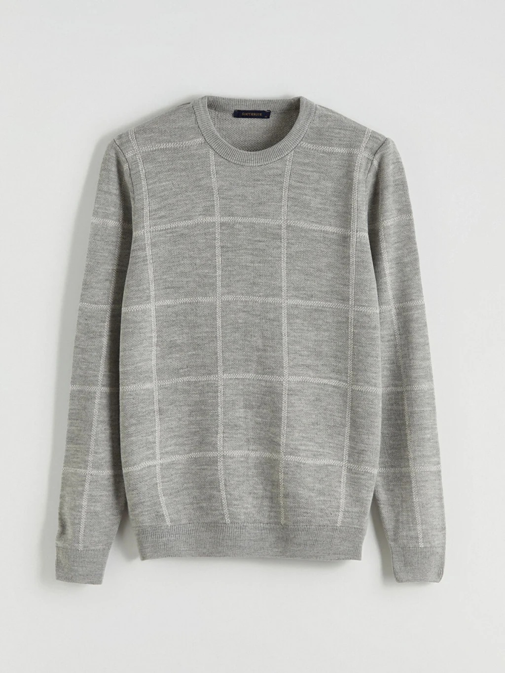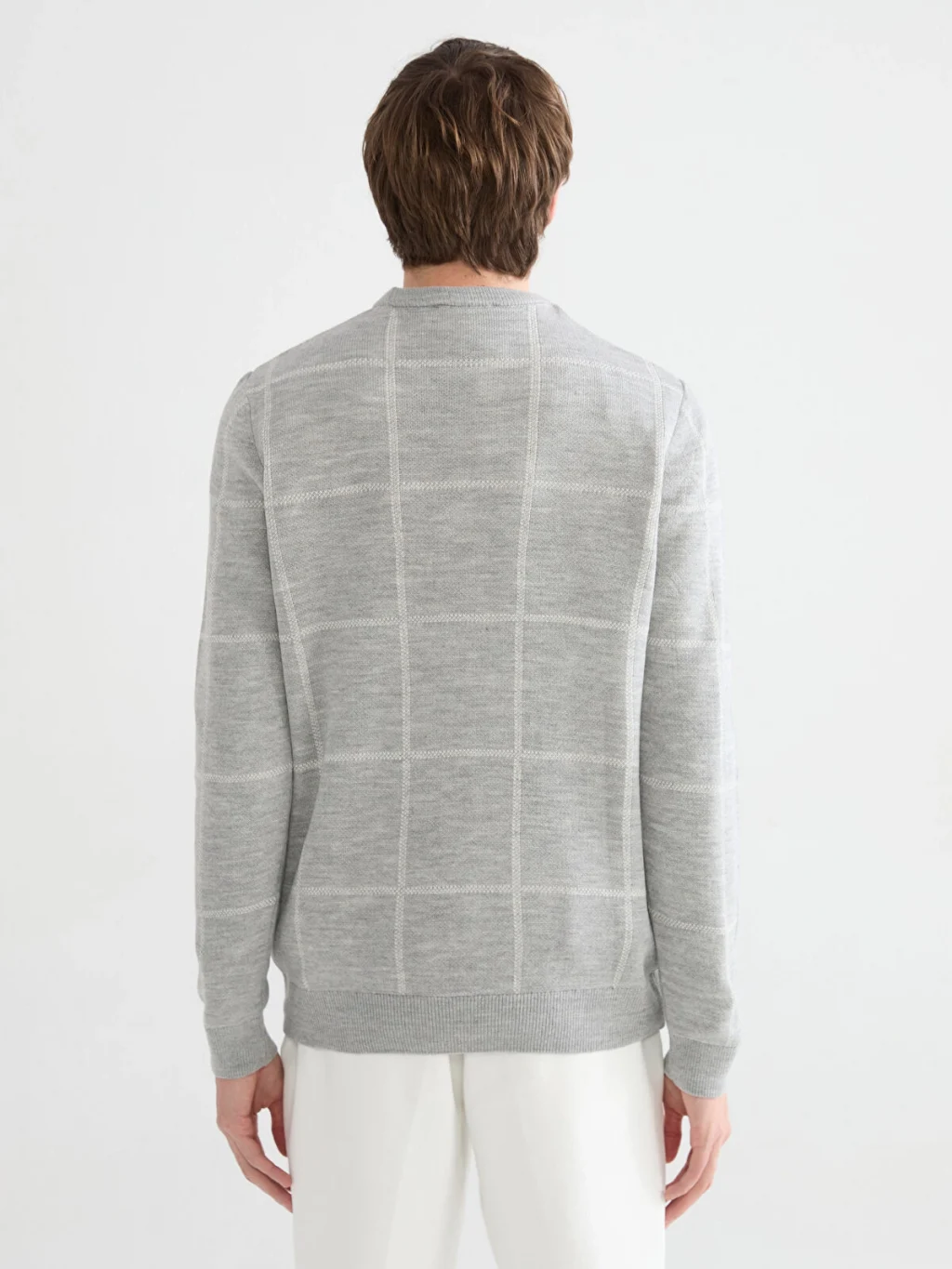 Bisiklet yakalı ve uzun kollu erkek kazak, kareli desenlidir. Kol uçları ve etek ucu ribanalıdır.