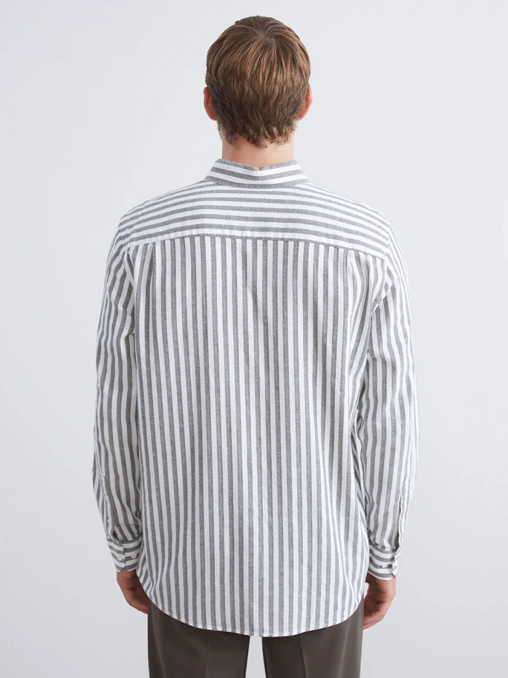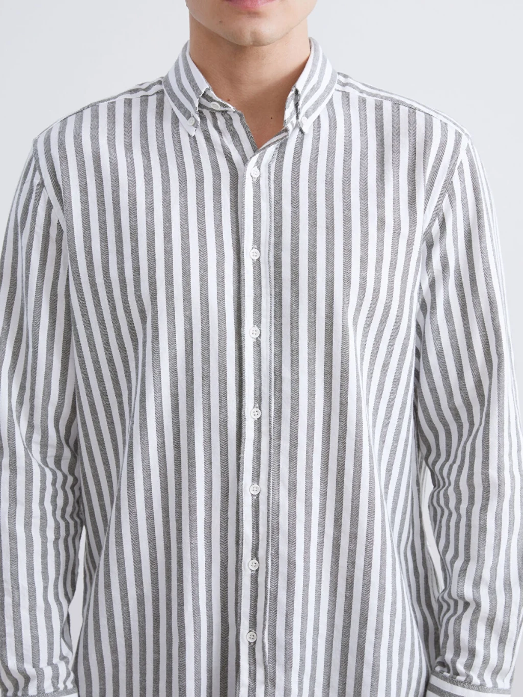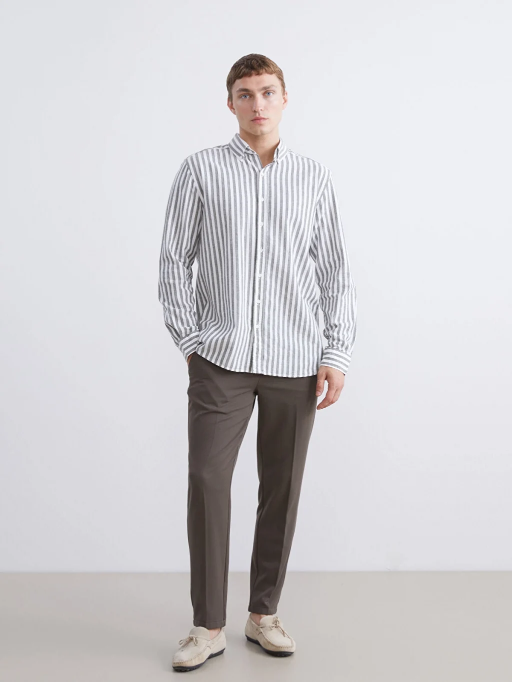 Keten görünümlü kumaştan üretilen dikey çizgili erkek gömlek, uzun kollu ve yaka uçları düğmeli gömlek yakalıdır. Önden düğme kapamalıdır.
