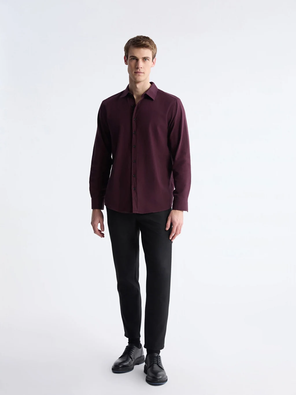 Flanel kumaştan üretilen, gömlek yakalı ve uzun kollu erkek gömlek, önden düğme kapamalı bir tasarıma sahiptir.