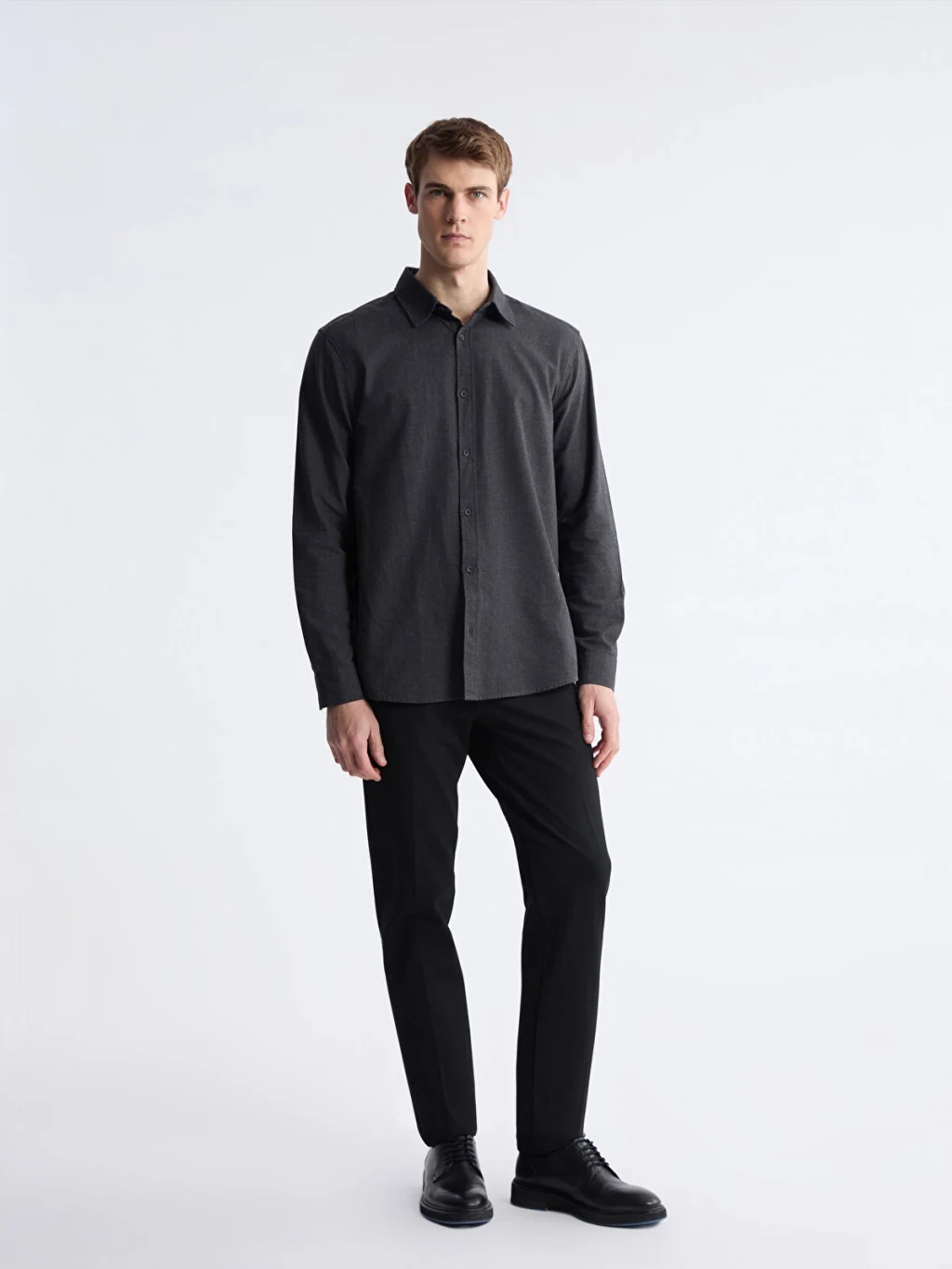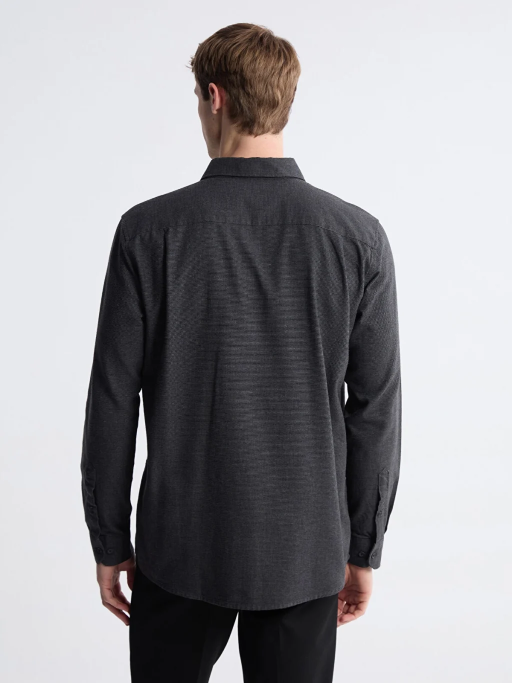 Flanel kumaştan üretilen, gömlek yakalı ve uzun kollu erkek gömlek, önden düğme kapamalı bir tasarıma sahiptir.