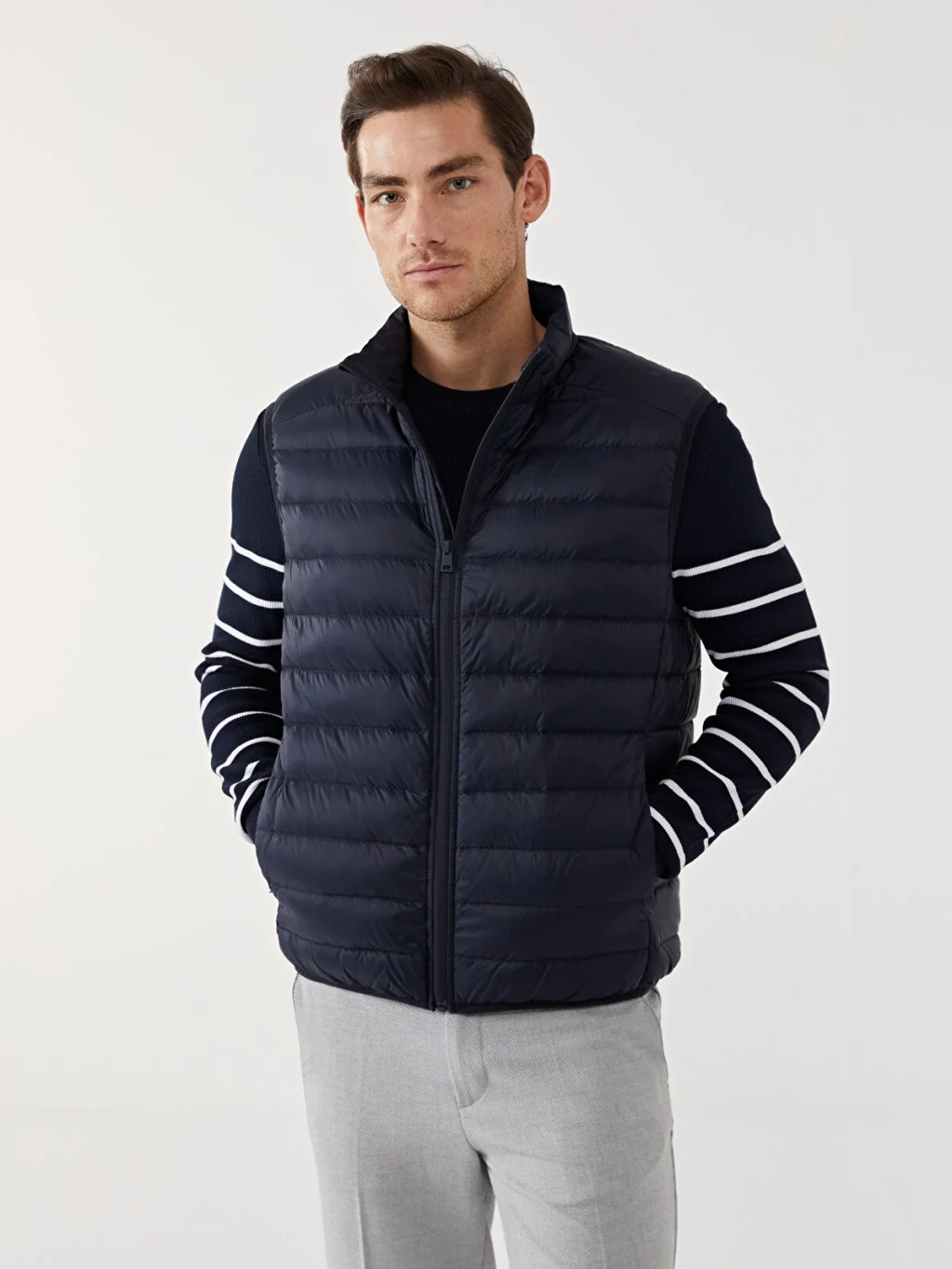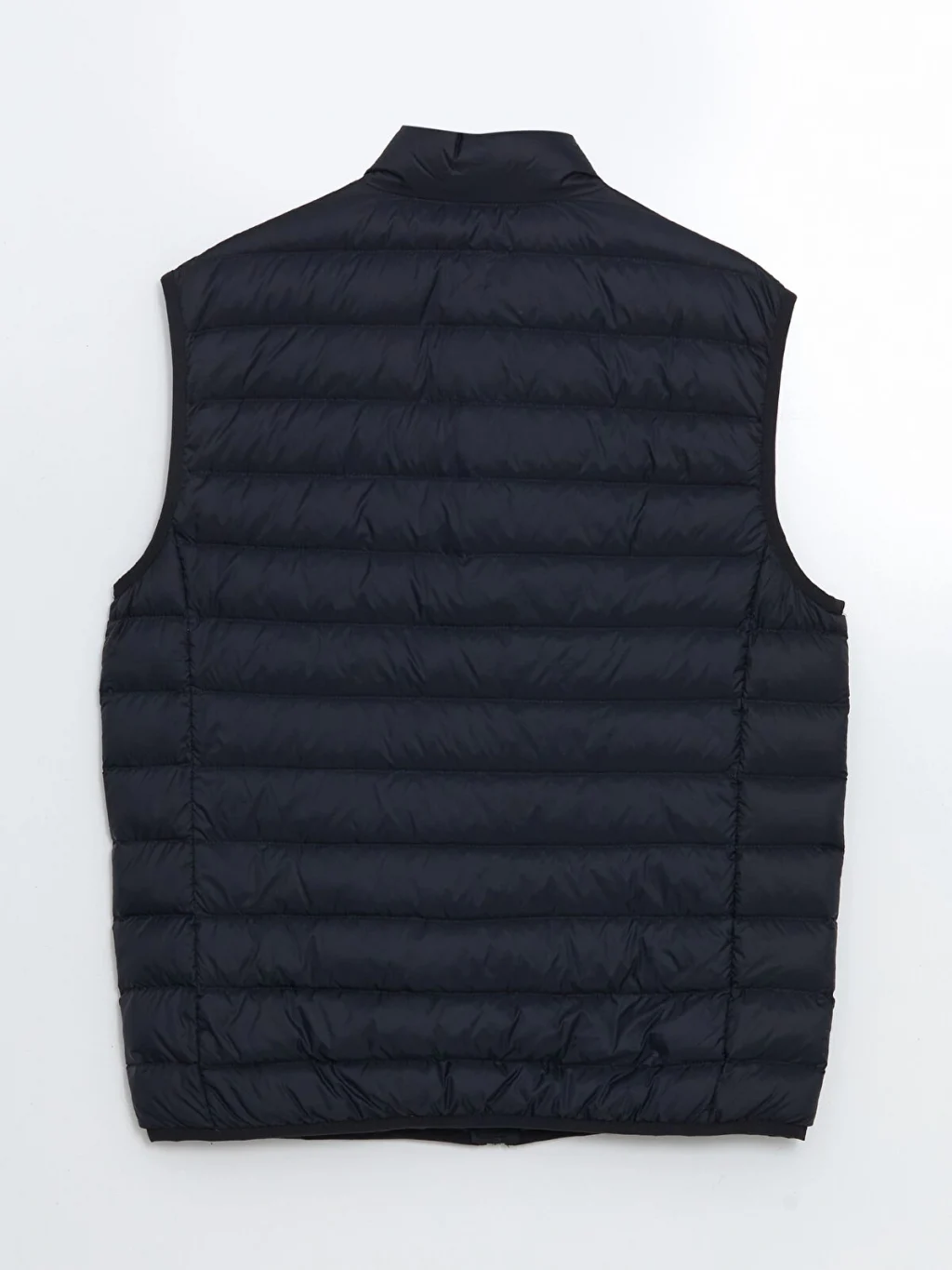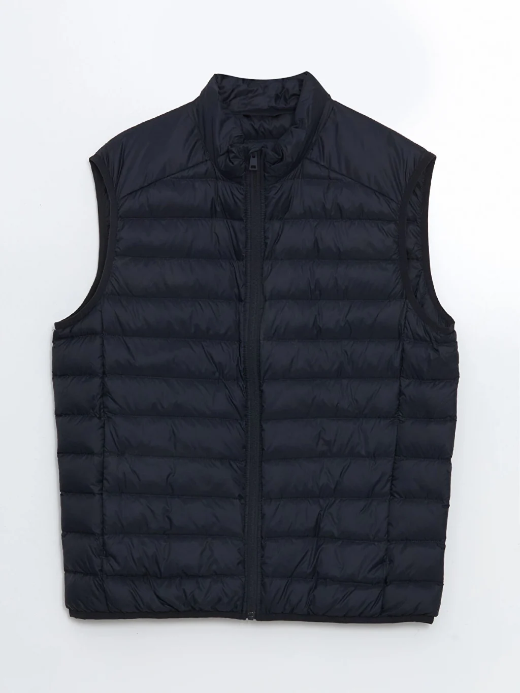 Dik yakalı ve kolsuz erkek şişme yelek, önden fermuar kapamalıdır ve kapitone desenli bir tasarıma sahiptir.