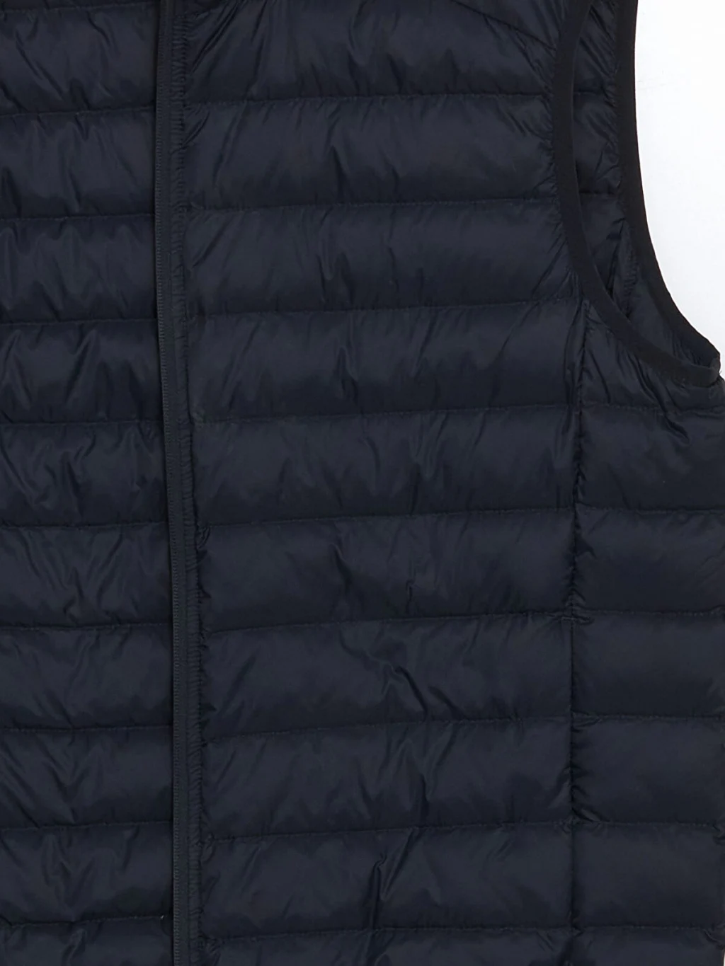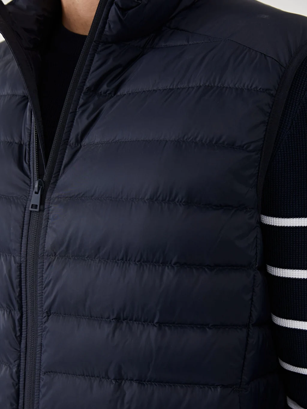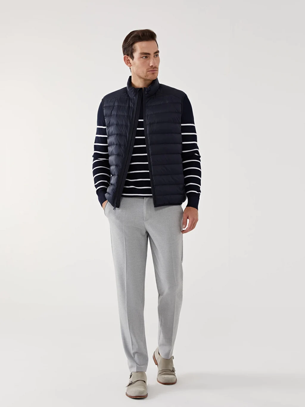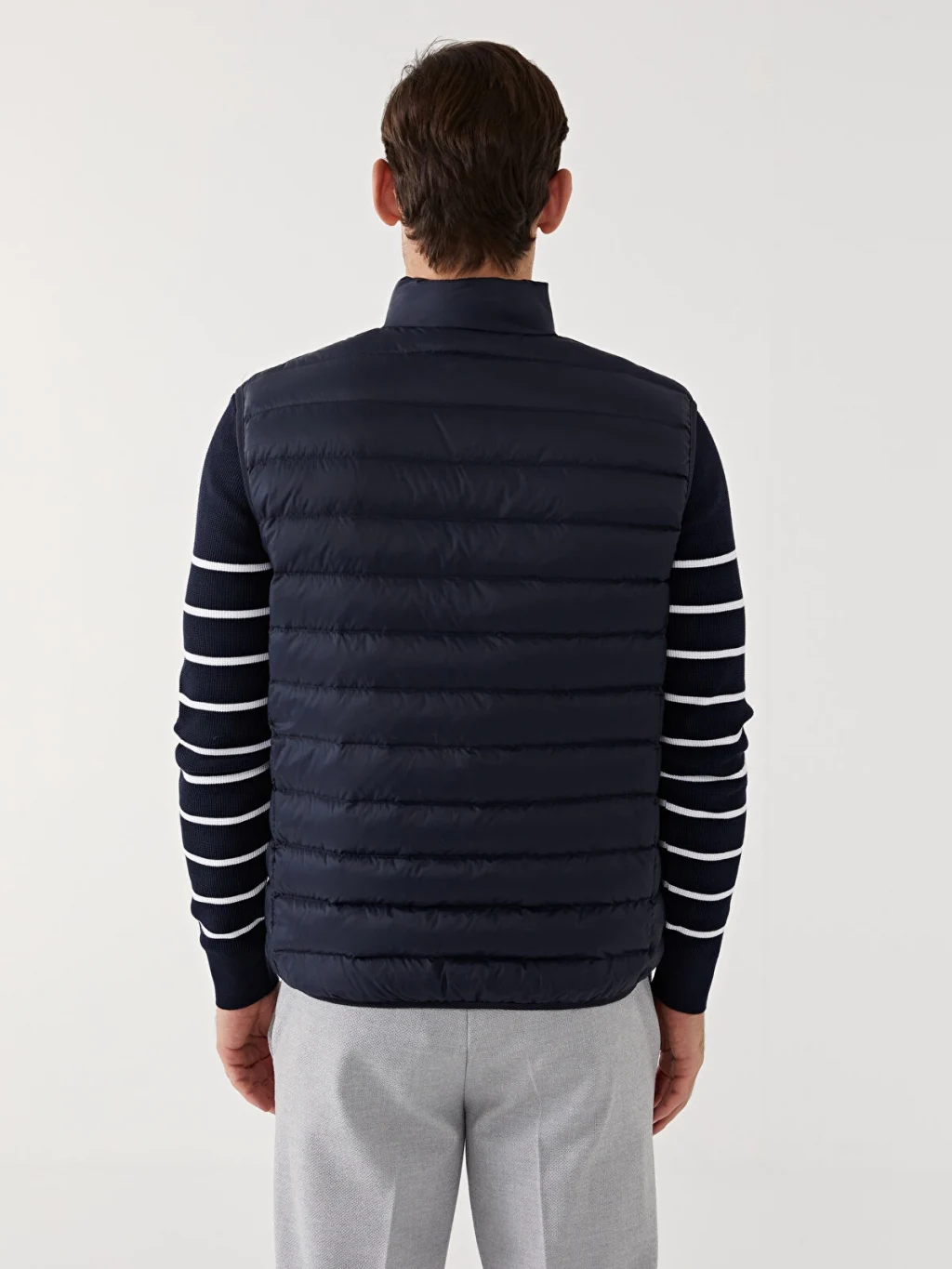 Dik yakalı ve kolsuz erkek şişme yelek, önden fermuar kapamalıdır ve kapitone desenli bir tasarıma sahiptir.
