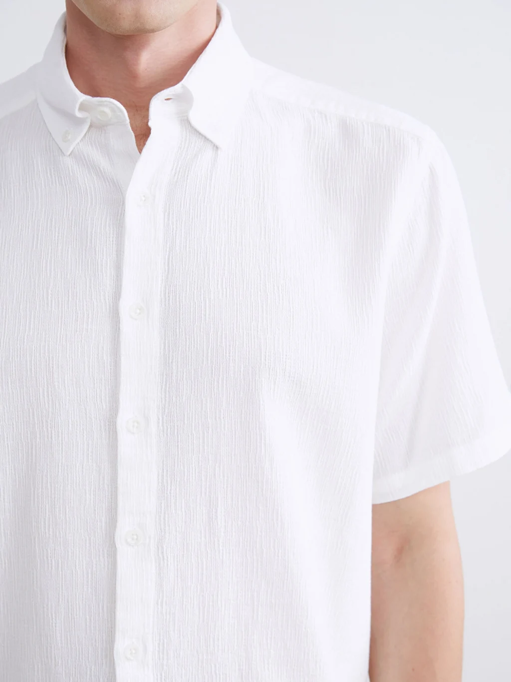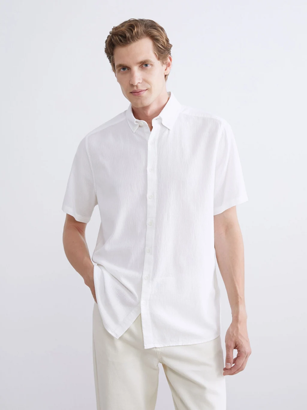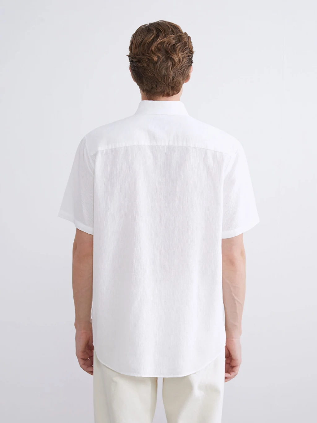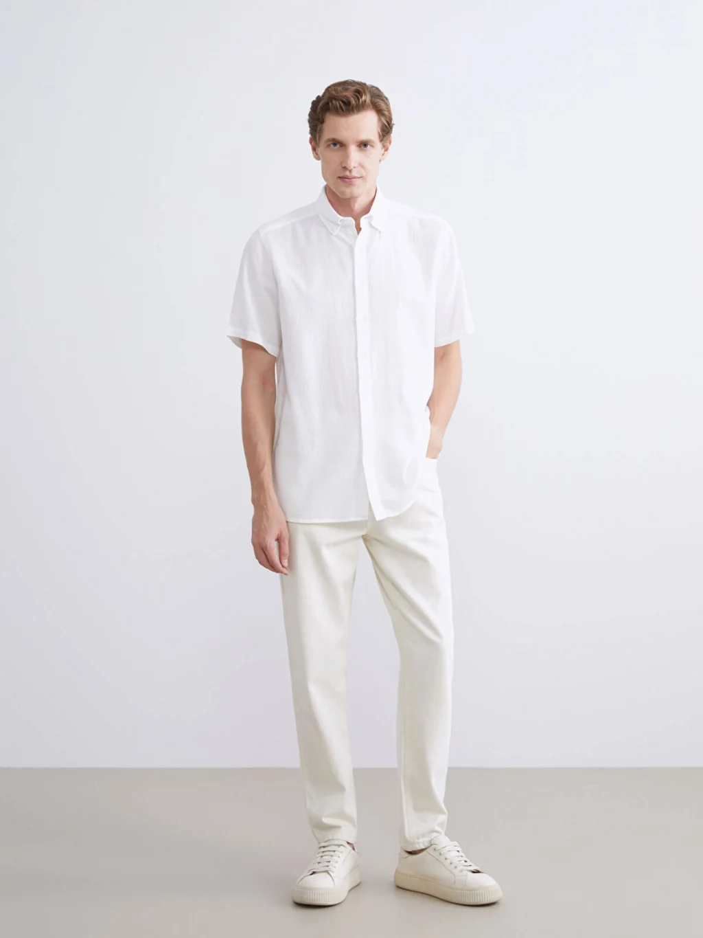 Regular fit kesime sahip erkek gömlek, kısa kollu olarak tasarlanmış olup armürlü dokulu kumaştan üretilmiştir.