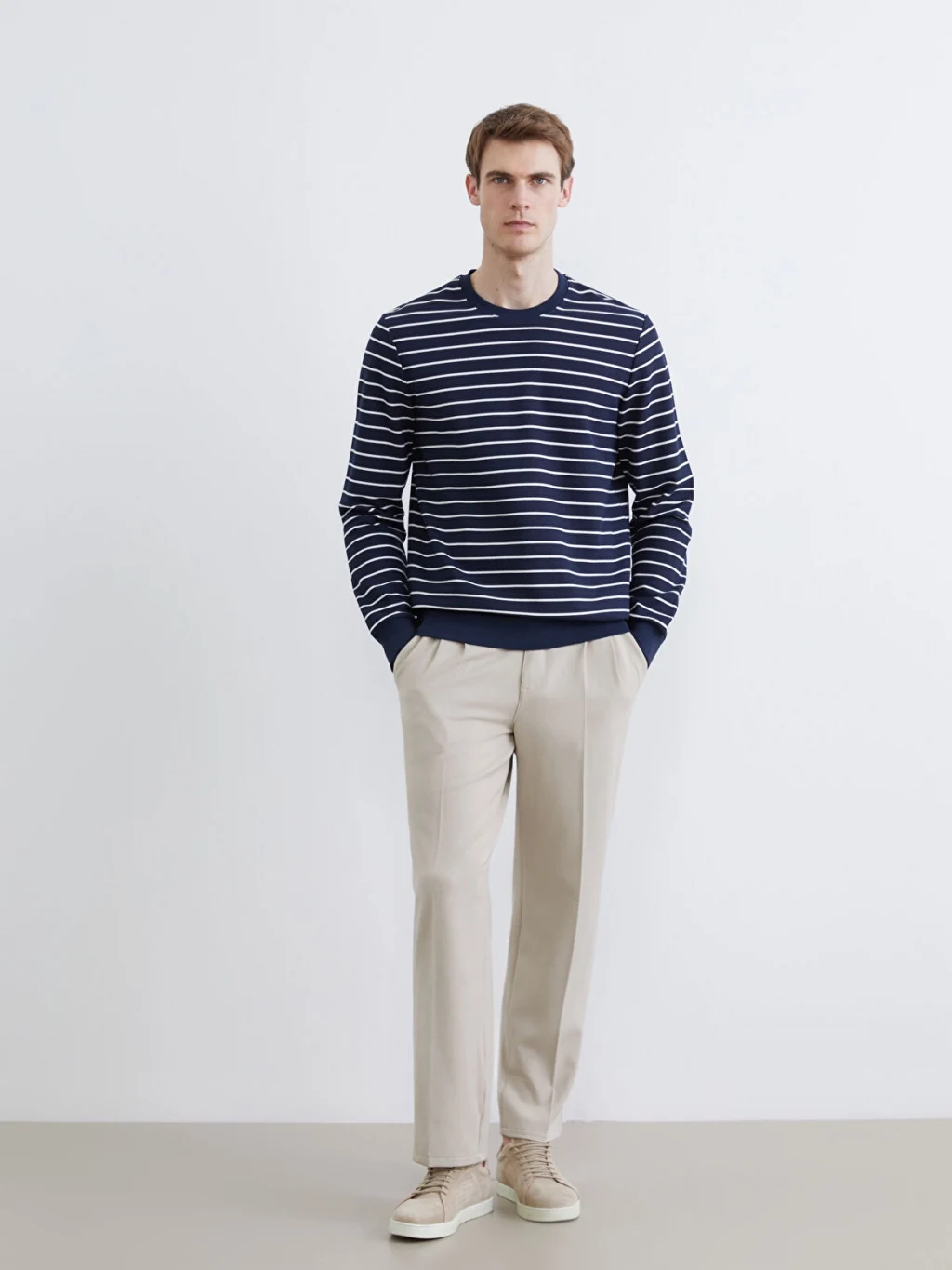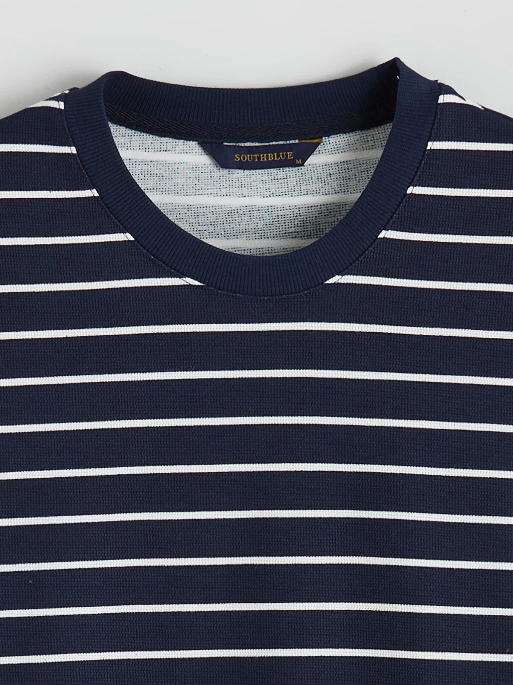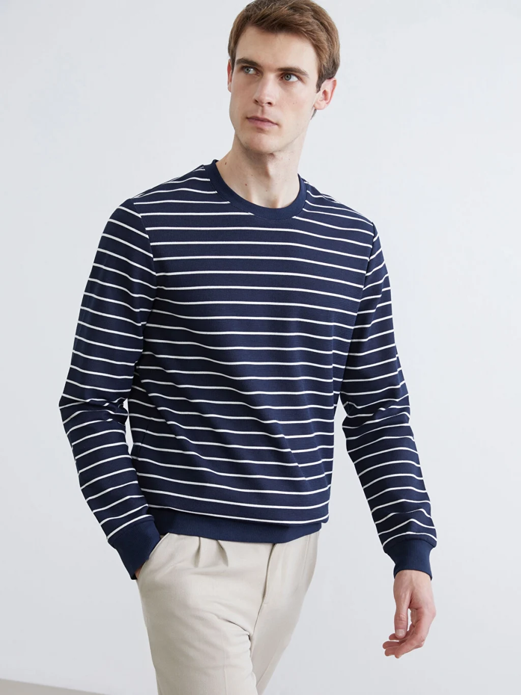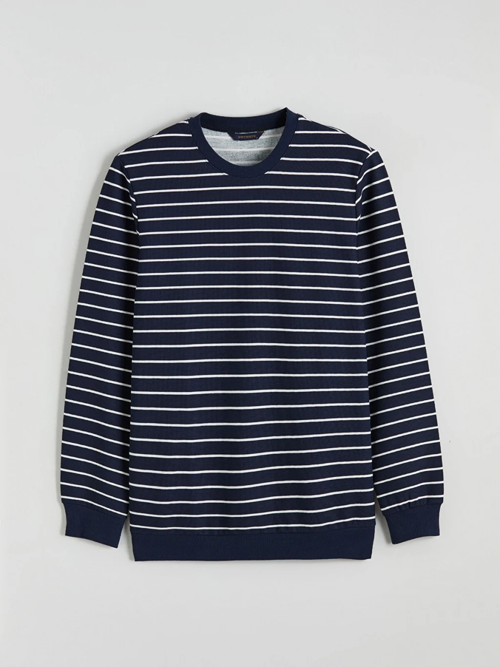 Yüksek pamuk içerikli kumaştan üretilmiş erkek sweatshirt, bisiklet yaka ve uzun kolludur. Çizgili desene sahip ürünün kol ve etek uçları ribanalıdır.