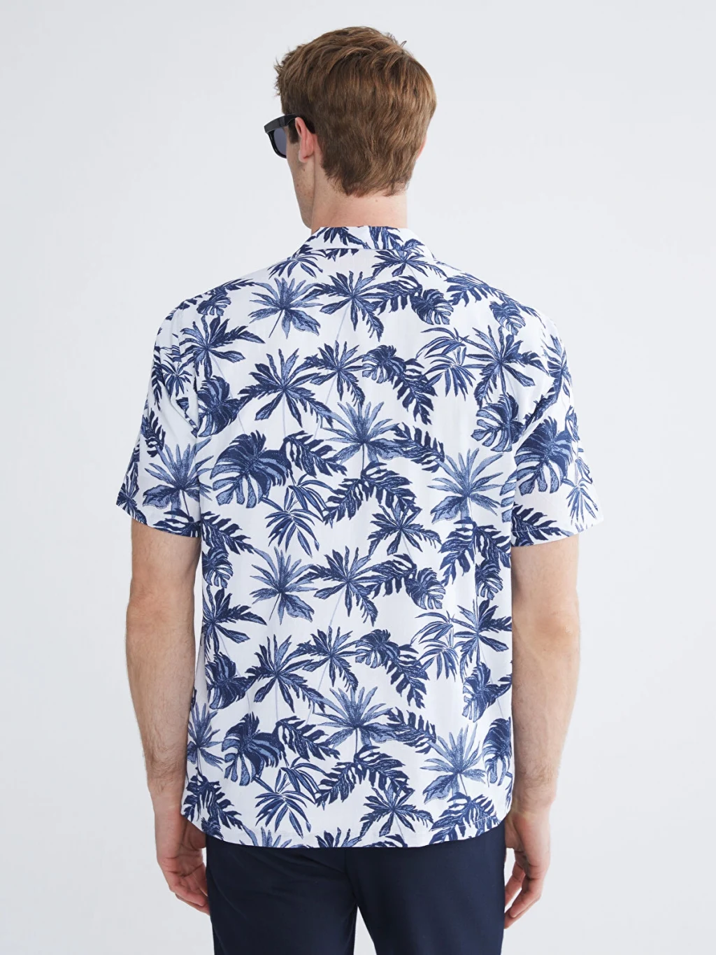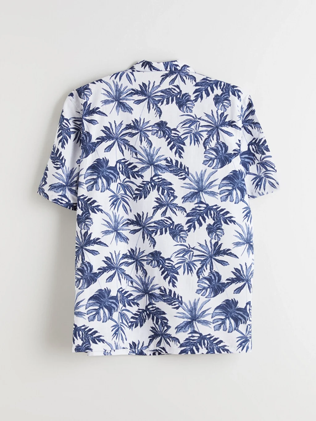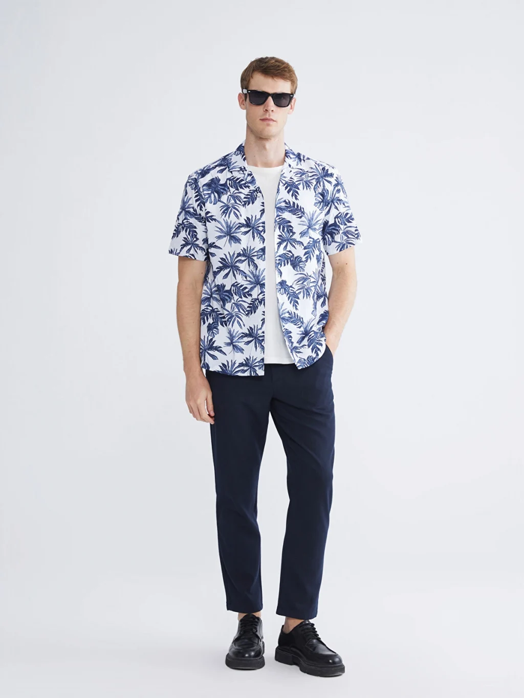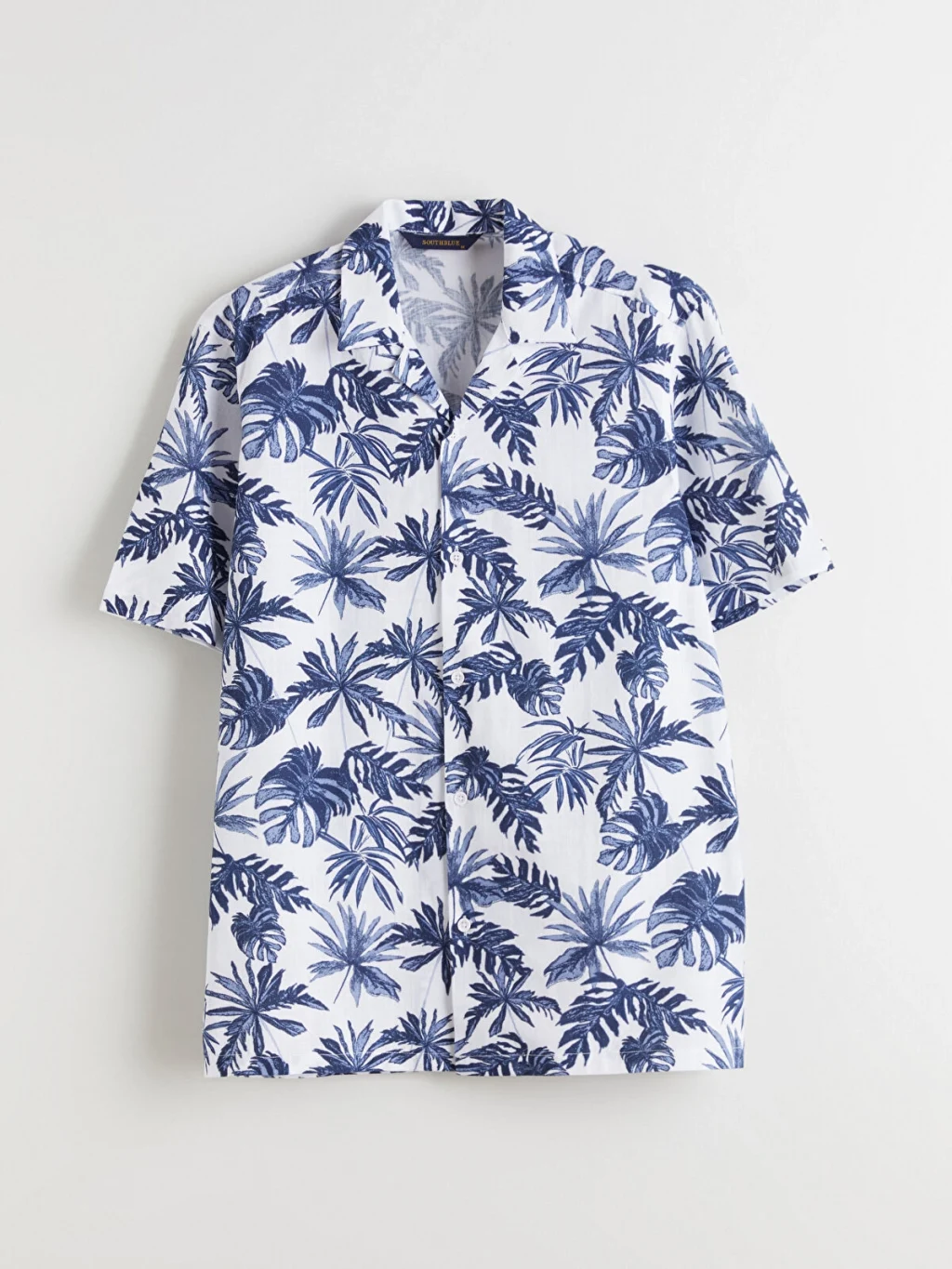 Yaprak desenli, apaş yakalı ve kısa kollu erkek gömlek, %100 pamuklu kumaştan üretilmiştir ve önden düğme kapamalıdır.