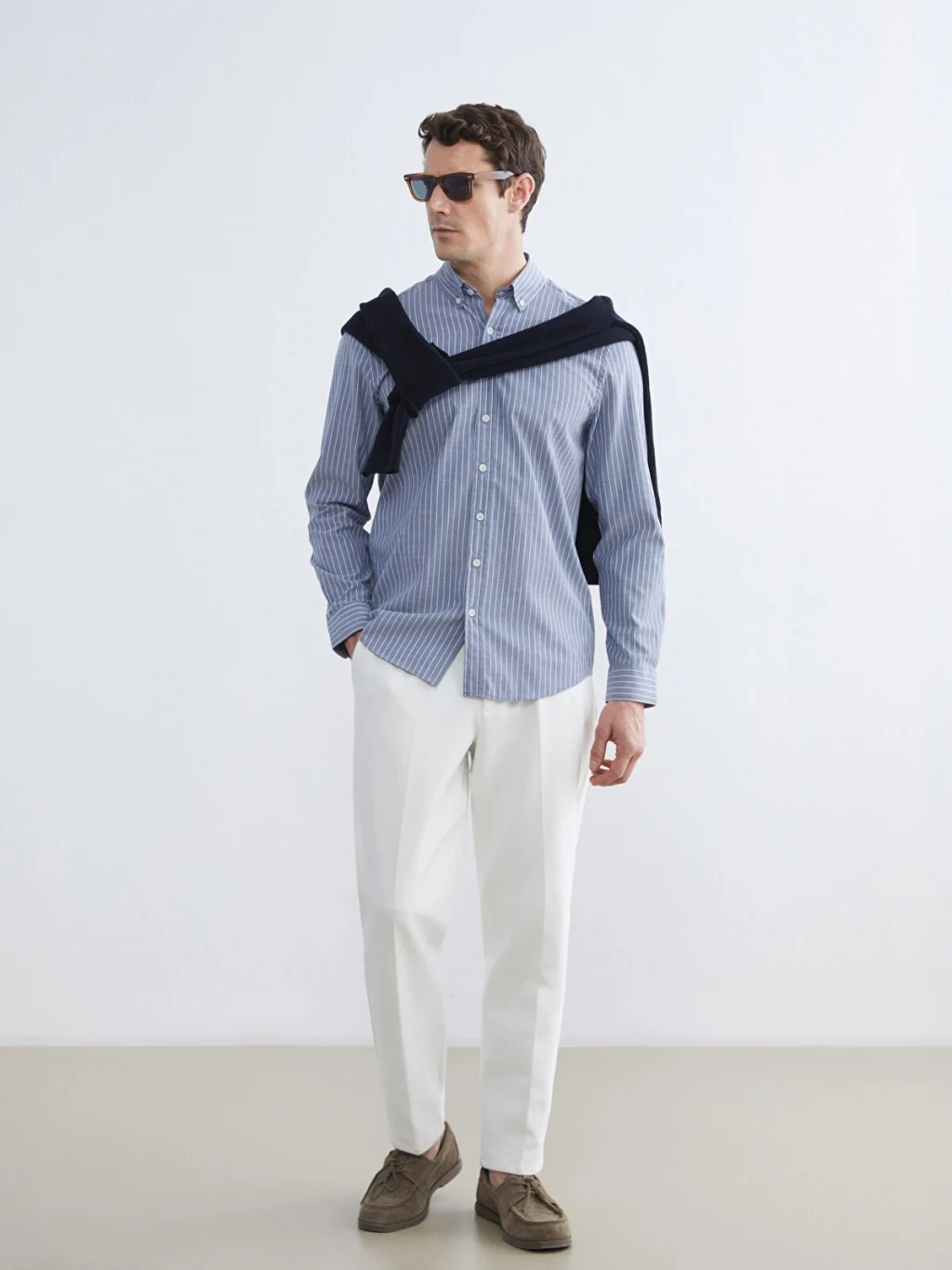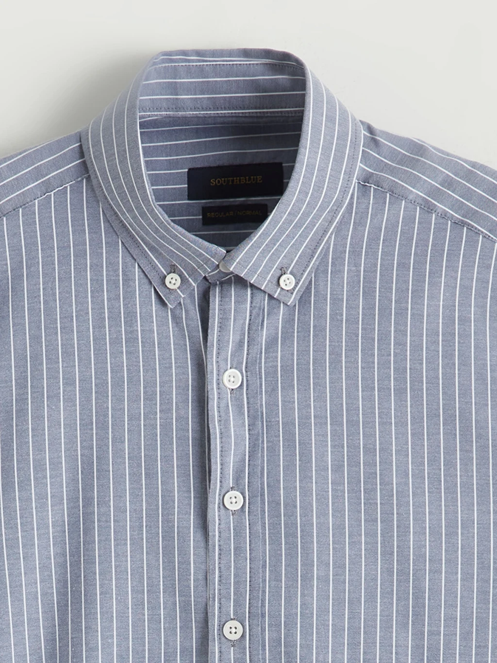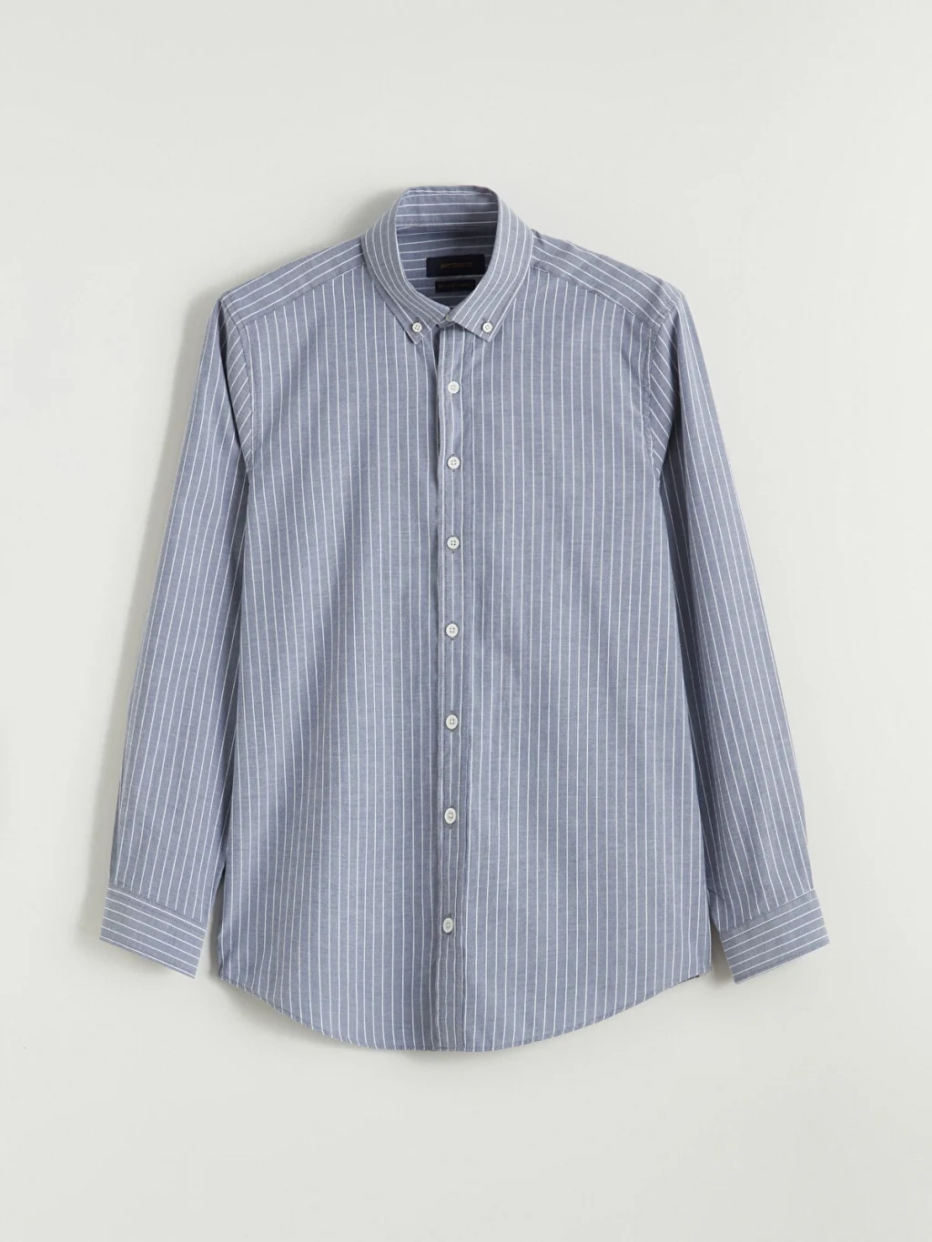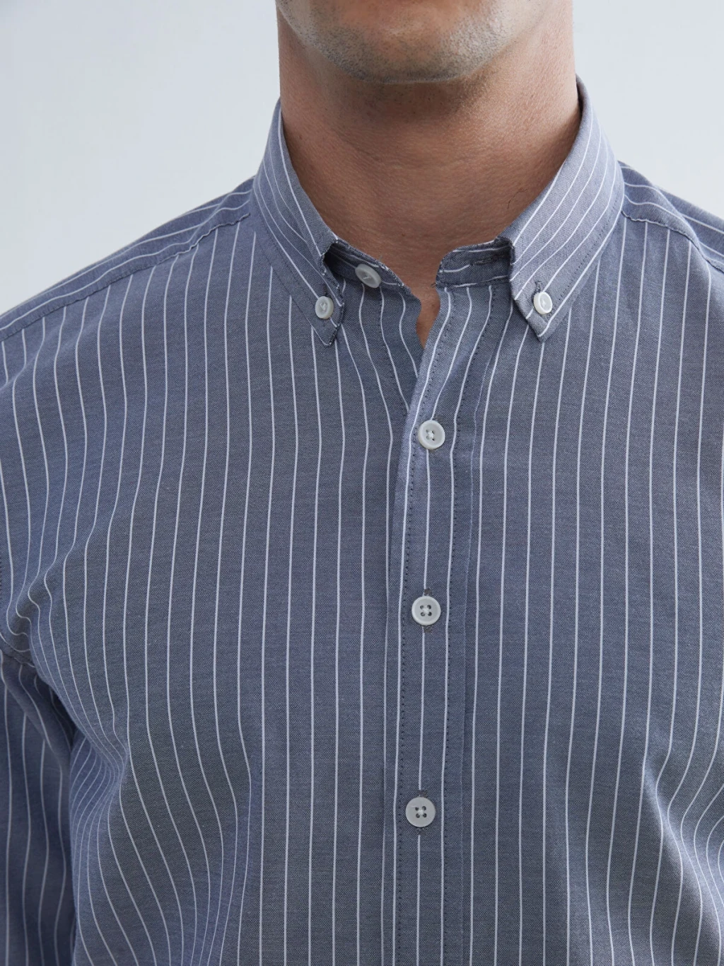 Uzun kollu, çizgili desenli erkek gömlek, yaka uçları düğmelidir ve önden düğme kapamalıdır. Manşetleri düğmelidir.