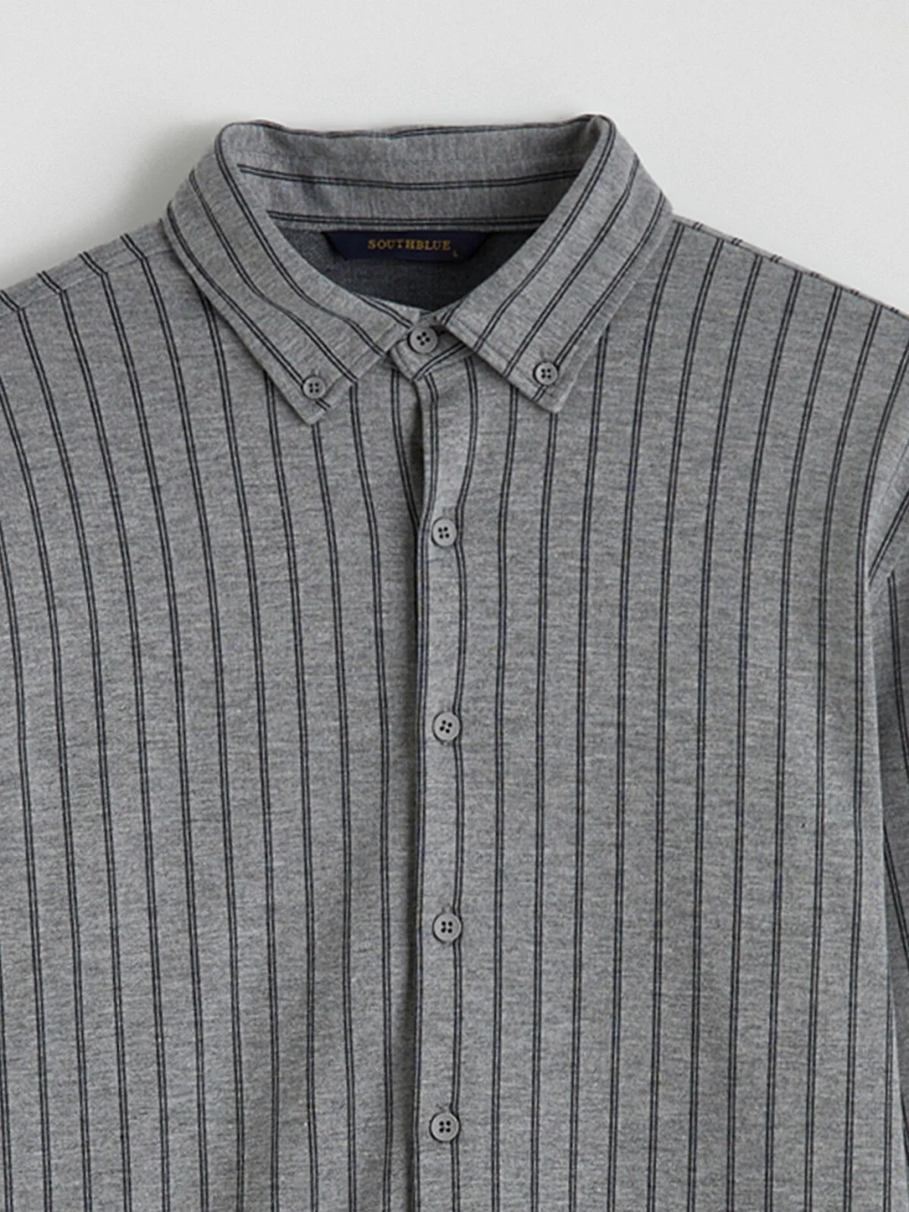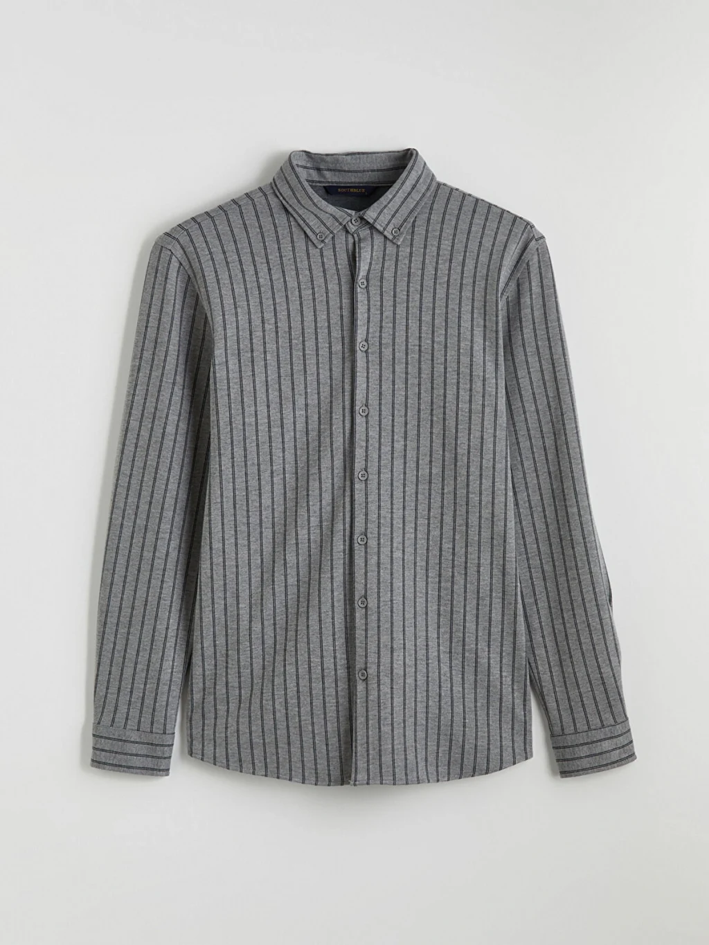 Çizgili desenli, uzun kollu erkek gömlek, önden tam boy düğme kapamalıdır ve manşetleri düğmelidir.