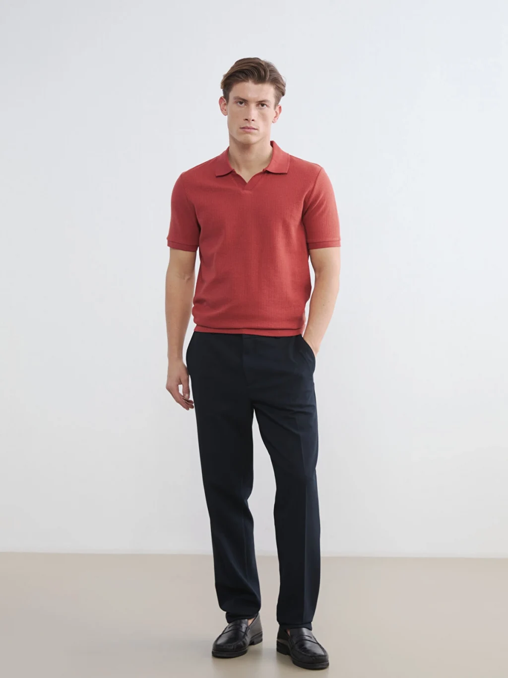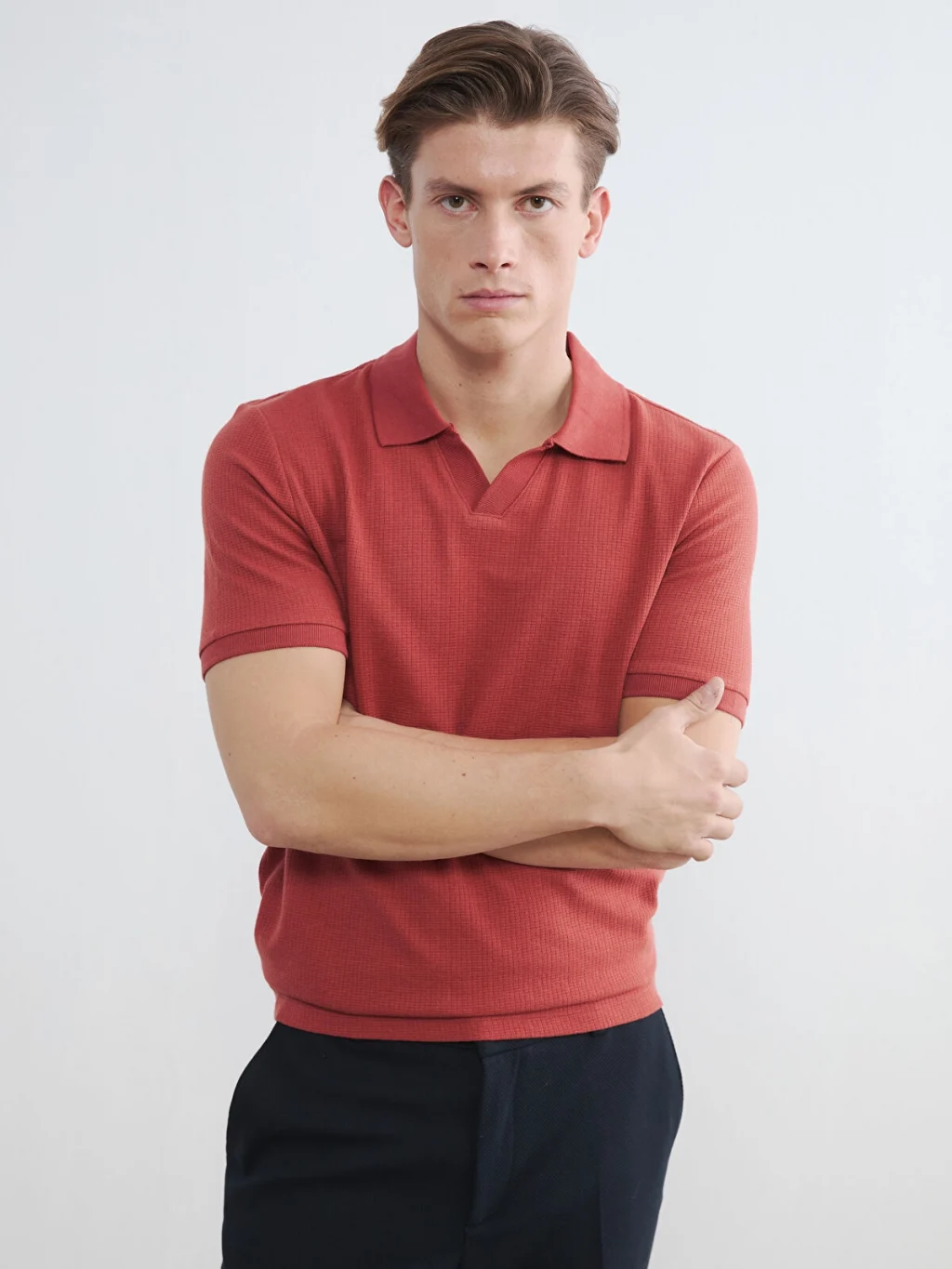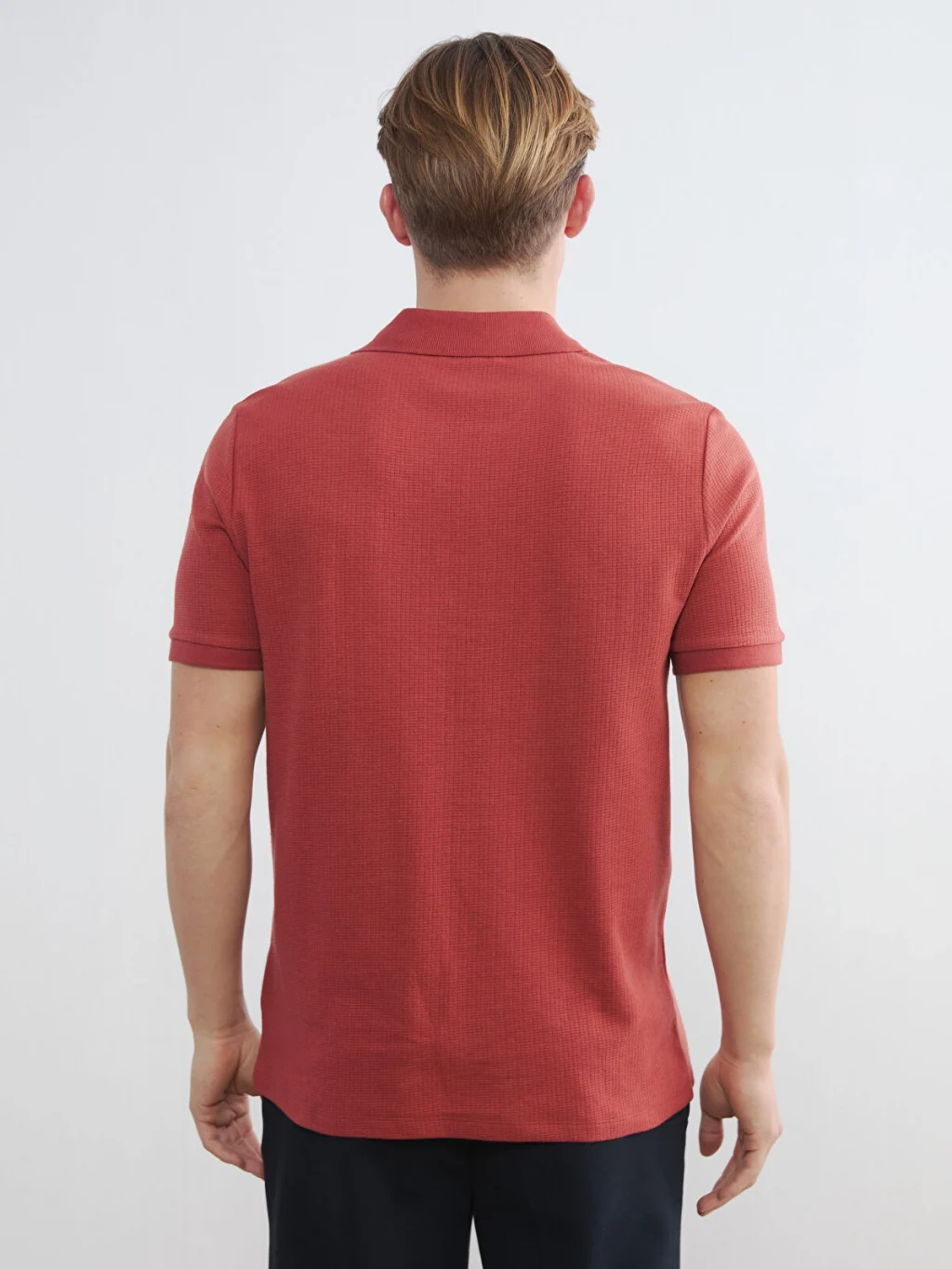 Standart kalıplı, polo yakalı ve kısa kollu erkek tişört, strüktürlü kumaştan üretilmiştir ve %100 Pamuk içeriğe sahiptir.
