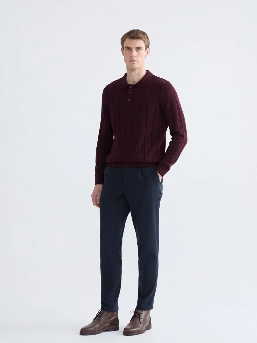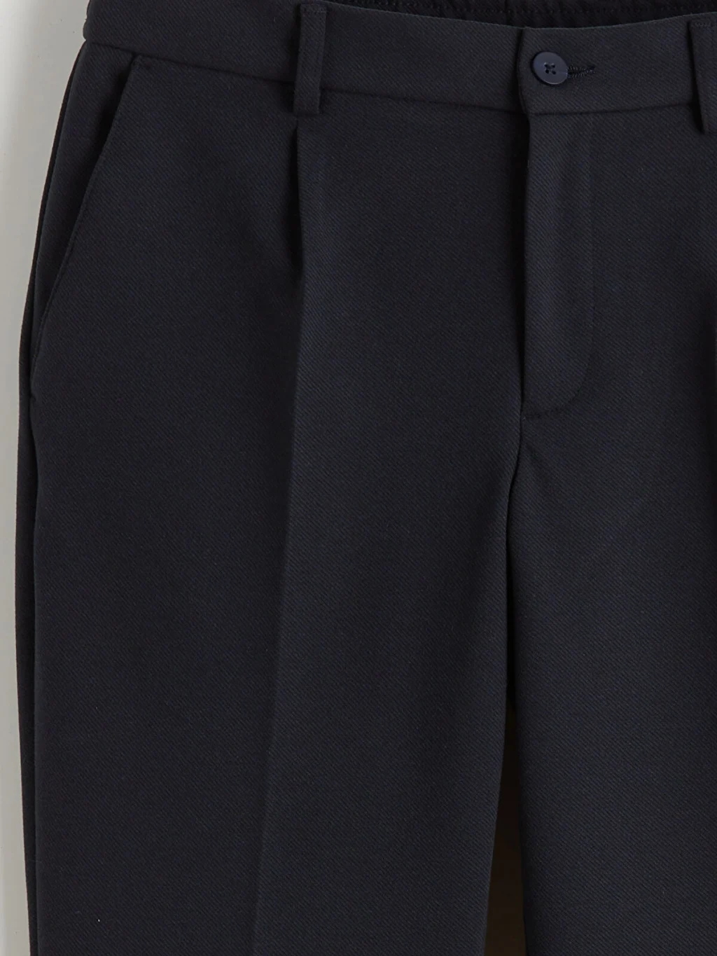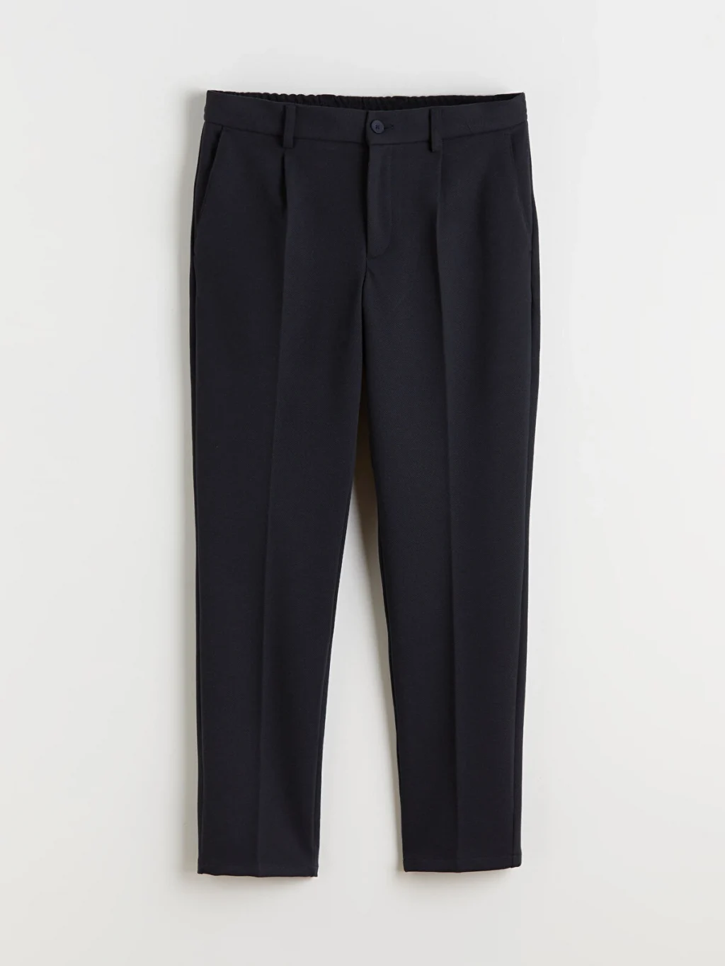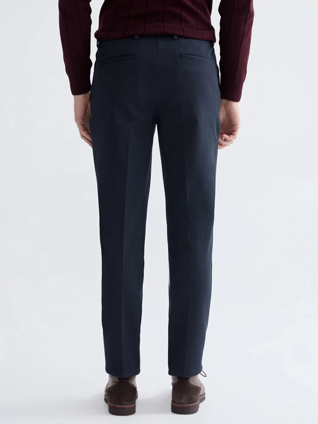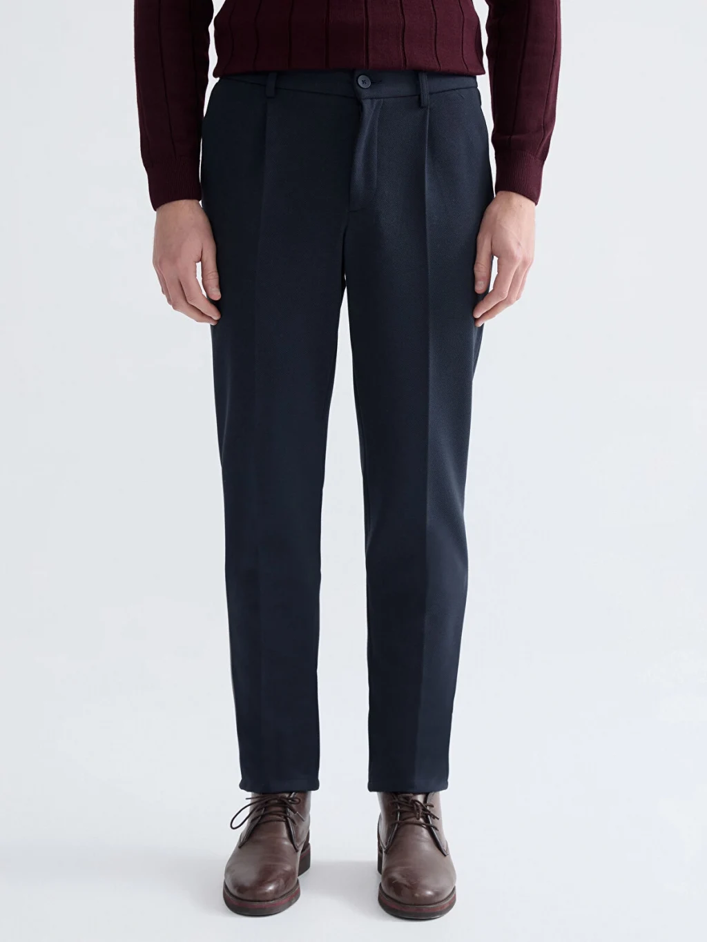 Normal bel, düz paça kesimli erkek pantolon, gabardin kumaştan üretilmiştir. Beli lastikli, düğme kapamalı ve önü pililidir.