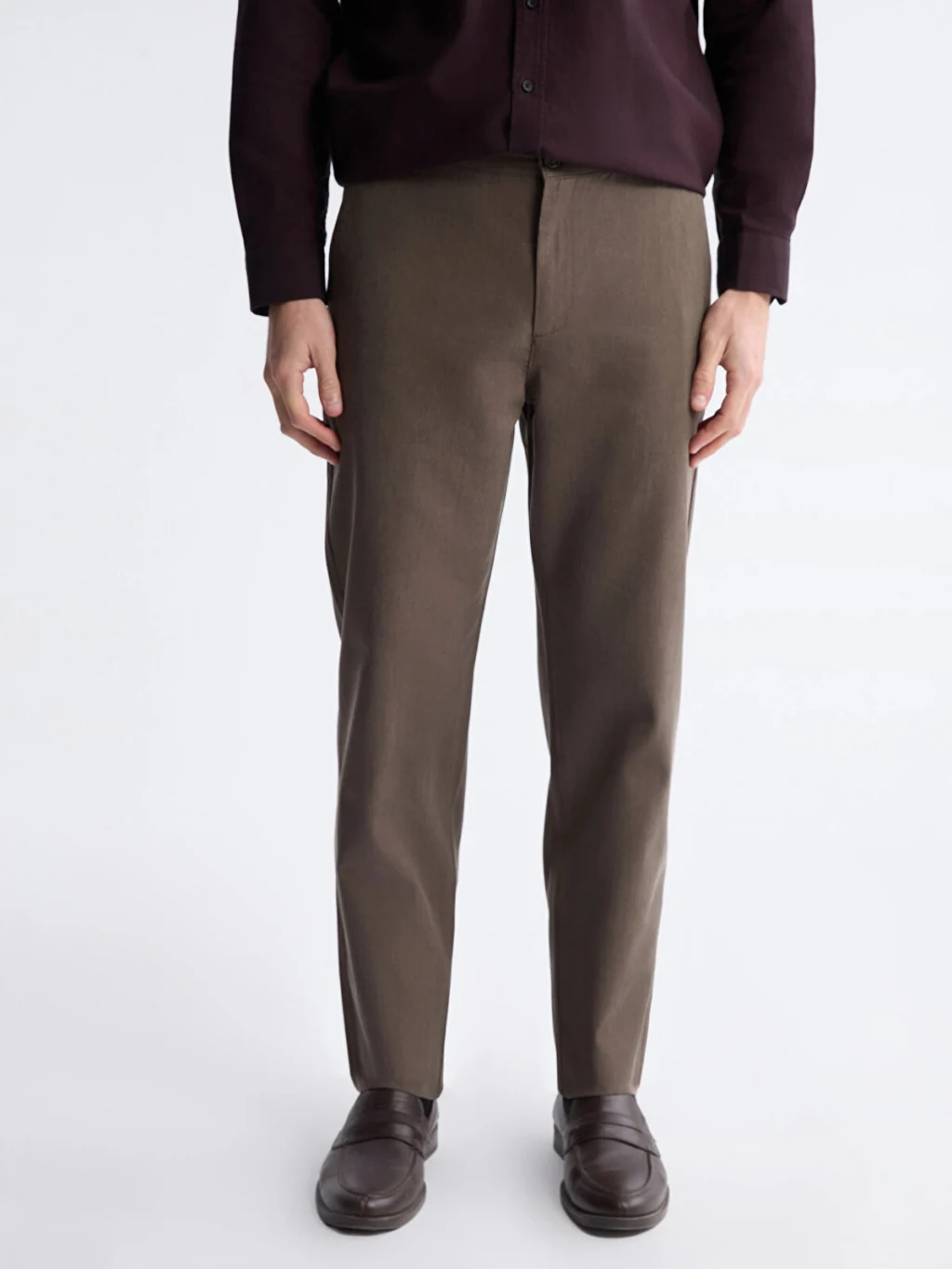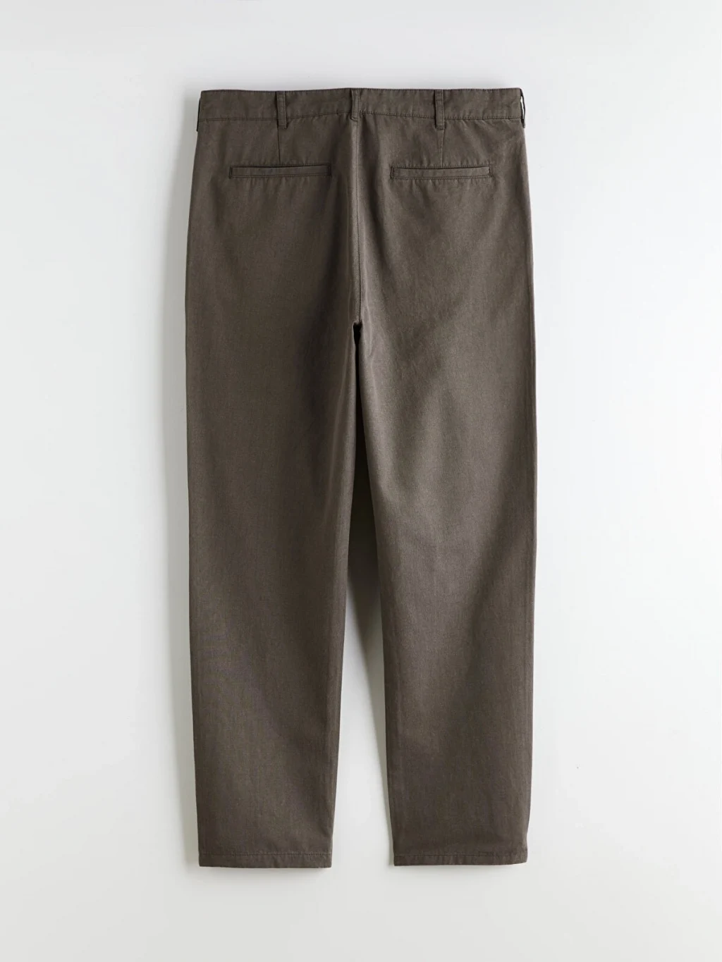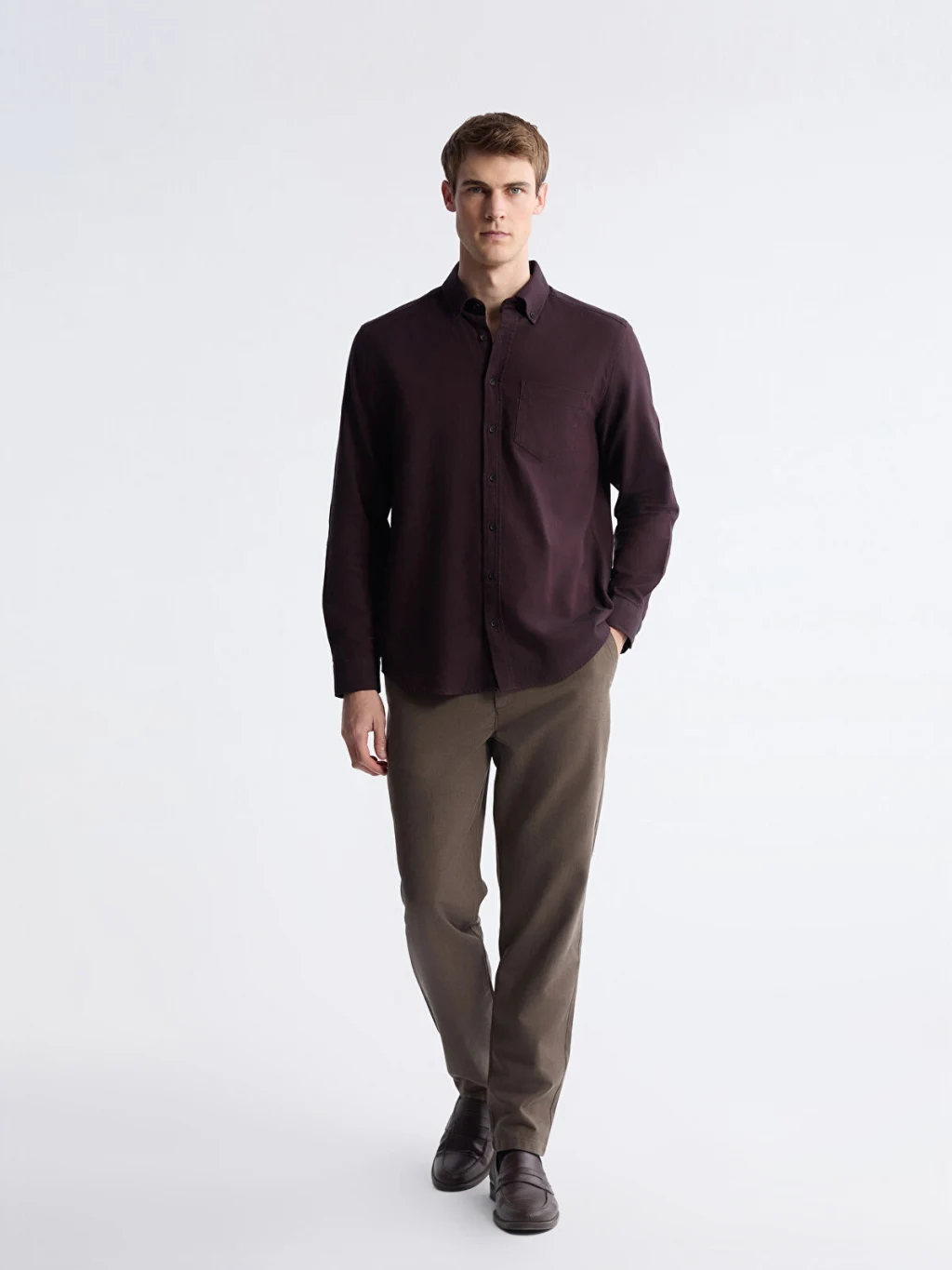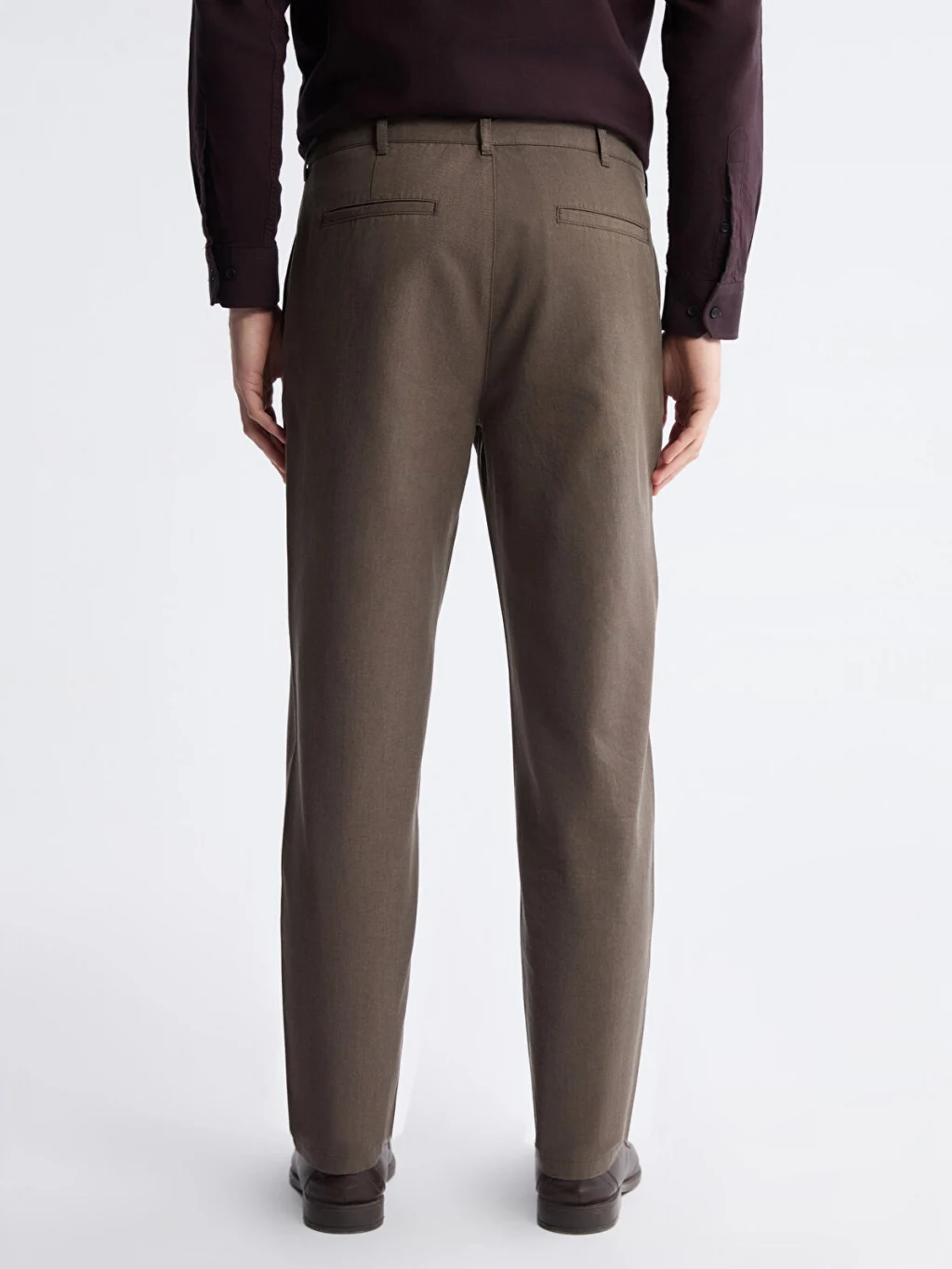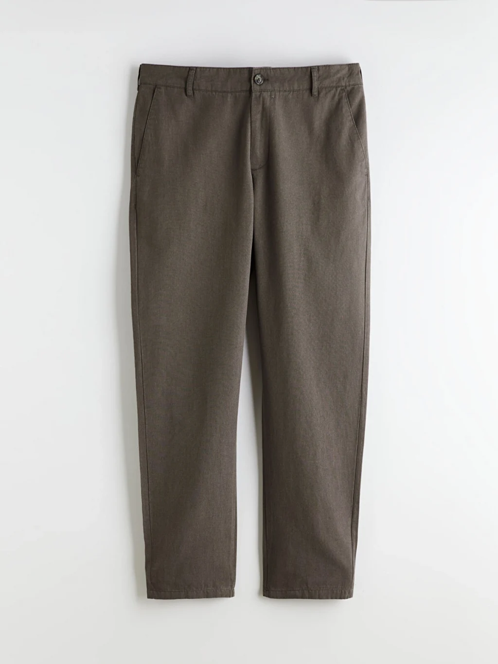 Standart kalıp, normal bel ve düz paça kesimli erkek pantolon. Fermuar ve düğme kapamalıdır, yan cepleri bulunur.