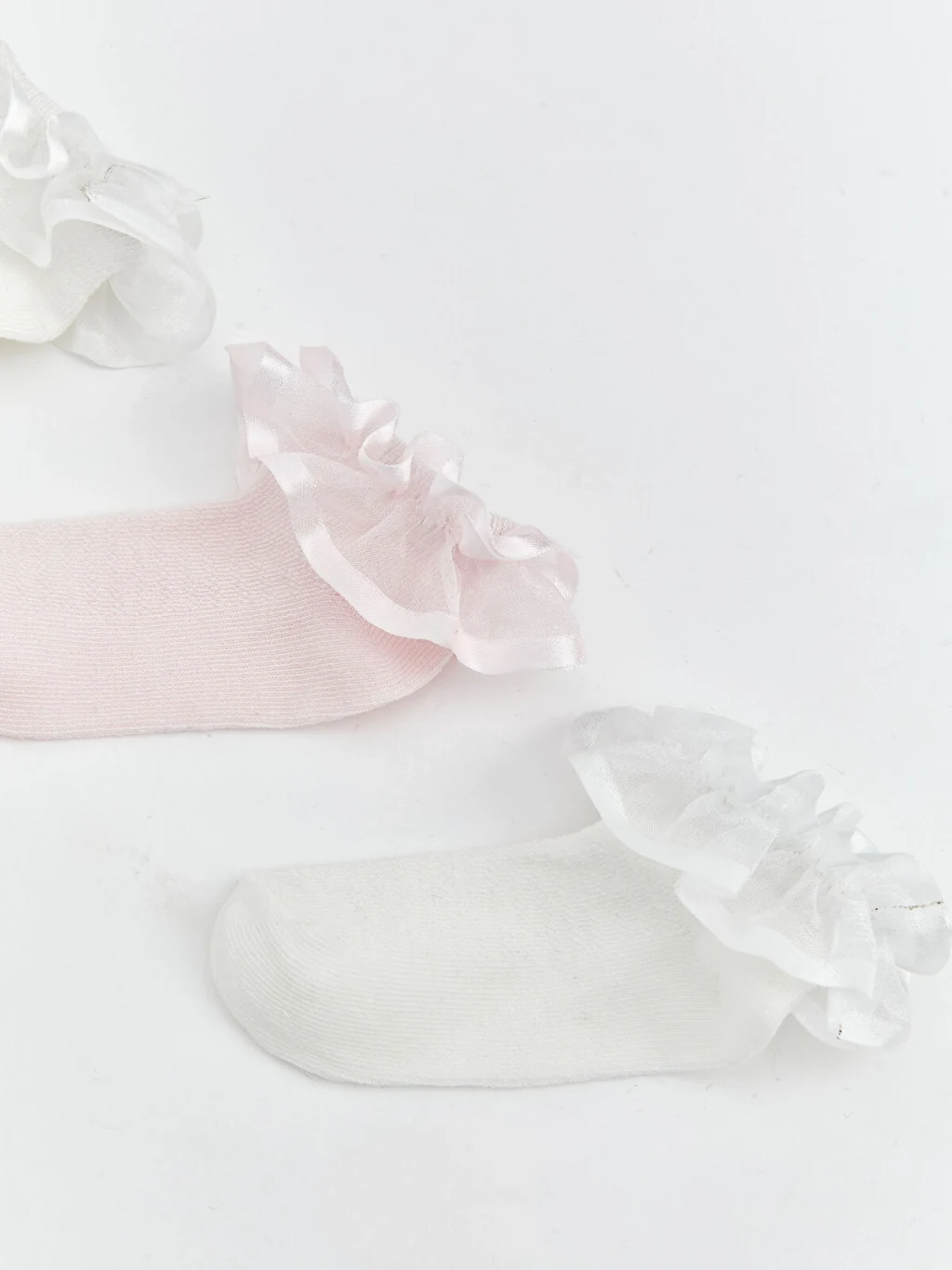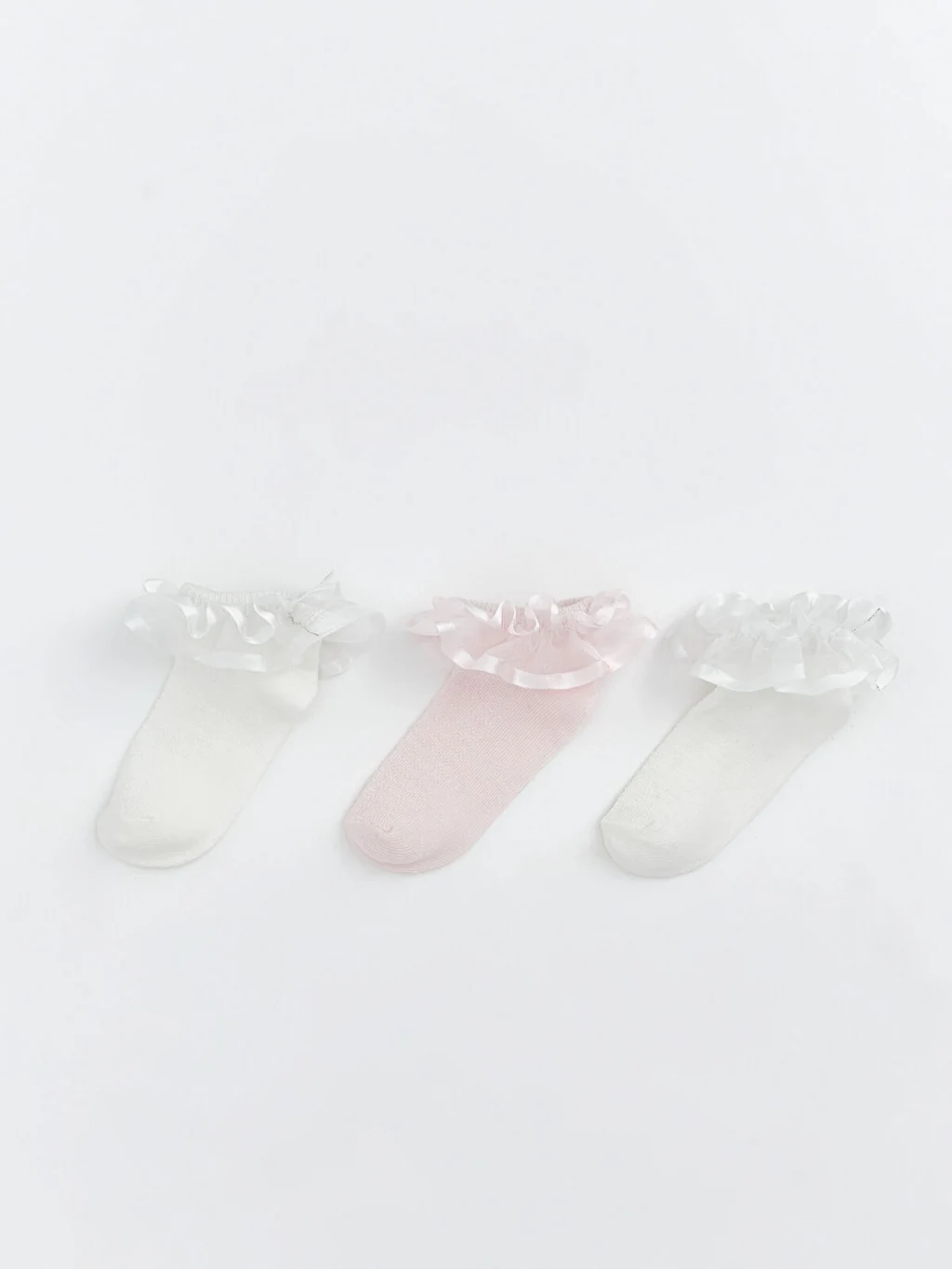 Bilekleri şerit detaylı ve fırfırlı olarak tasarlanmış kız bebek patik çorap, düz dokuma kumaştan üretilmiştir.