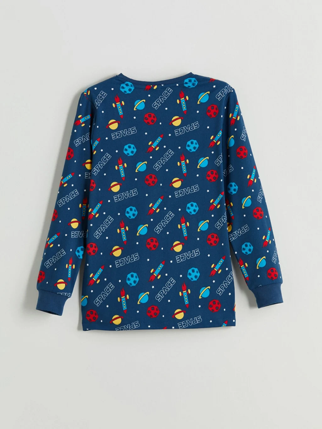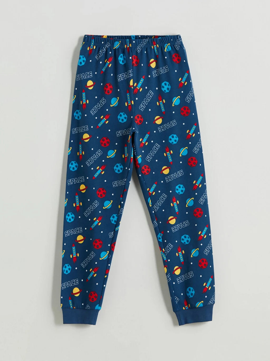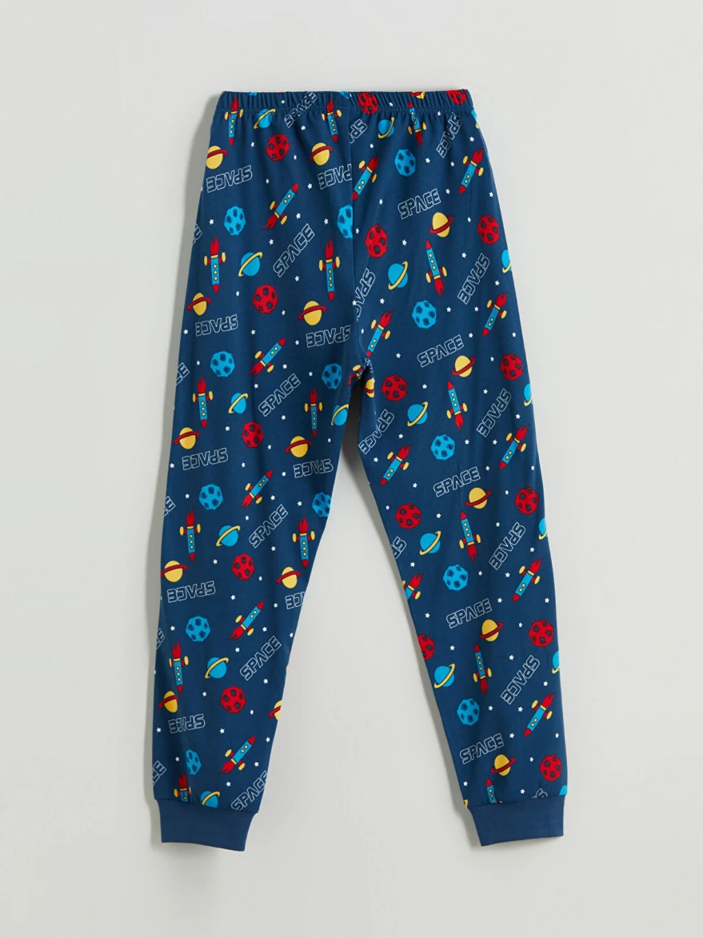Erkek çocuk pijama takımı, bisiklet yaka ve uzun kollu üst ile uzun alttan oluşur. Ürün, uzay temalı desenlidir ve kol ile paça uçları ribanalıdır. Polyester içerikli yumuşak dokulu kumaştan üretilmiştir.