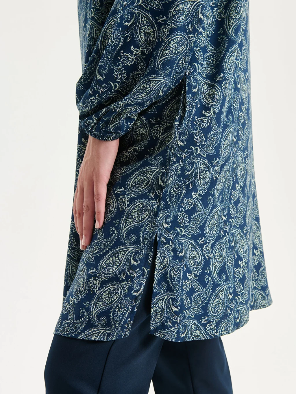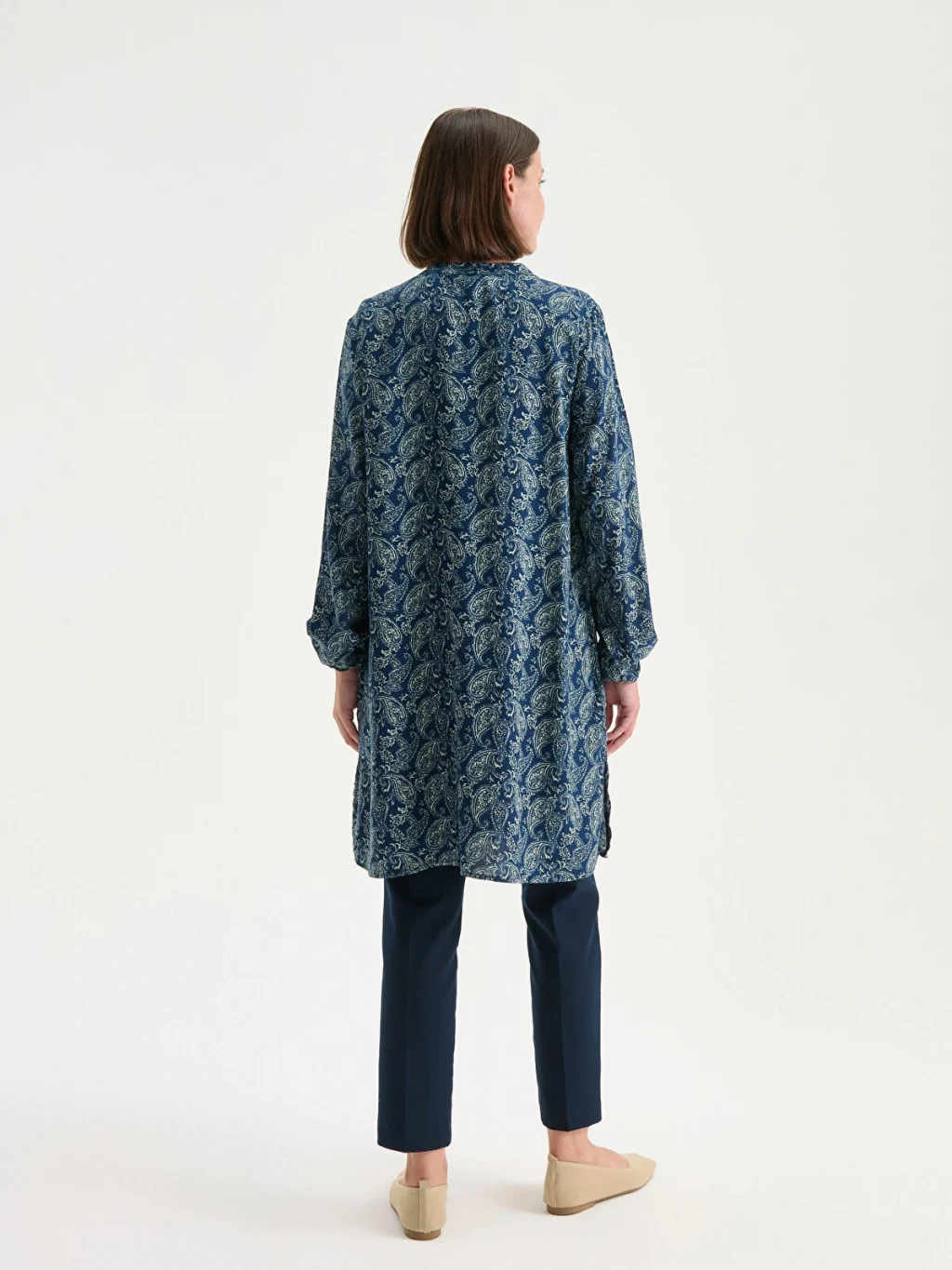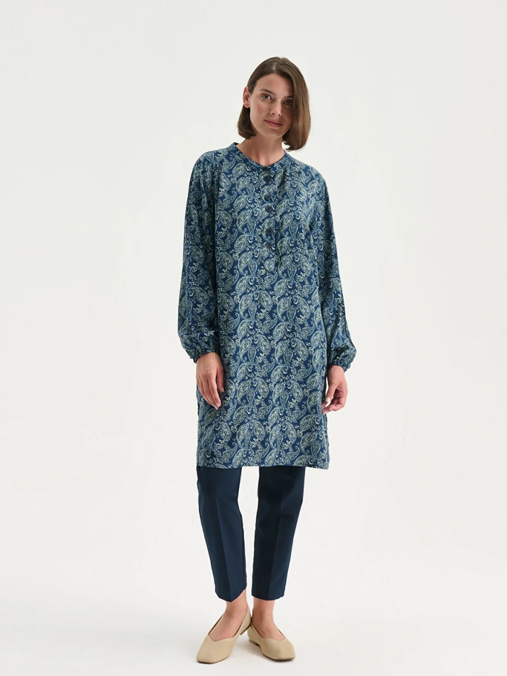 Desenli, hakim yaka ve uzun kollu kadın tunik, iki yandan yırtmaçlı, önden yarım patlı düğme kapamalıdır ve bilekleri lastiklidir.