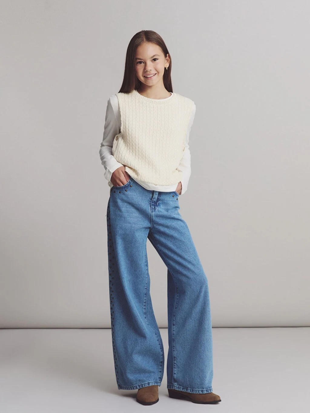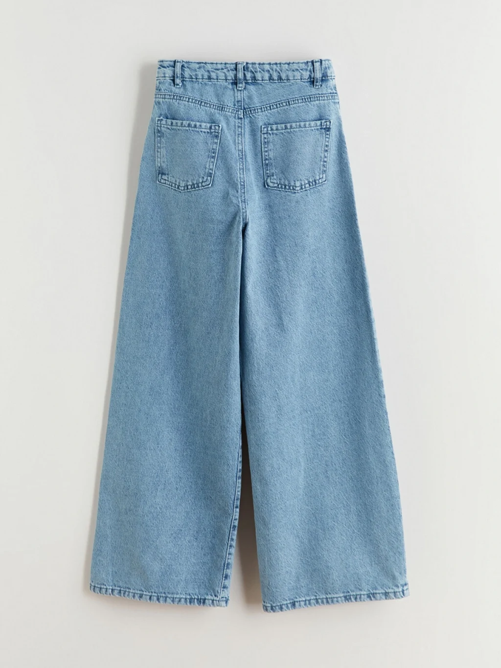 Wideleg kız çocuk denim pantolon, yüksek bel ve geniş paça kesime sahiptir. Beli içten ayarlanabilir lastiklidir.