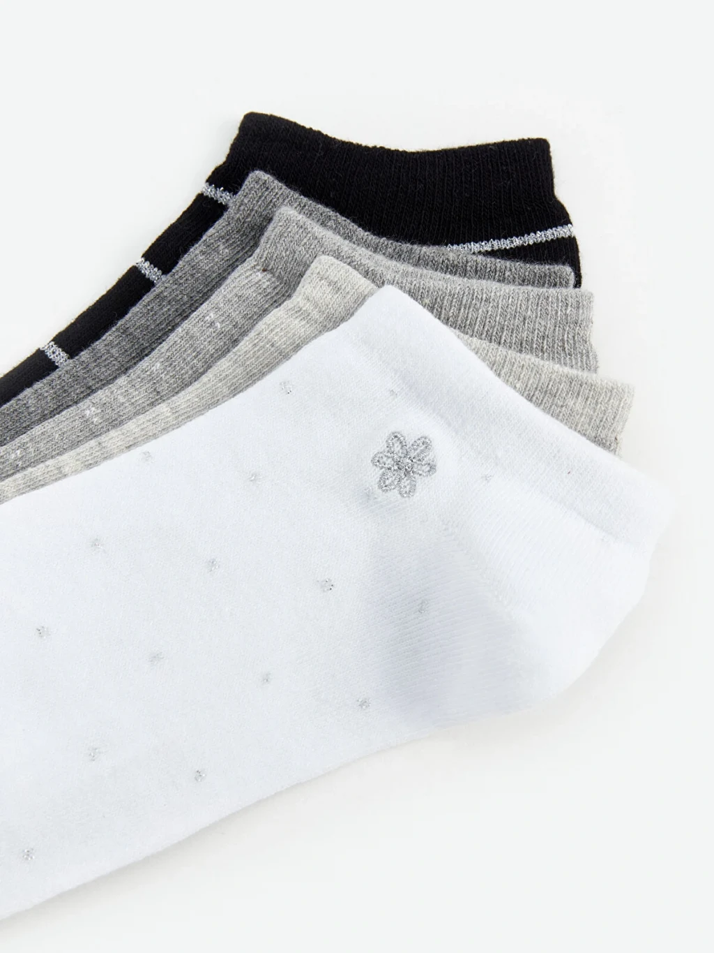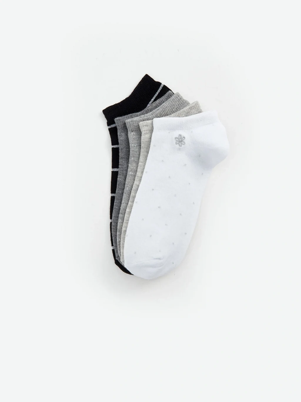 Pamuk karışımlı elyaftan üretilen patik çoraplar, yumuşak ve konforlu bir dokuya sahiptir. Desenli tasarımıyla şık bir görünüm sunar ve 5 çift patik çoraptan oluşmaktadır.