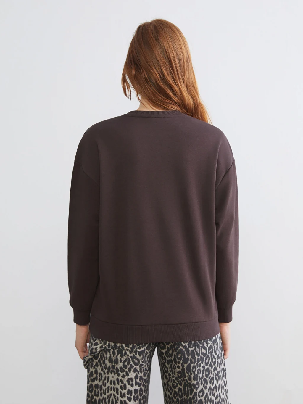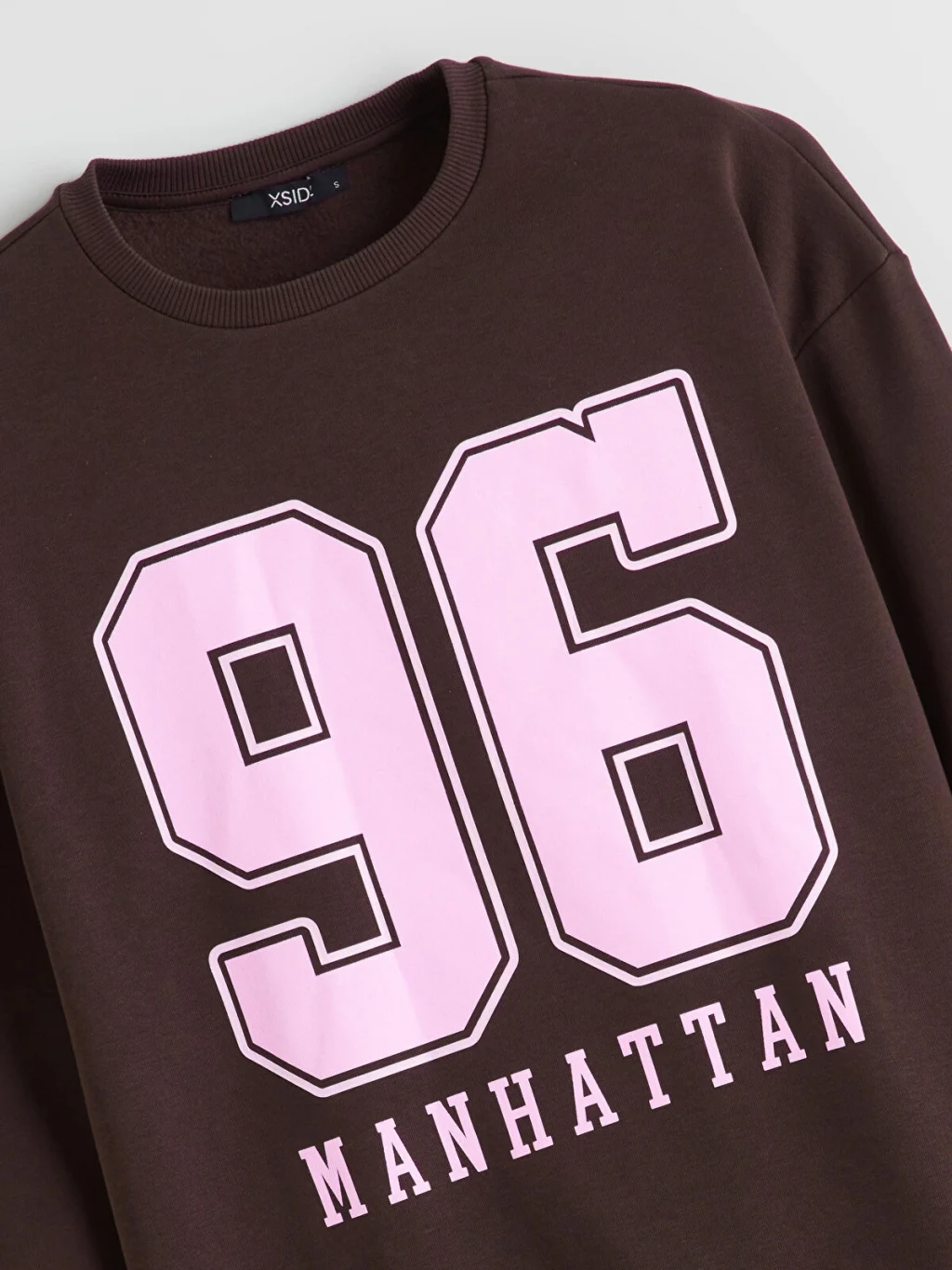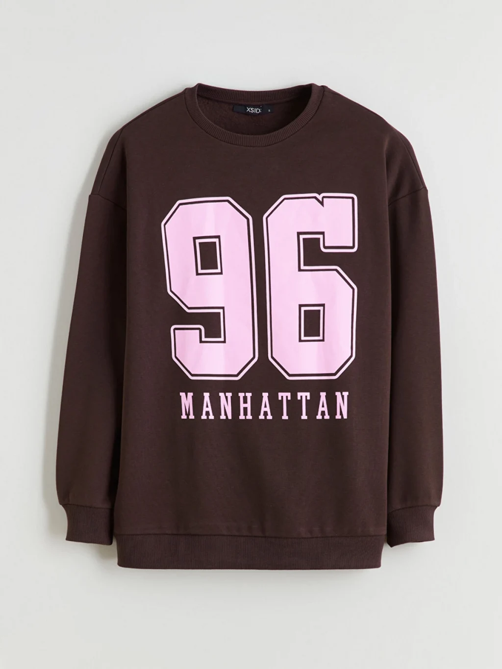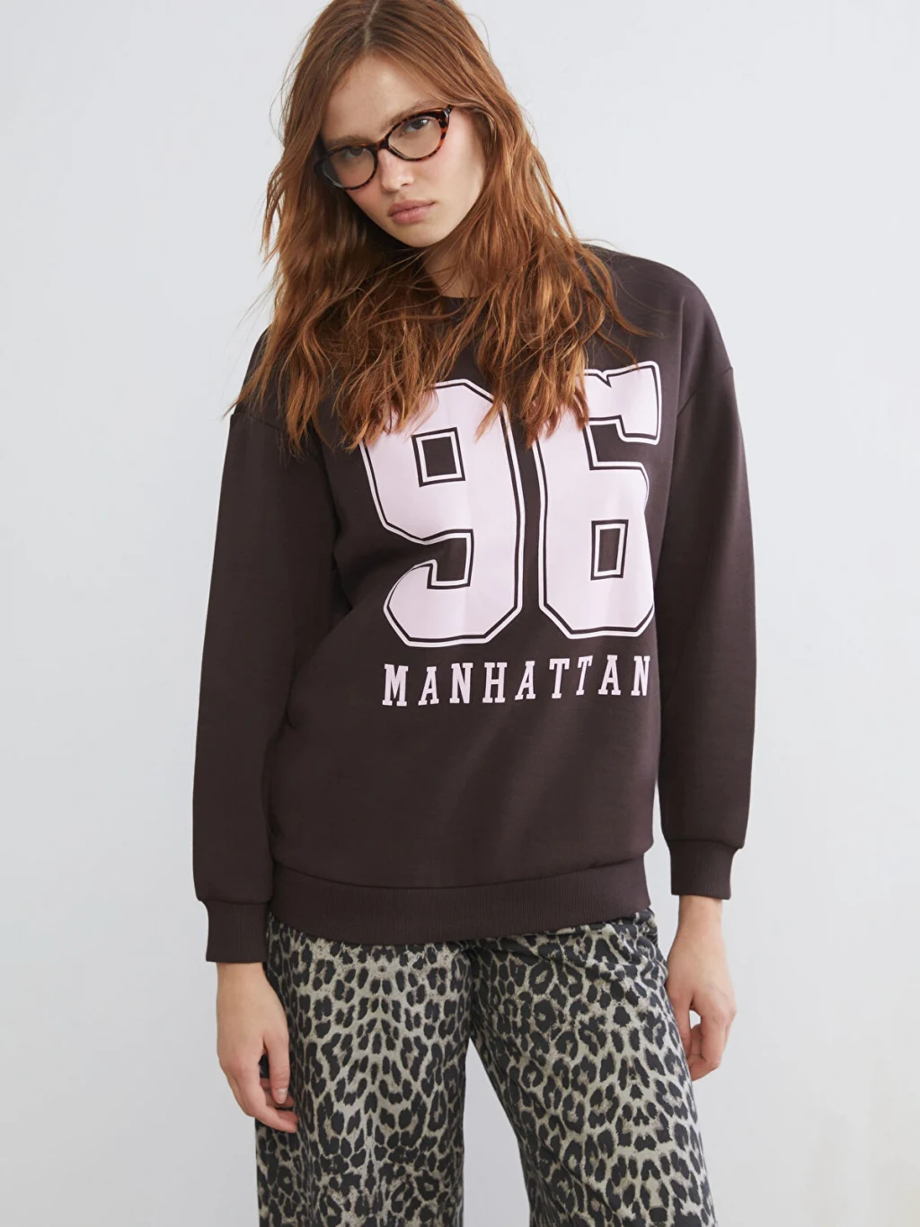 Bisiklet yaka ve uzun kollu kadın sweatshirt, önünde yazı ve sayı baskısı bulunur. Kol ve etek ucu ribanalı tasarıma sahiptir.
