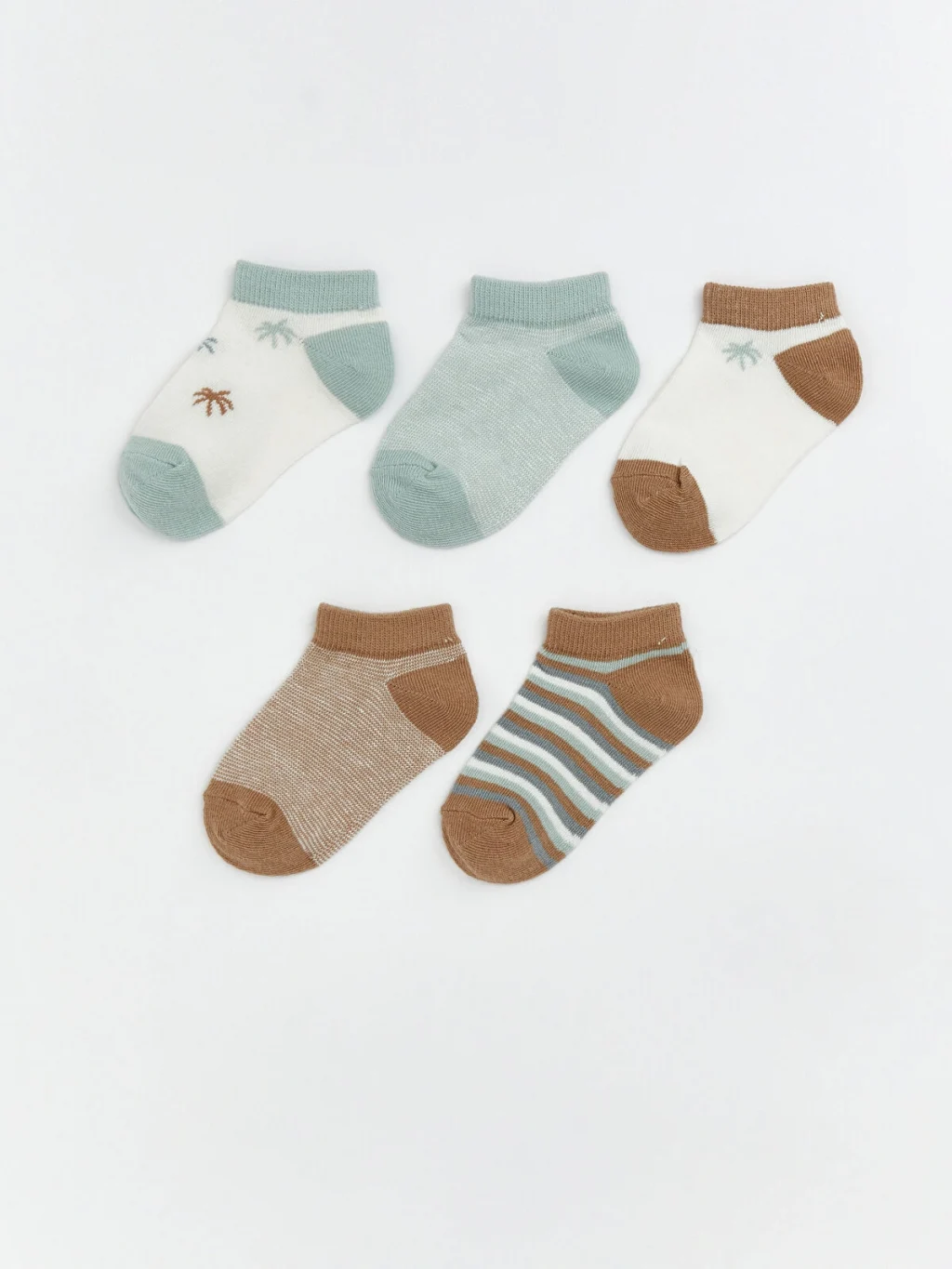 Erkek bebek patik çorap seti; çizgili, nakış işlemeli ve düz modeller içeren beş çiftten oluşur.