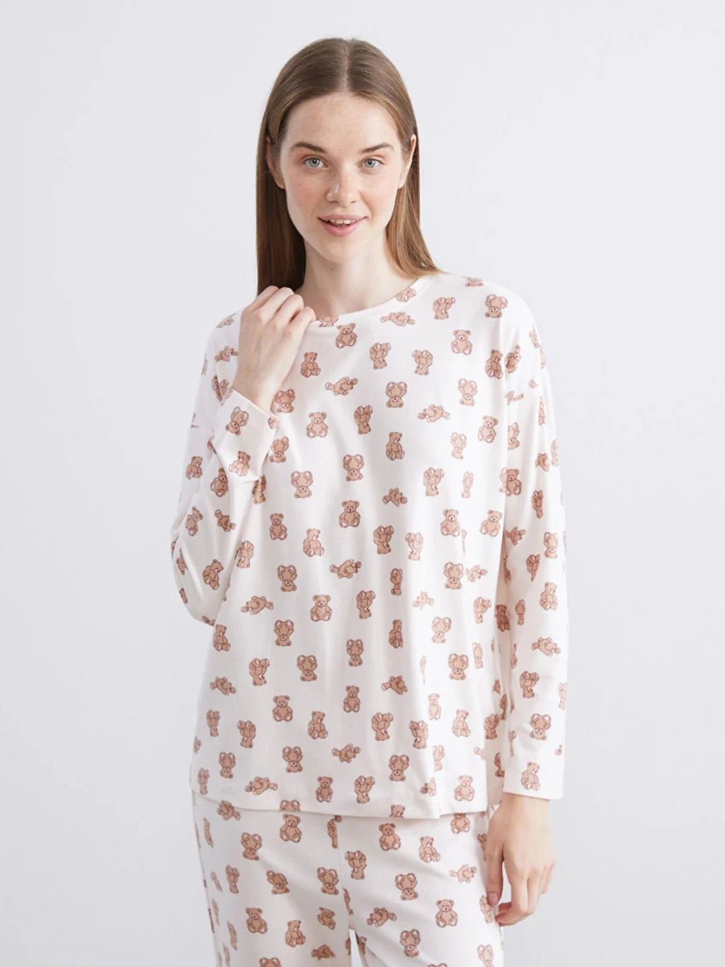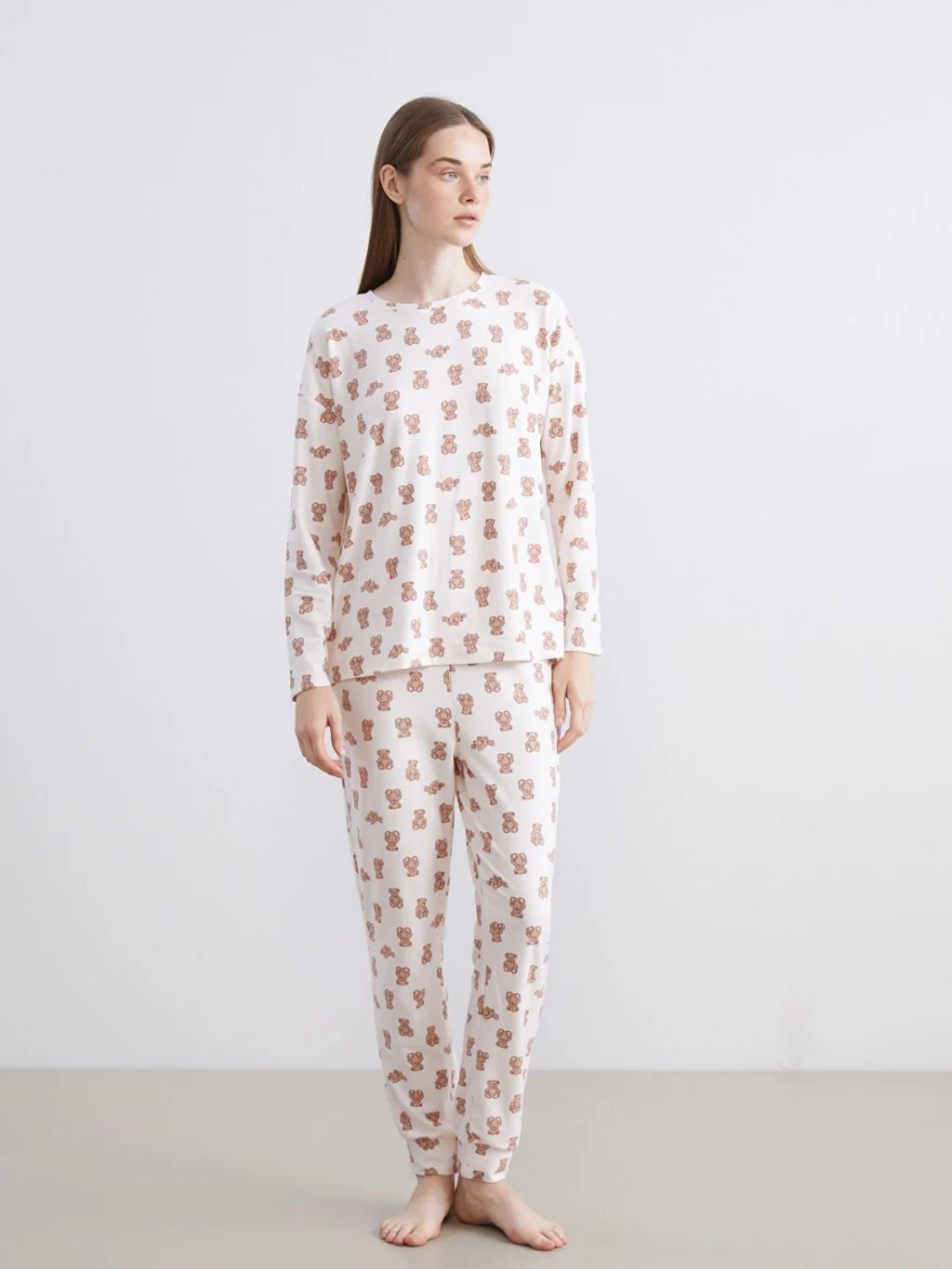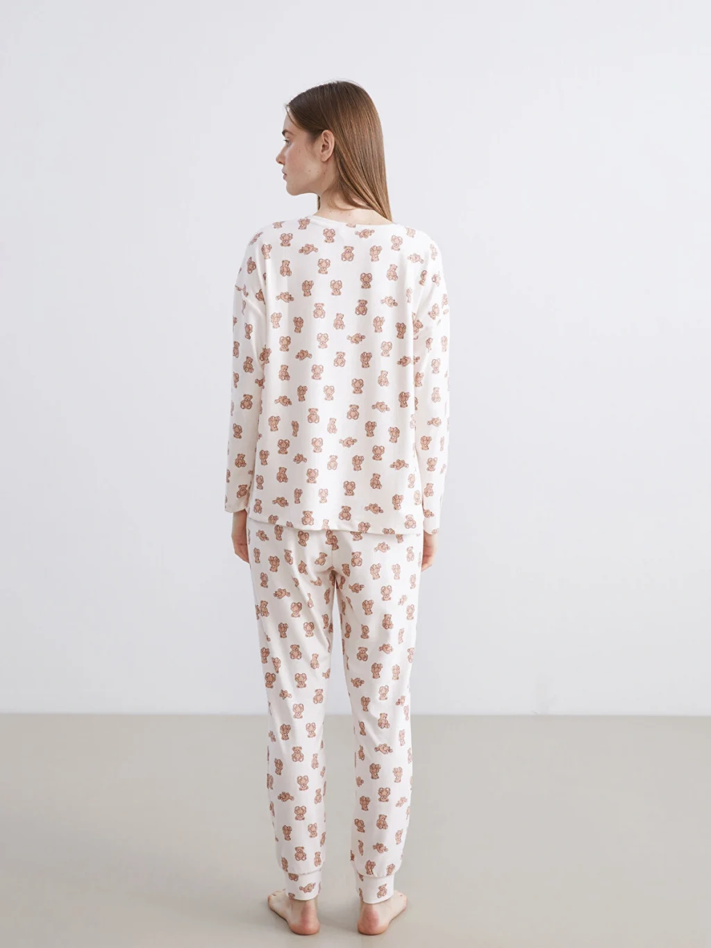 Mikrofiber kumaşlı kadın pijama takımı, bisiklet yaka ve uzun kollu desenli bir üst ile paçası lastikli desenli bir alttan oluşmaktadır.