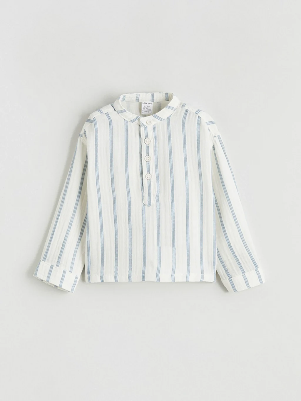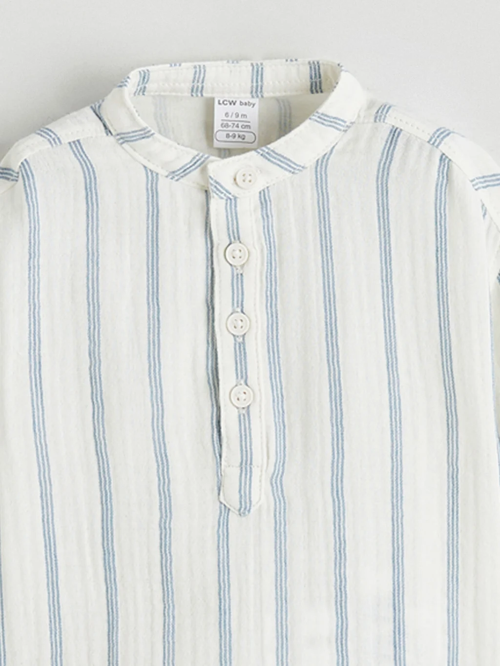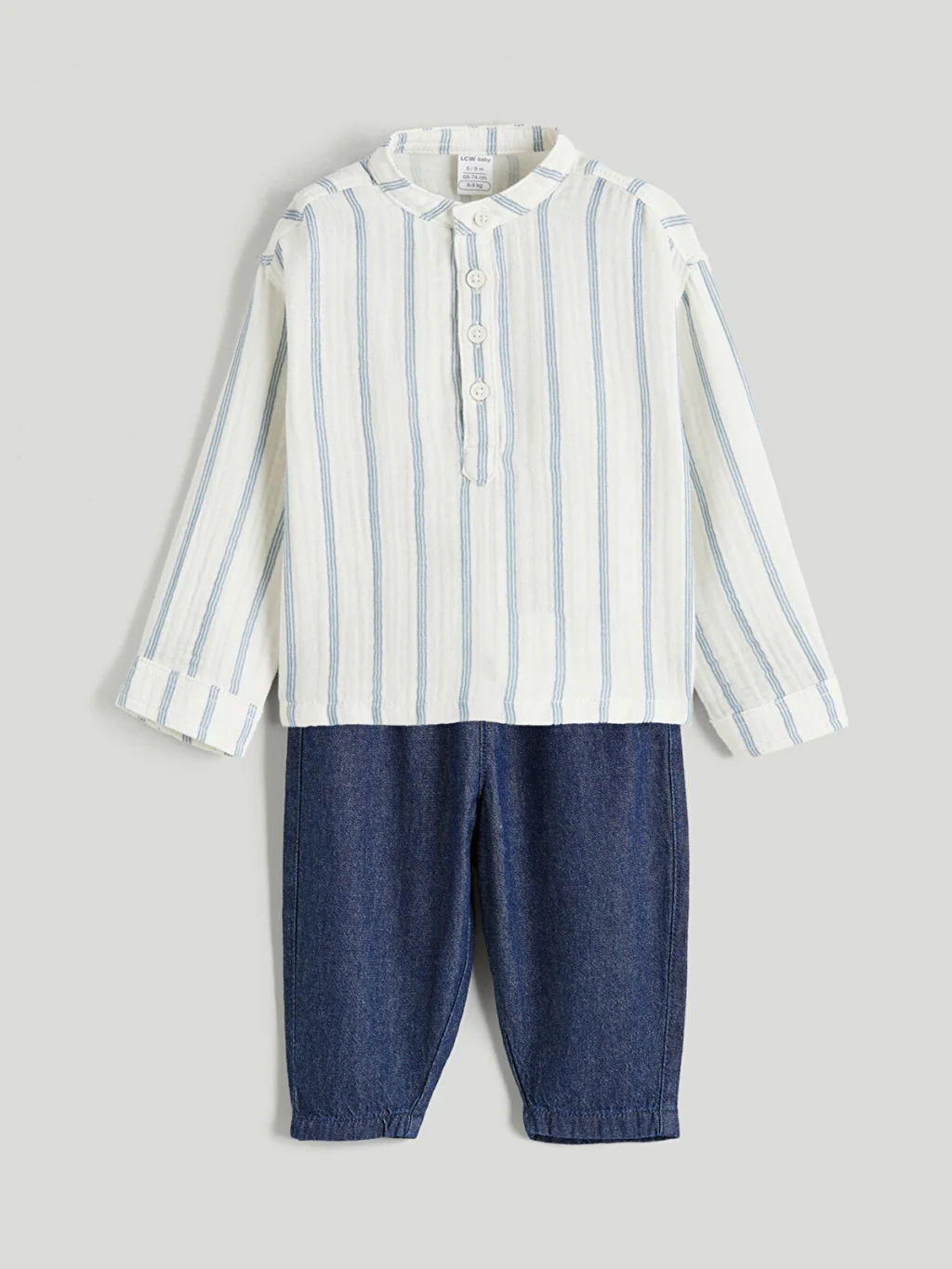 Hakim yakalı, uzun kollu, çizgili gömlek ve pantolondan oluşan erkek bebek takımı, %100 pamuklu müslin kumaştan üretilmiştir.