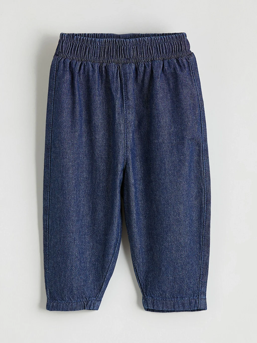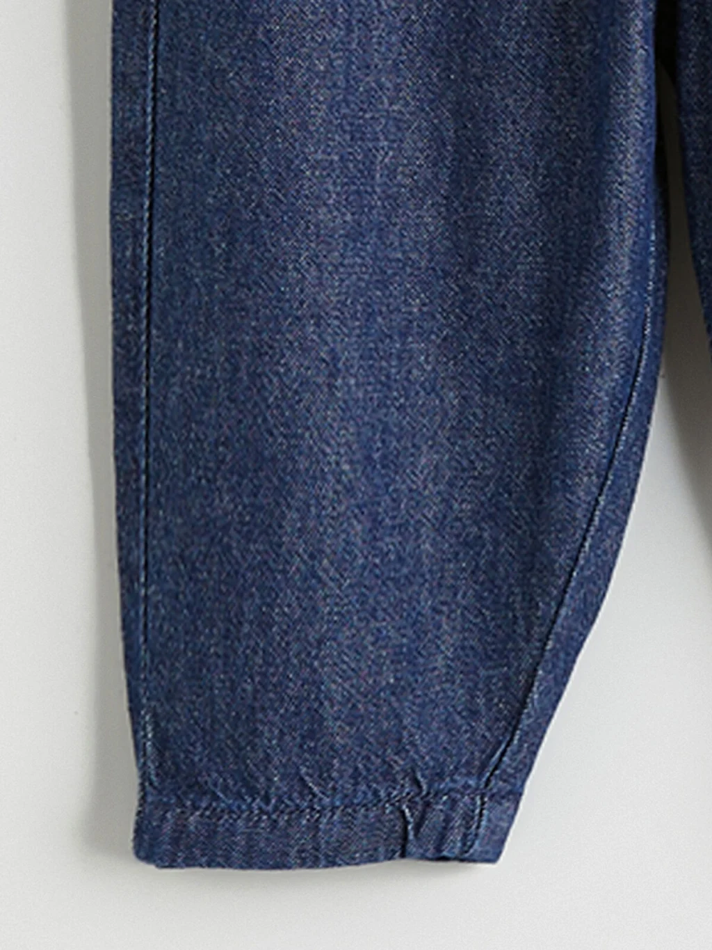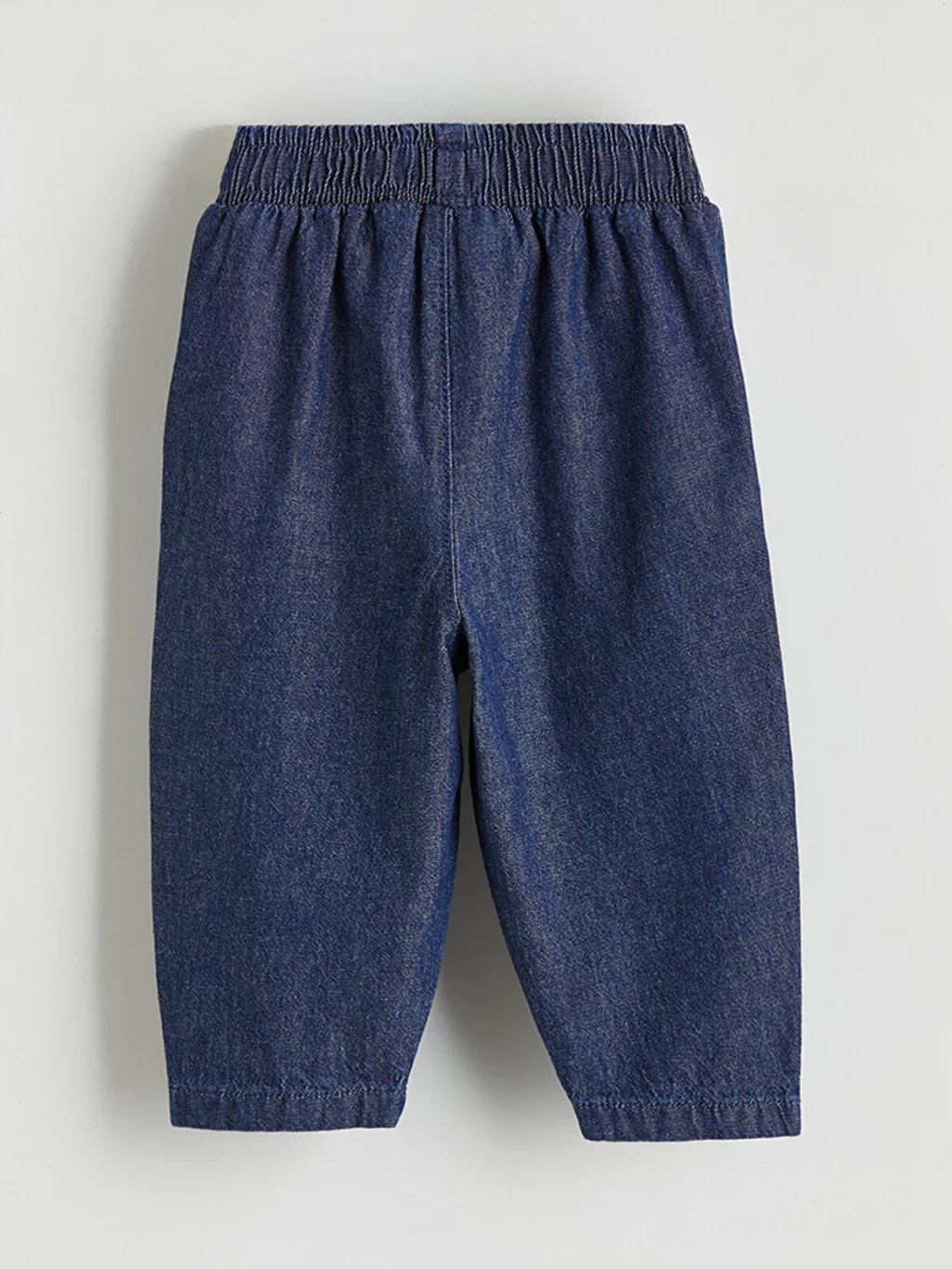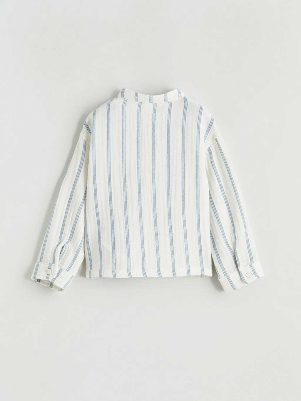 Hakim yakalı, uzun kollu, çizgili gömlek ve pantolondan oluşan erkek bebek takımı, %100 pamuklu müslin kumaştan üretilmiştir.