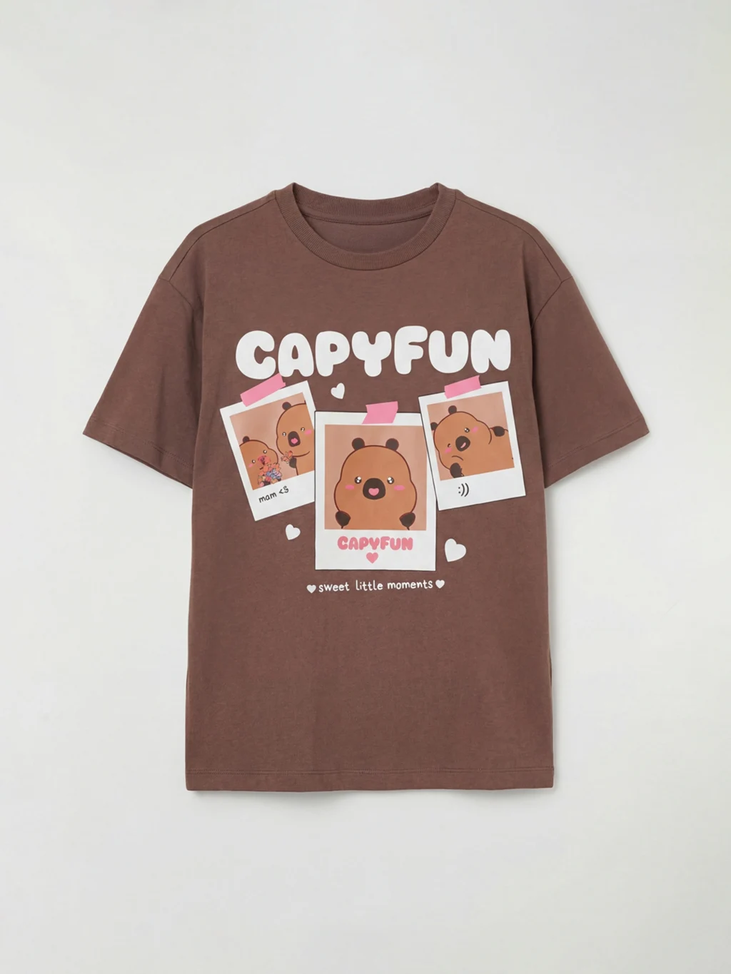 Capyfun lisanslı, bisiklet yaka ve kısa kollu kız çocuk tişört, %100 pamuk kumaştan üretilmiştir ve bol kalıba sahiptir.