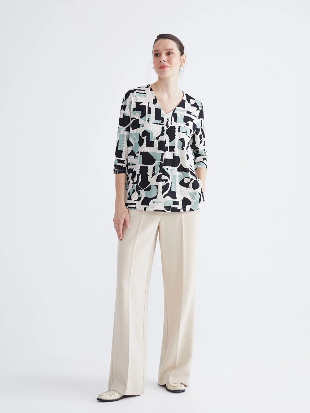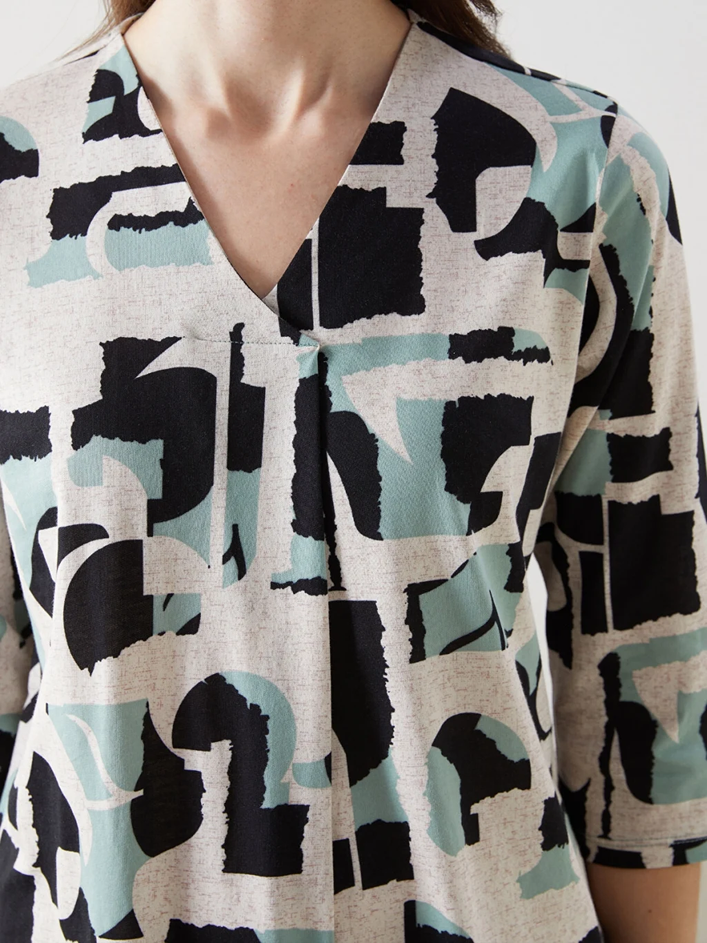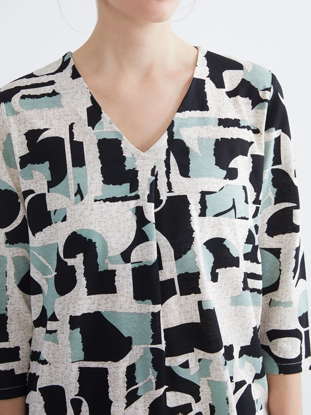 V yaka desenli kadın bluz, truvakar kol boyuyla şık bir görünüm sağlar. Deseniyle dikkat çeken bu bluz, tarzınızı öne çıkarırken günlük kombinlerinize enerji katmanızı sağlar.