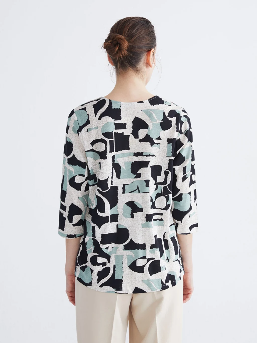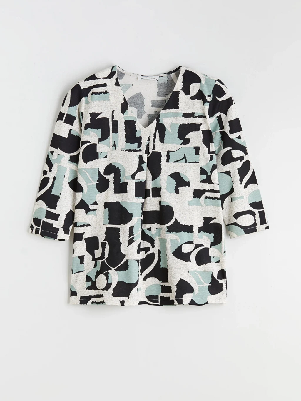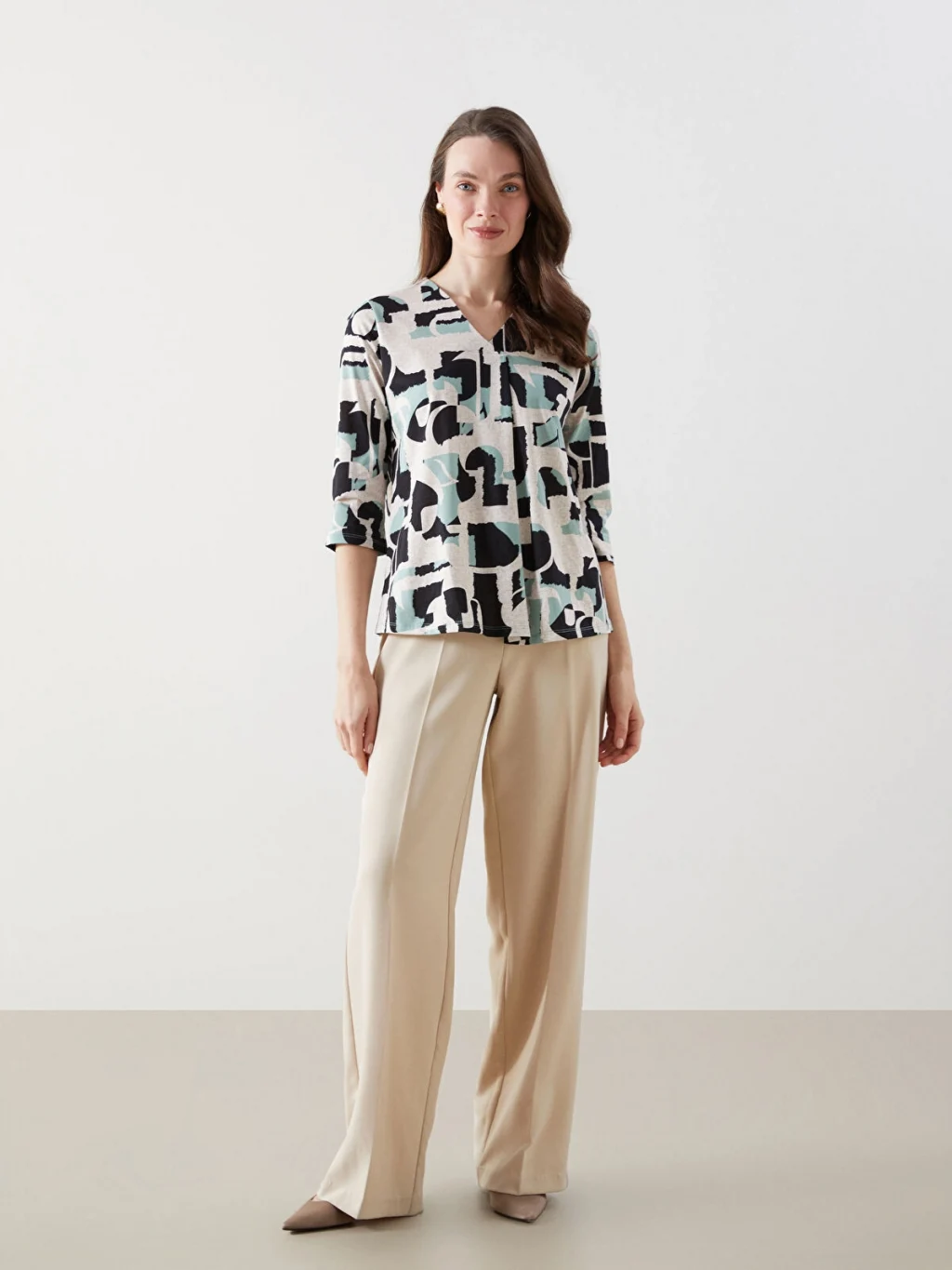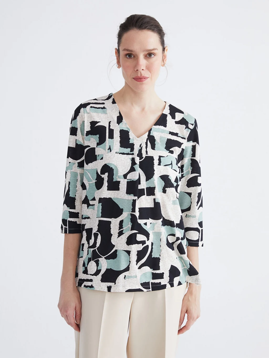 V yaka desenli kadın bluz, truvakar kol boyuyla şık bir görünüm sağlar. Deseniyle dikkat çeken bu bluz, tarzınızı öne çıkarırken günlük kombinlerinize enerji katmanızı sağlar.