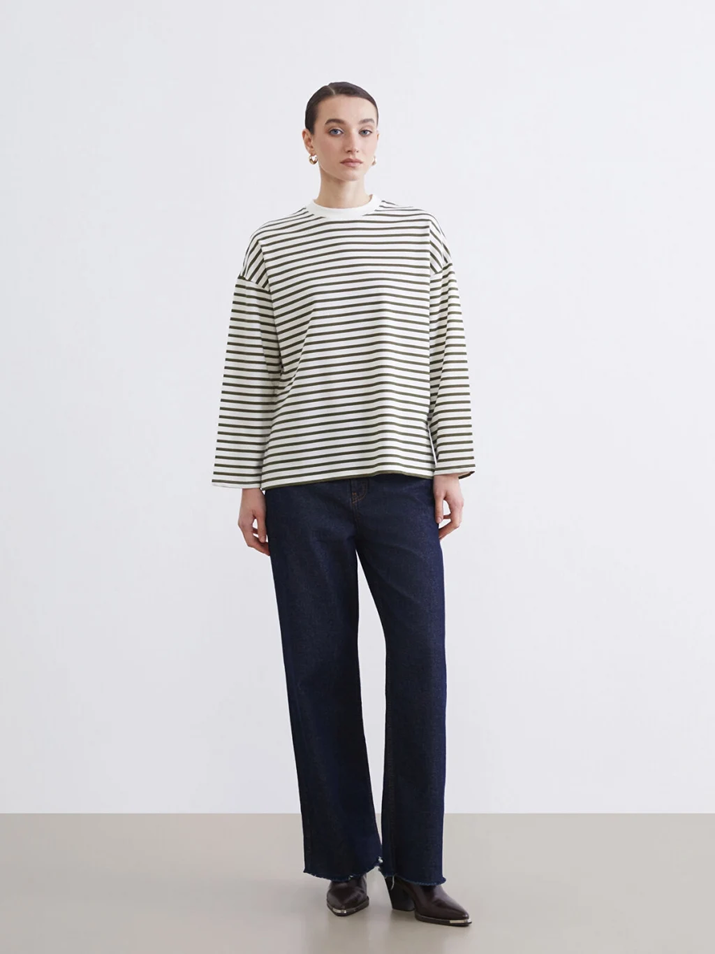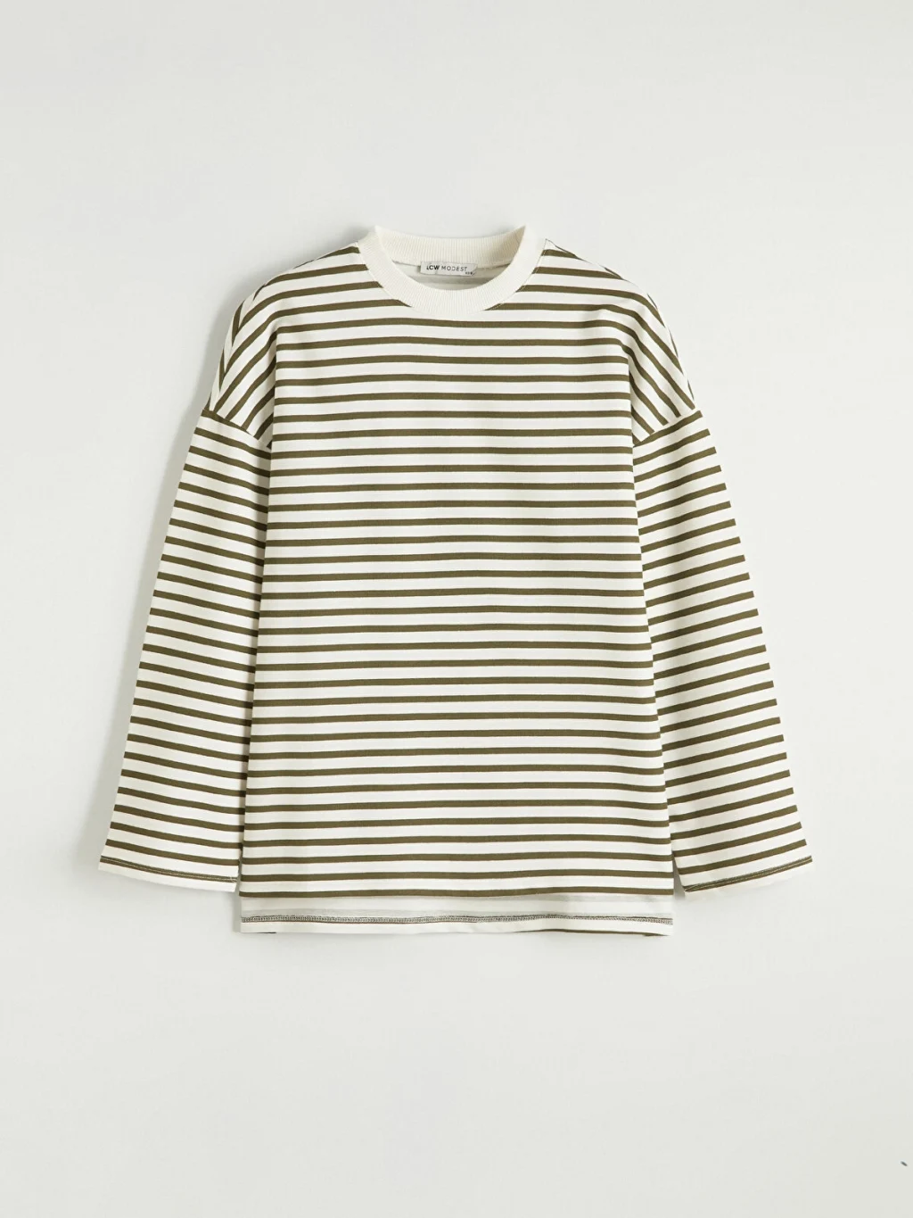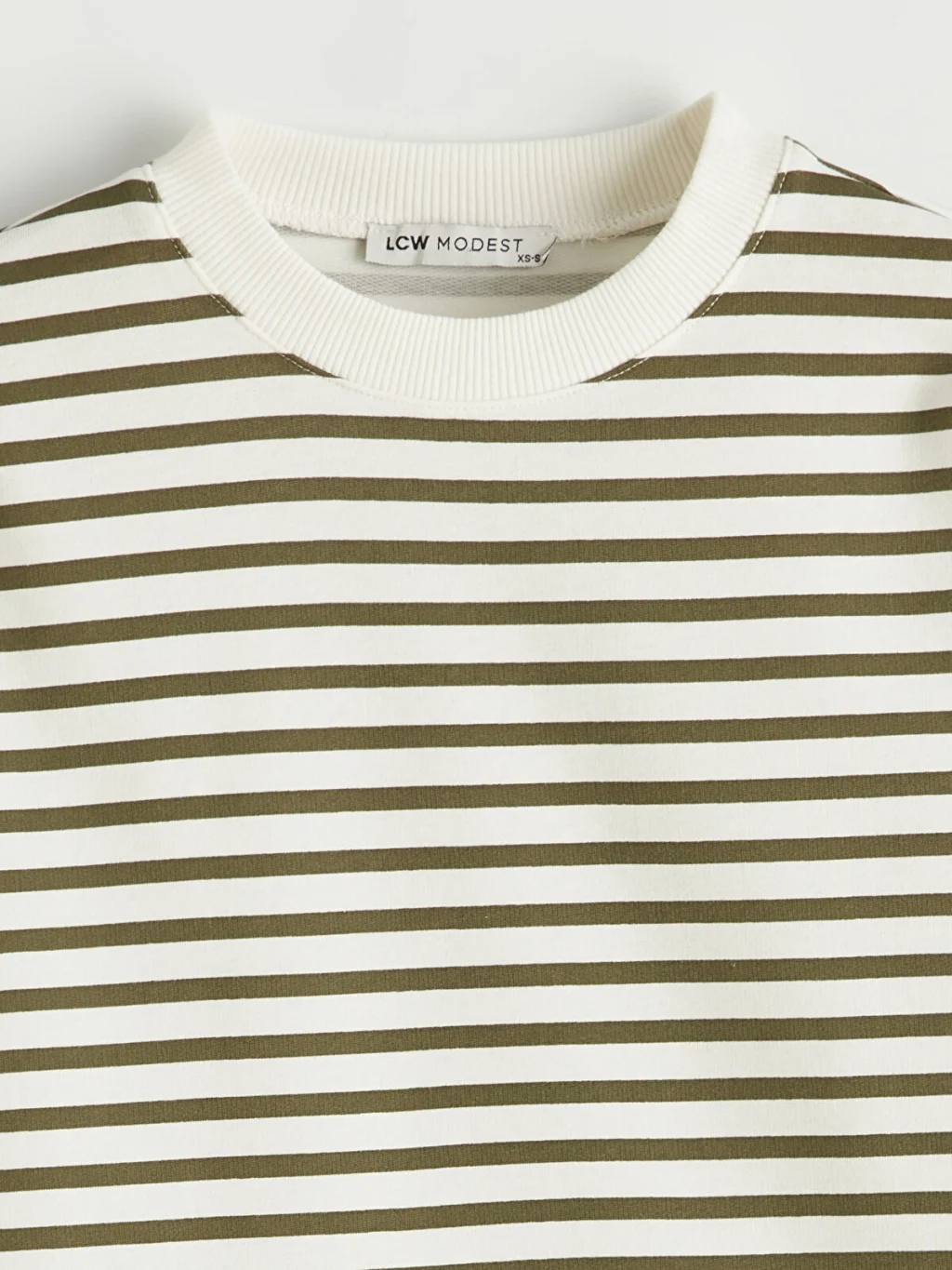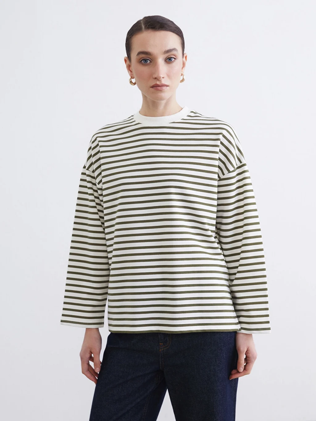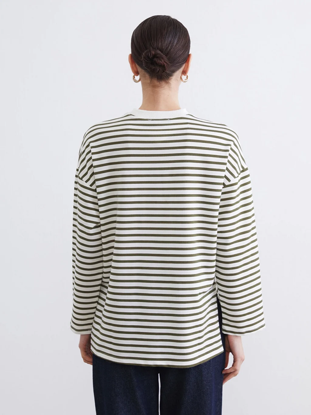 Kadın sweatshirt tunik, yüksek pamuk içeren kumaştan üretilmiştir. Bisiklet yaka, uzun kollu ve çizgili tasarıma sahiptir.