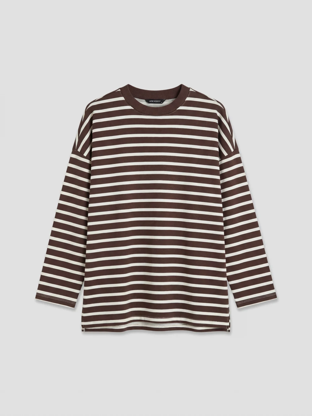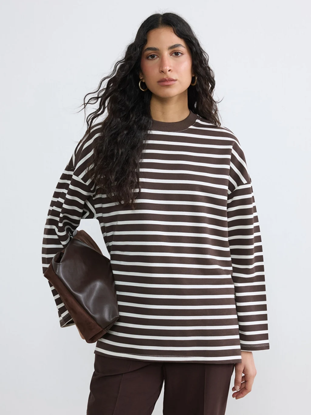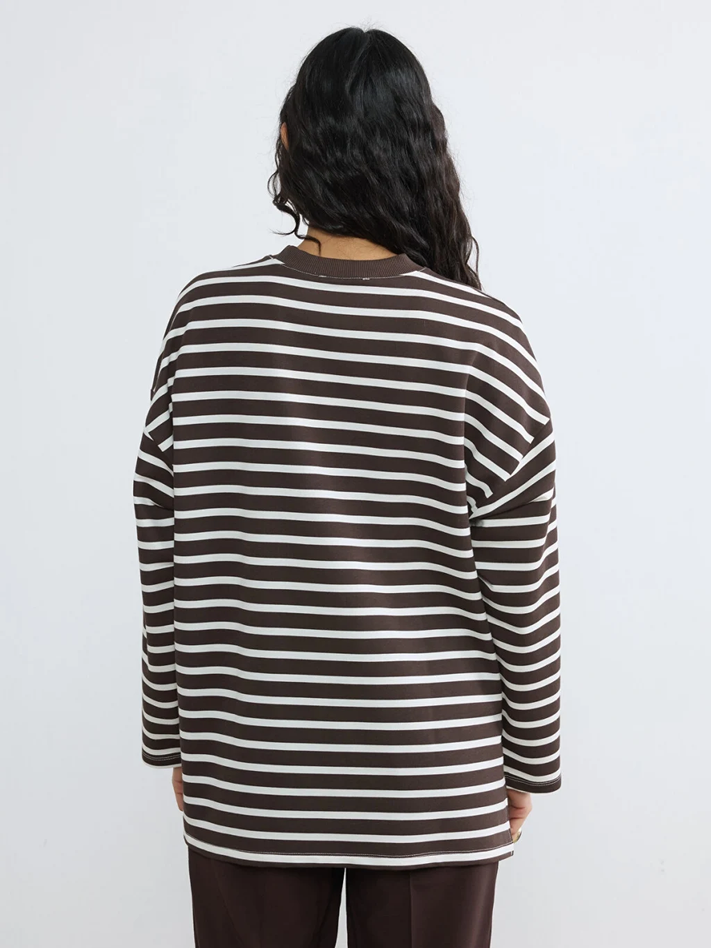 Bisiklet yaka, uzun kollu, çizgili kadın sweatshirt tunik, 2 iplik kumaştan üretilmiştir ve basen boy kesime sahiptir.
