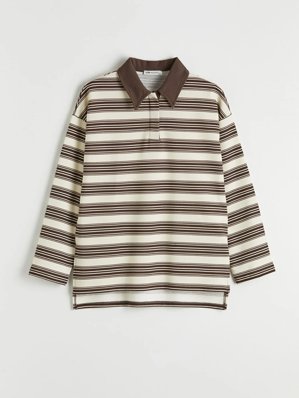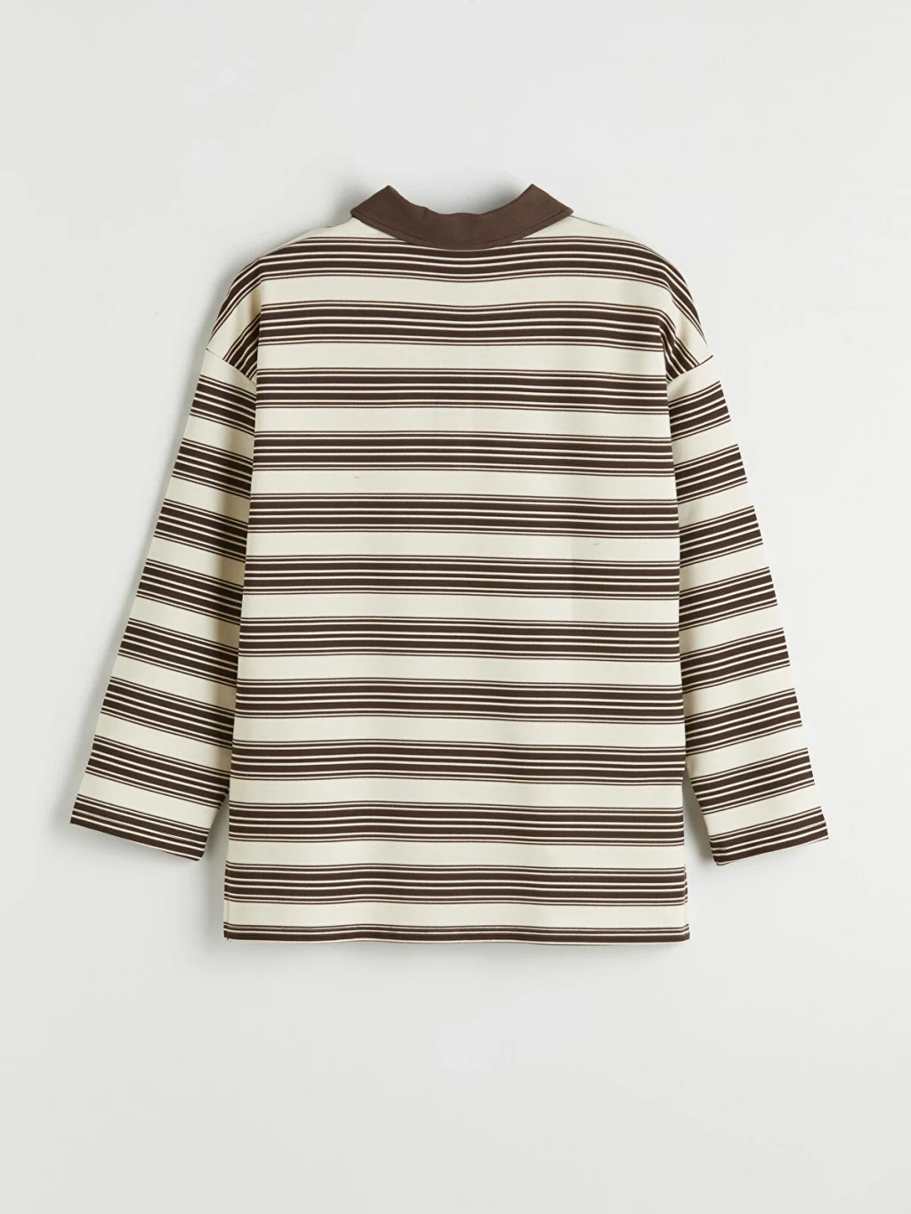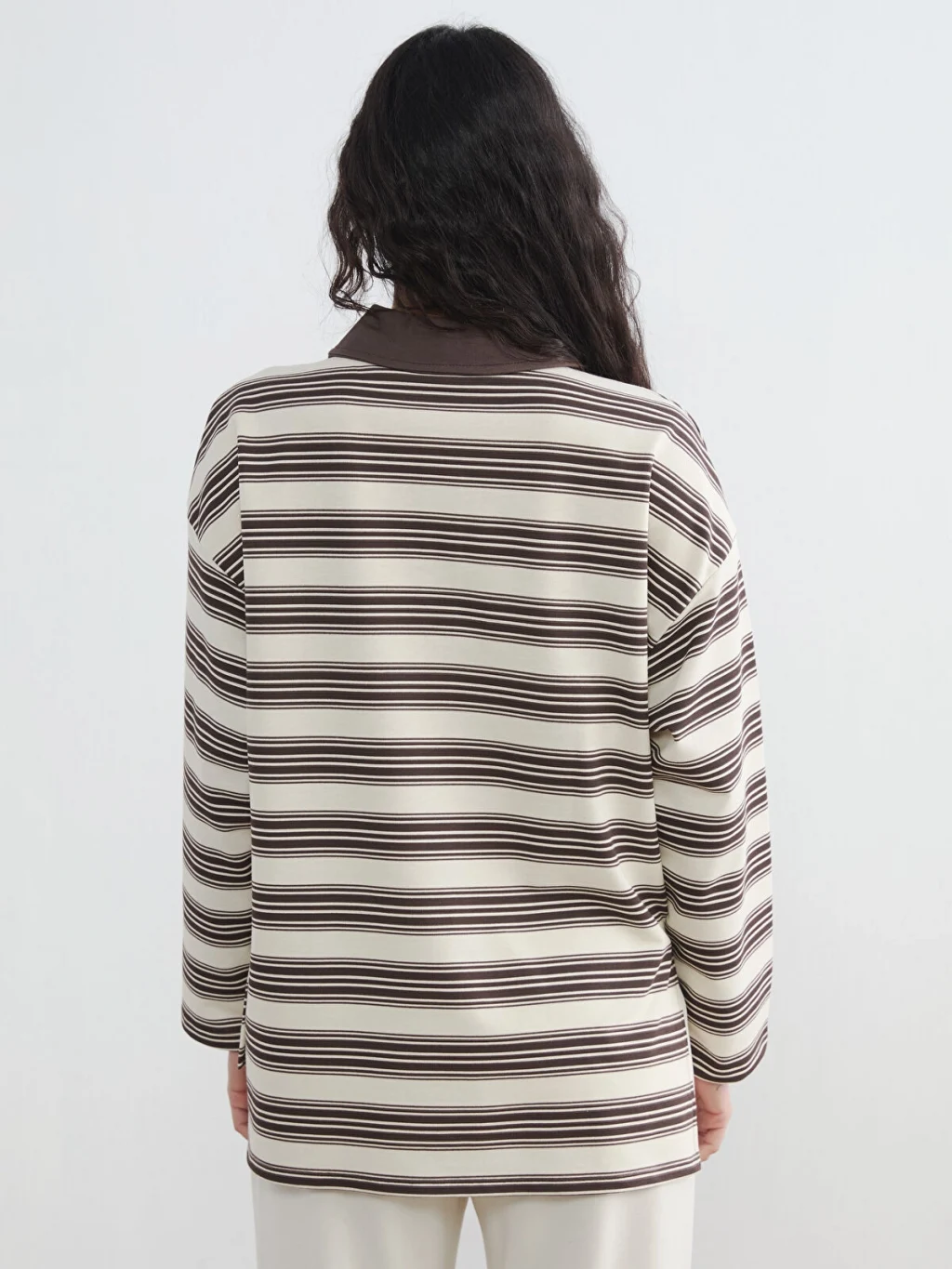 Kadın sweatshirt tunik, polo yakalı ve uzun kolludur. Çizgili desene sahip ürün, basen boydur ve 2 iplik kumaştan üretilmiştir.