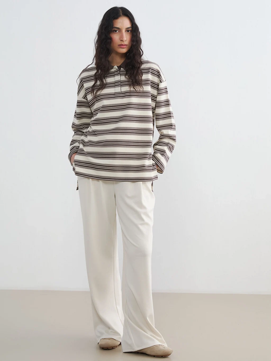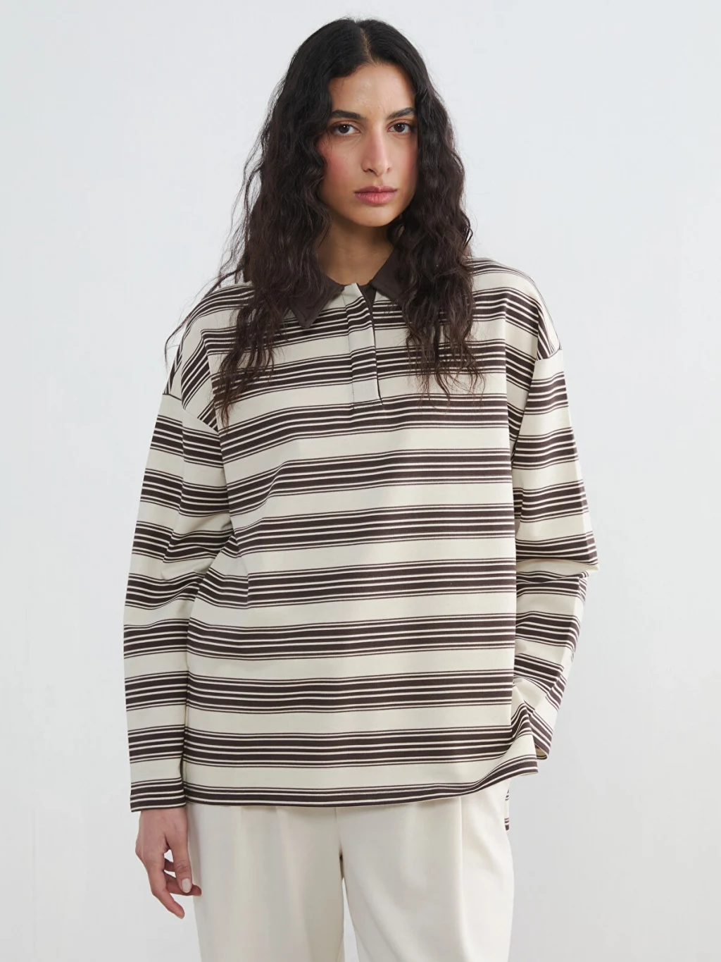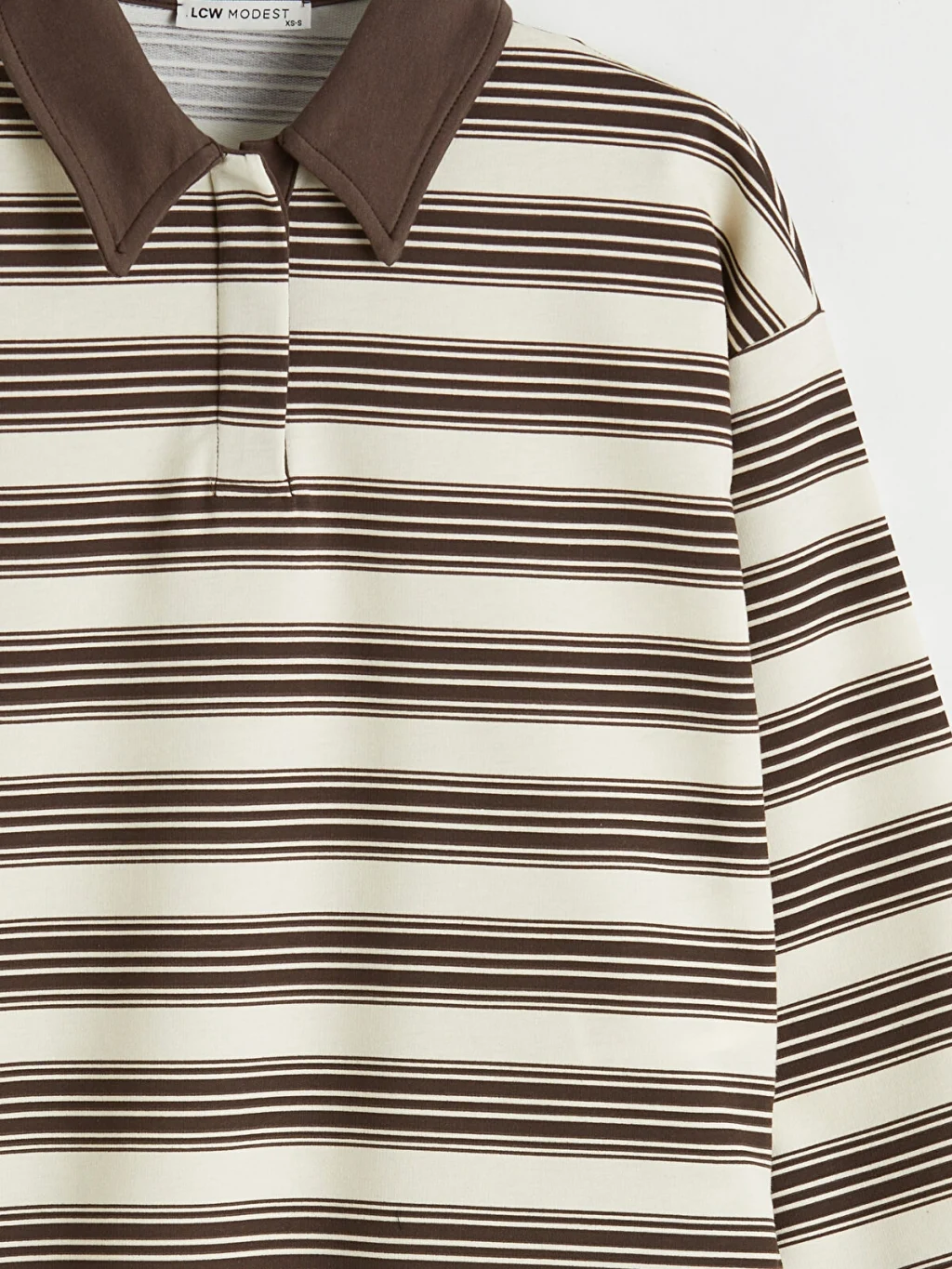 Kadın sweatshirt tunik, polo yakalı ve uzun kolludur. Çizgili desene sahip ürün, basen boydur ve 2 iplik kumaştan üretilmiştir.