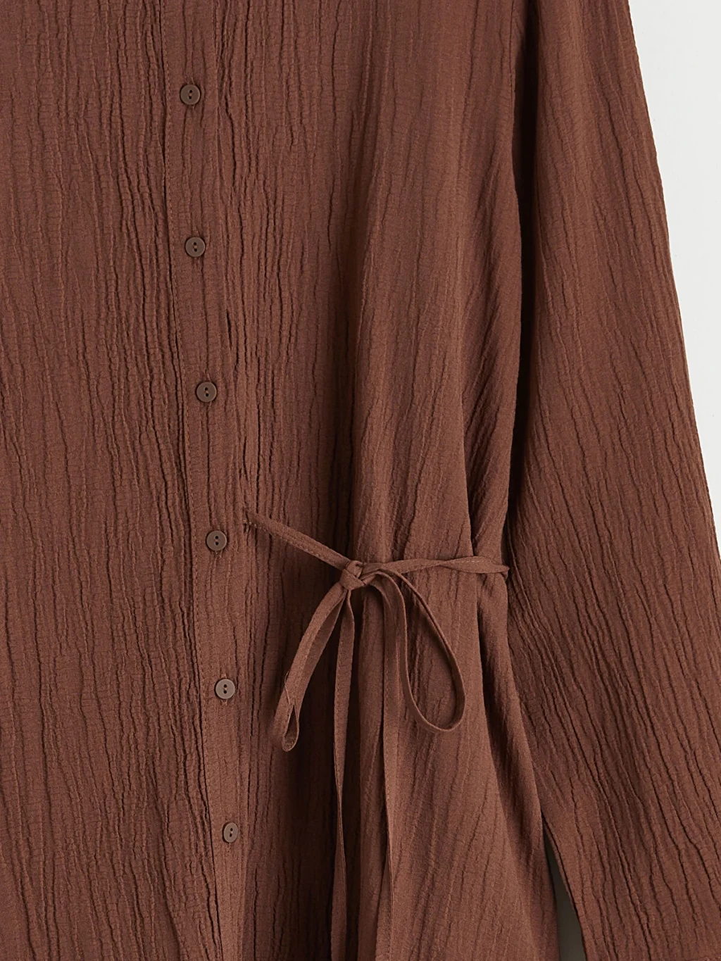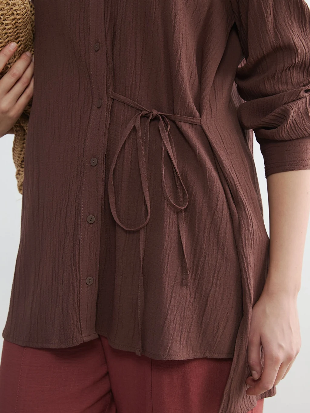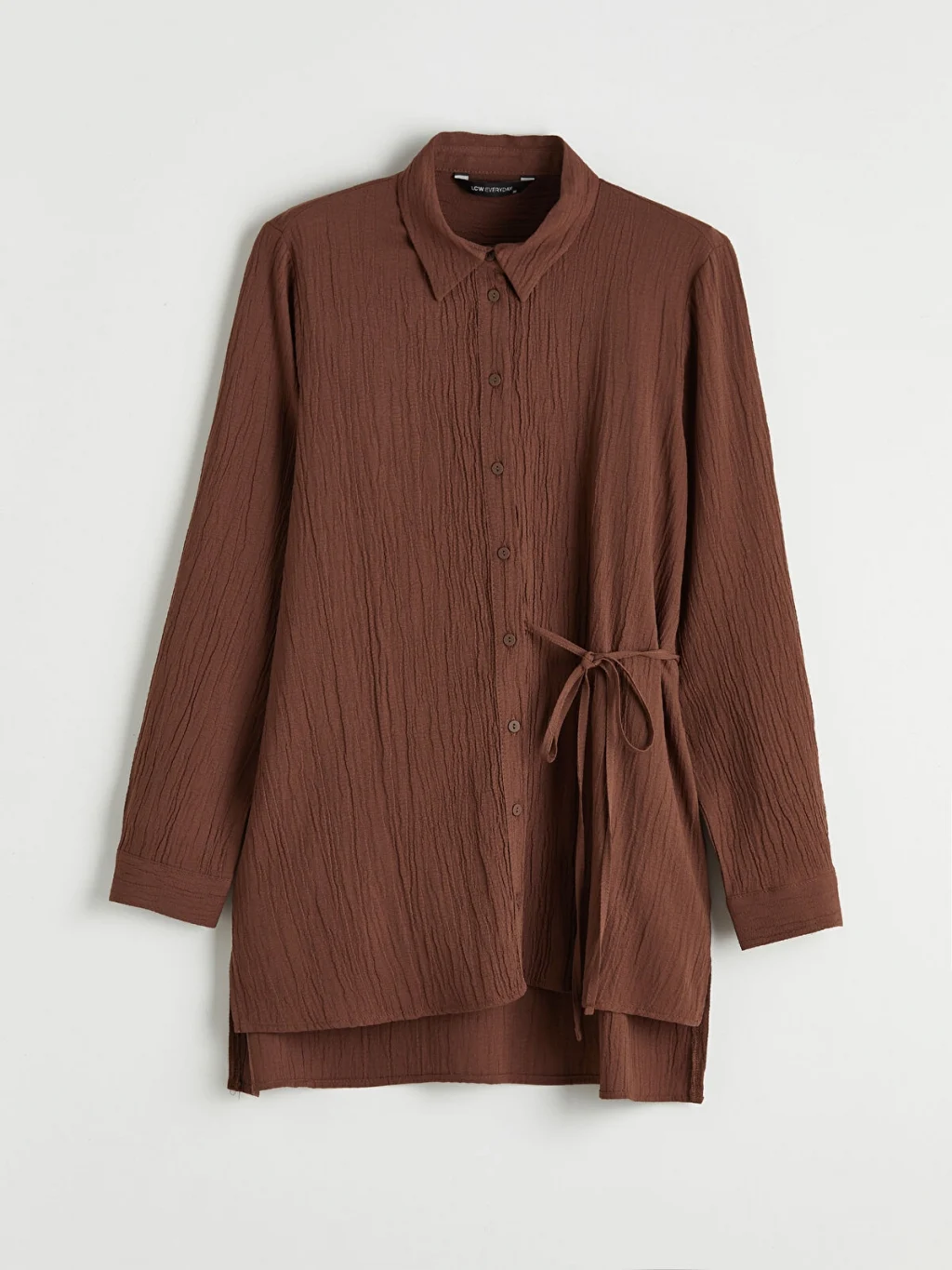 Gofre kumaştan üretilen kadın gömlek tunik, uzun kollu ve önden düğme kapamalıdır. Beli bağlama detaylıdır.