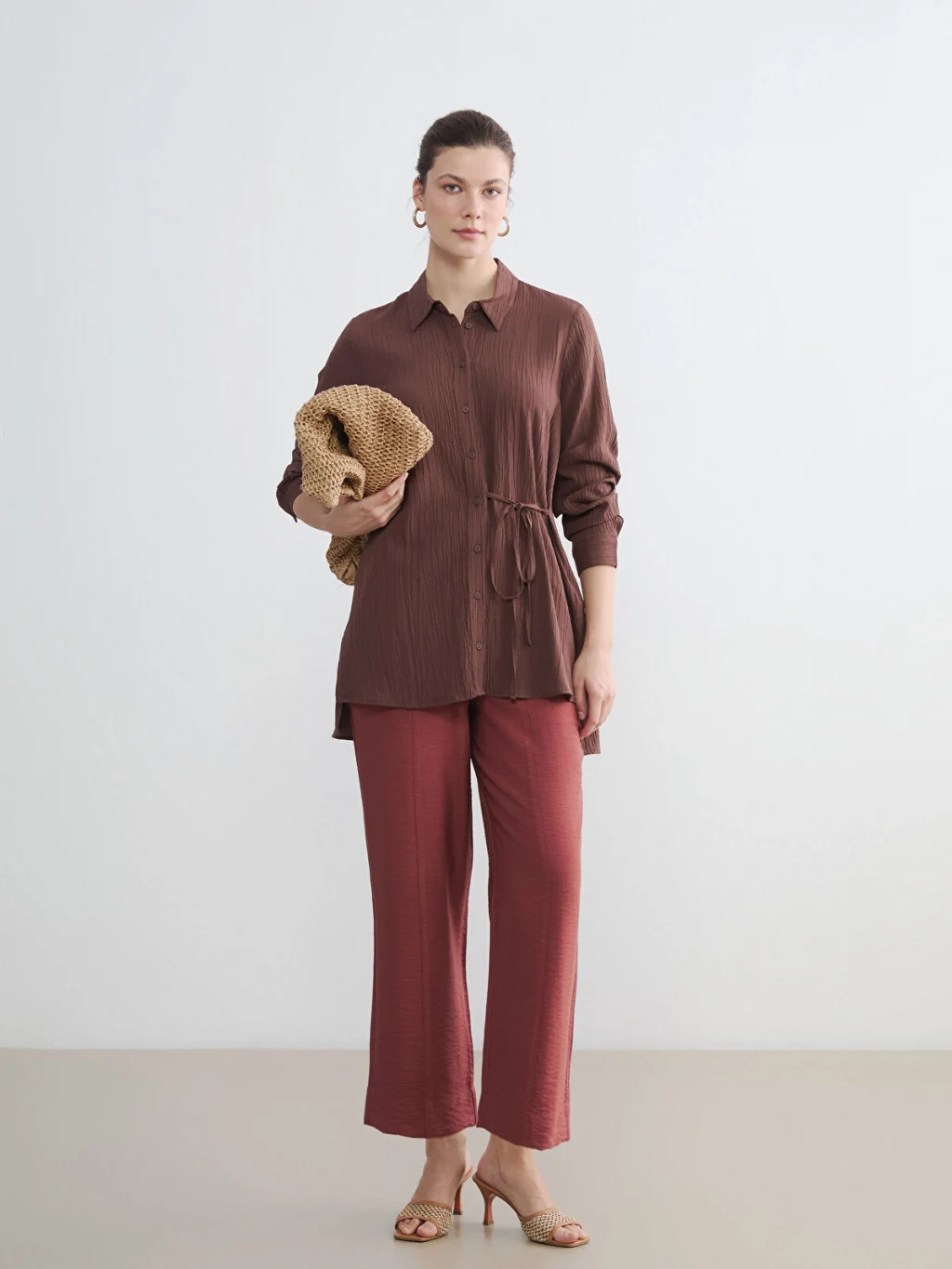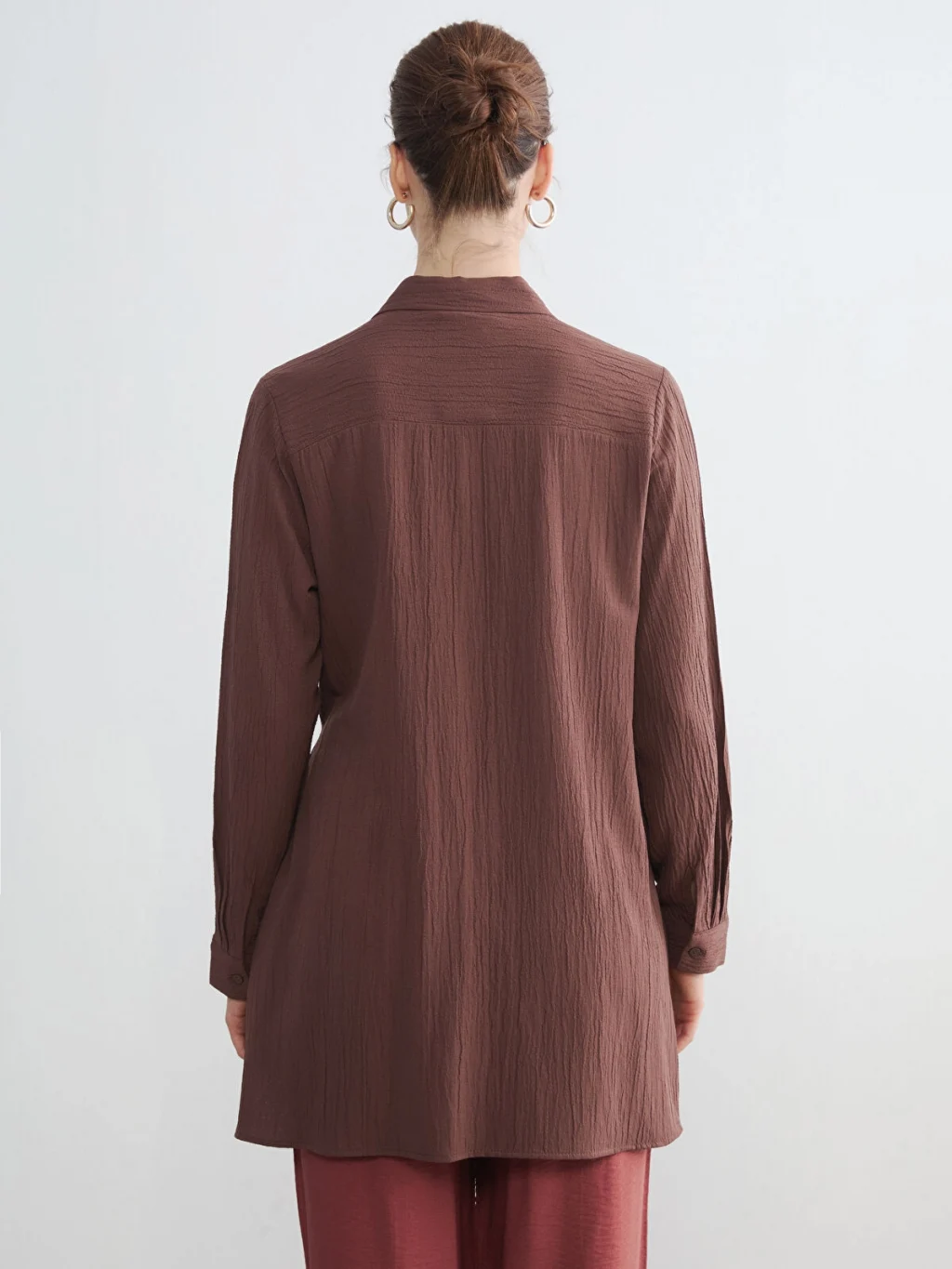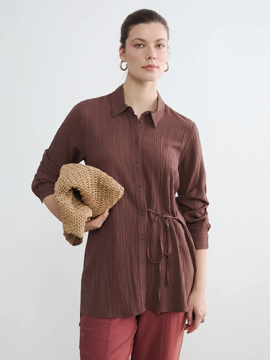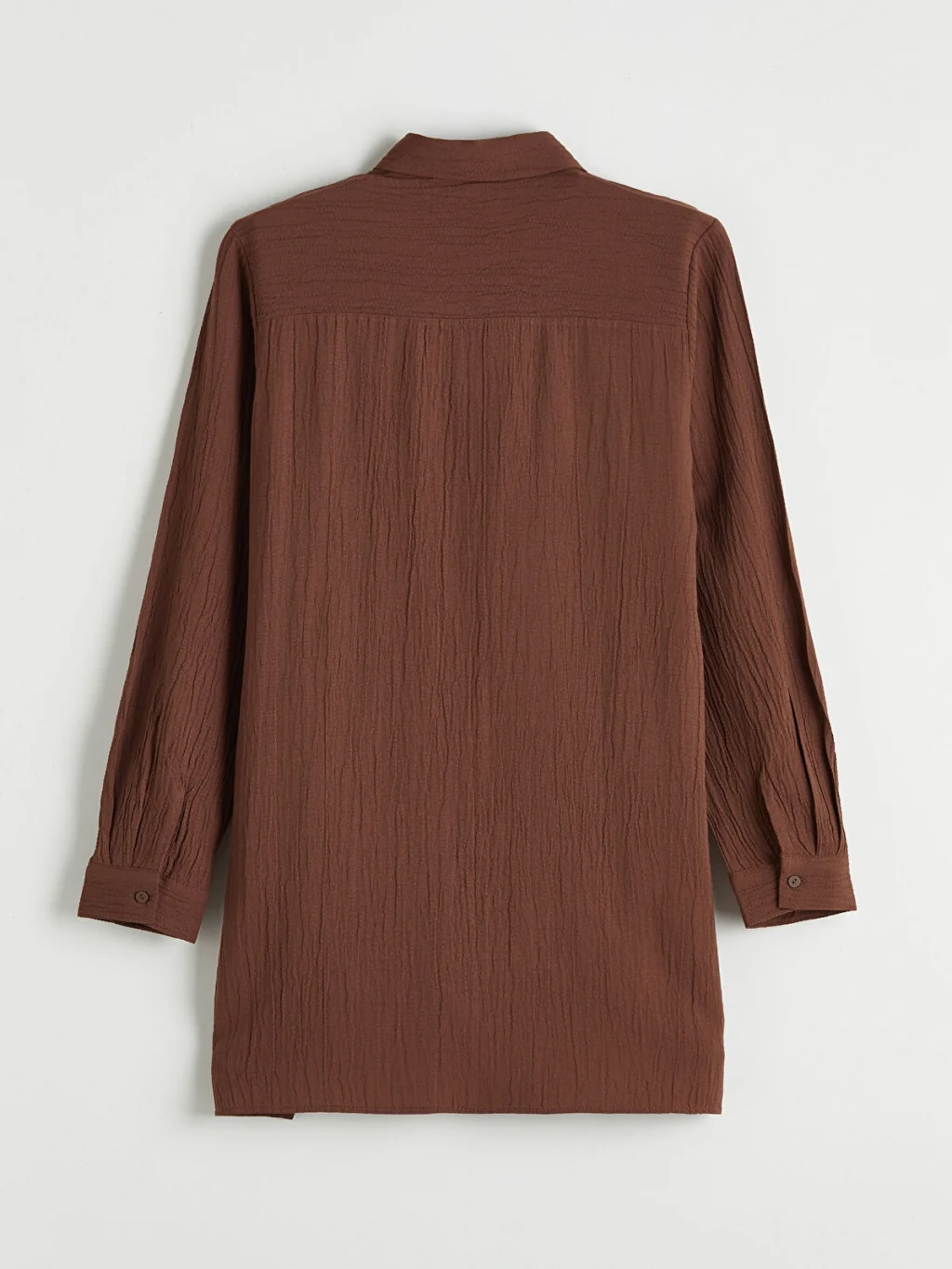 Gofre kumaştan üretilen kadın gömlek tunik, uzun kollu ve önden düğme kapamalıdır. Beli bağlama detaylıdır.