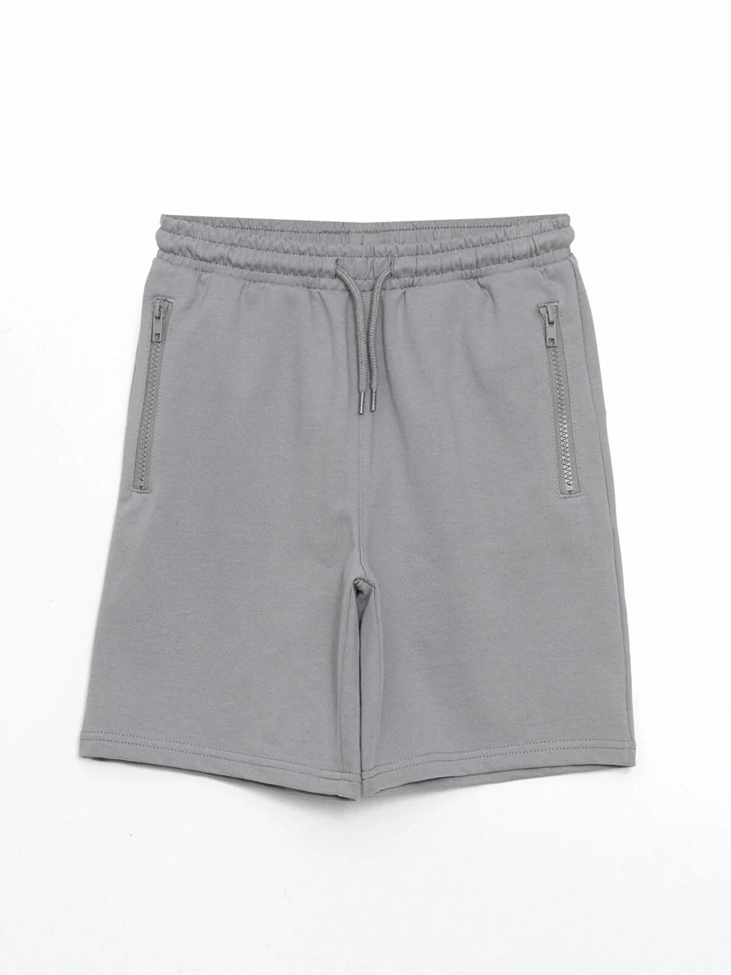 Beli lastikli ve ayarlanabilir ipli erkek çocuk şort, yüksek pamuk içeren 2 iplik kumaştan üretilmiştir. Yanlarda fermuarlı cepleri vardır.