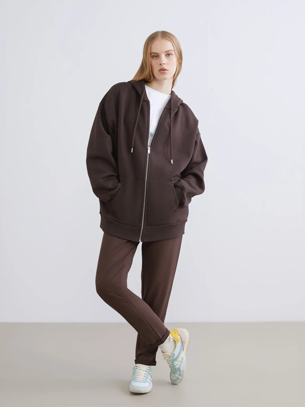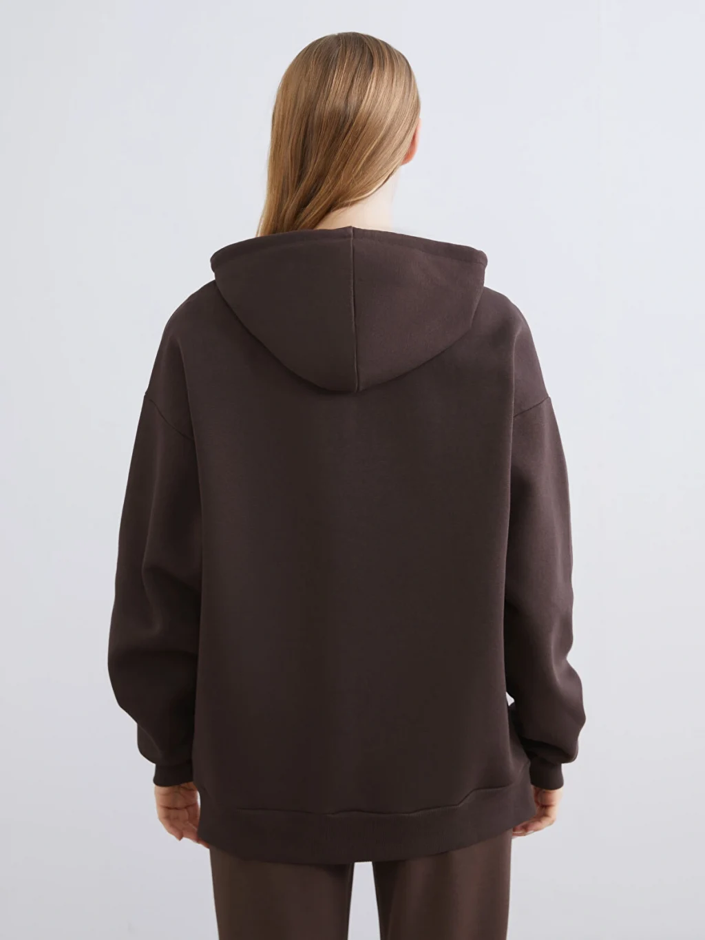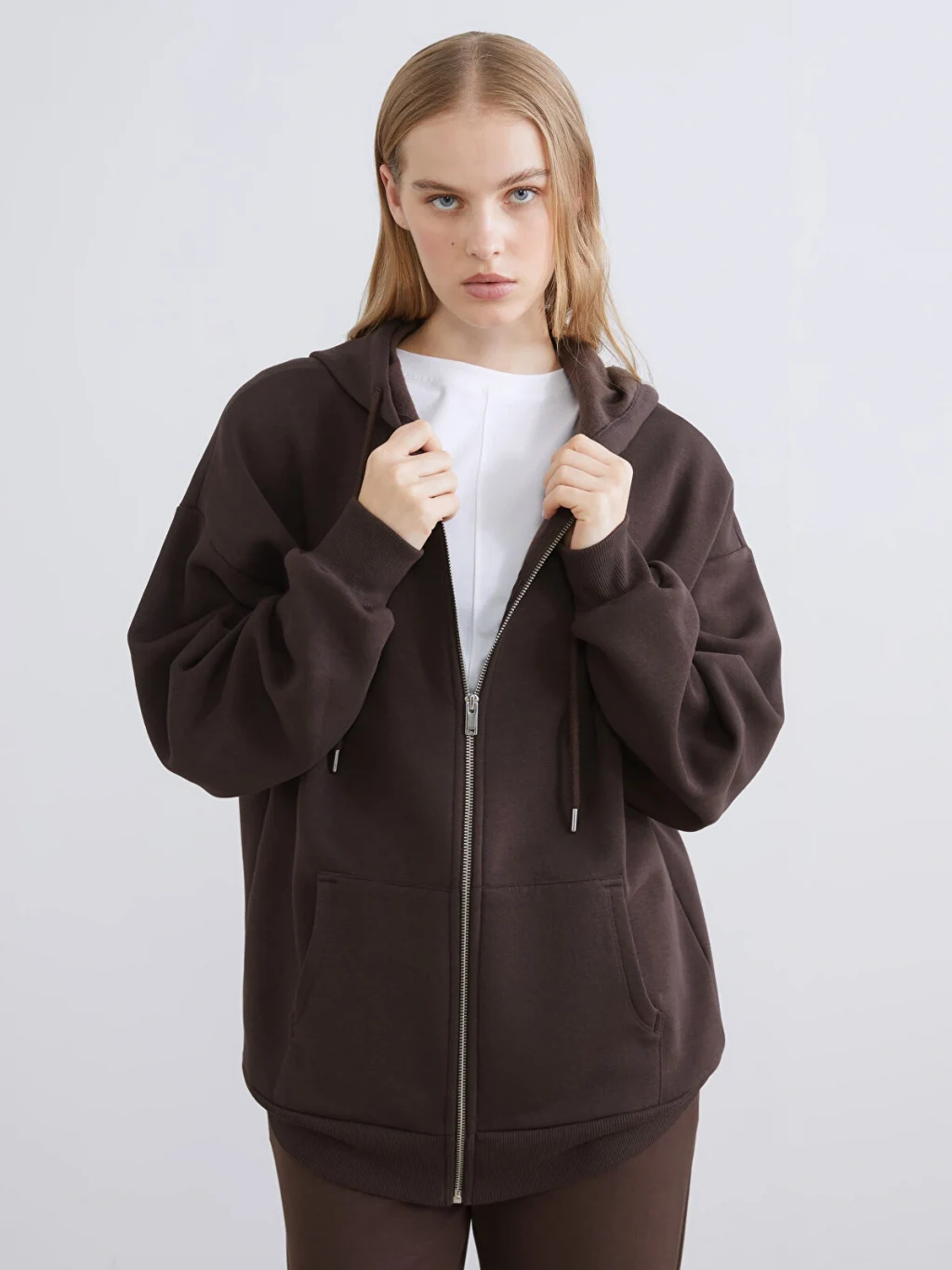 Kalın 3 iplik şardonlu kumaştan üretilen kadın sweatshirt, fermuar kapamalıdır. Büzgü ipli kapüşonu, uzun kolları ve iki ön cebi bulunur.