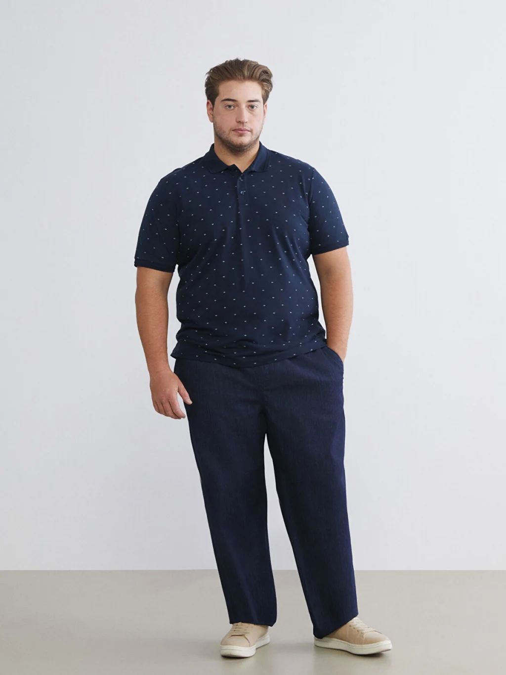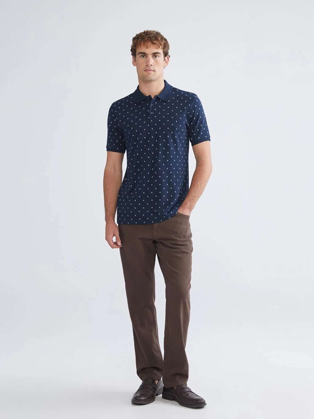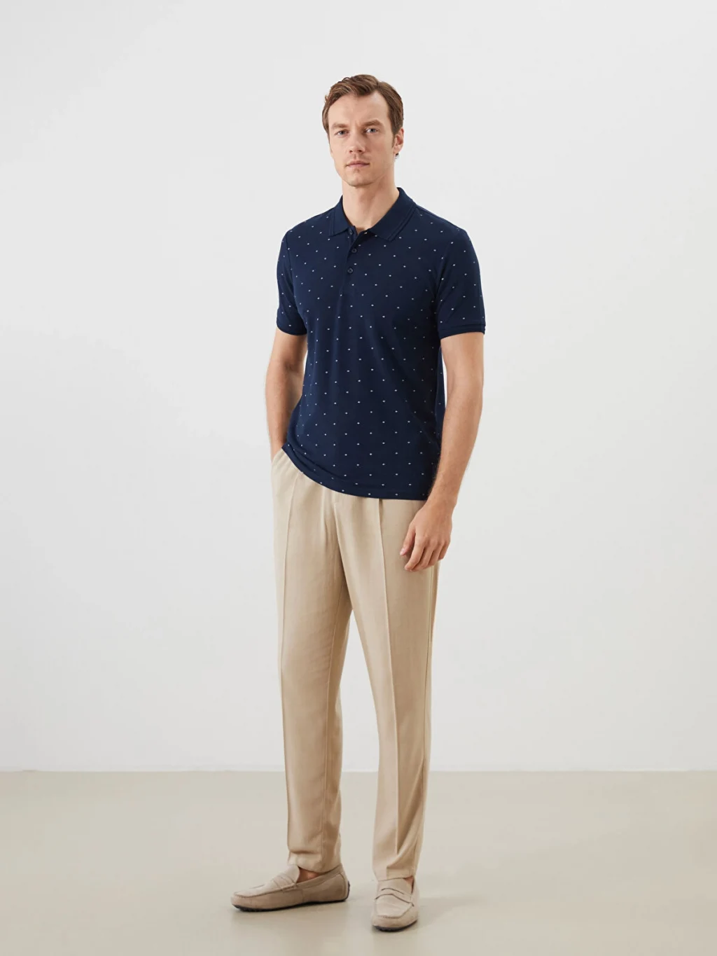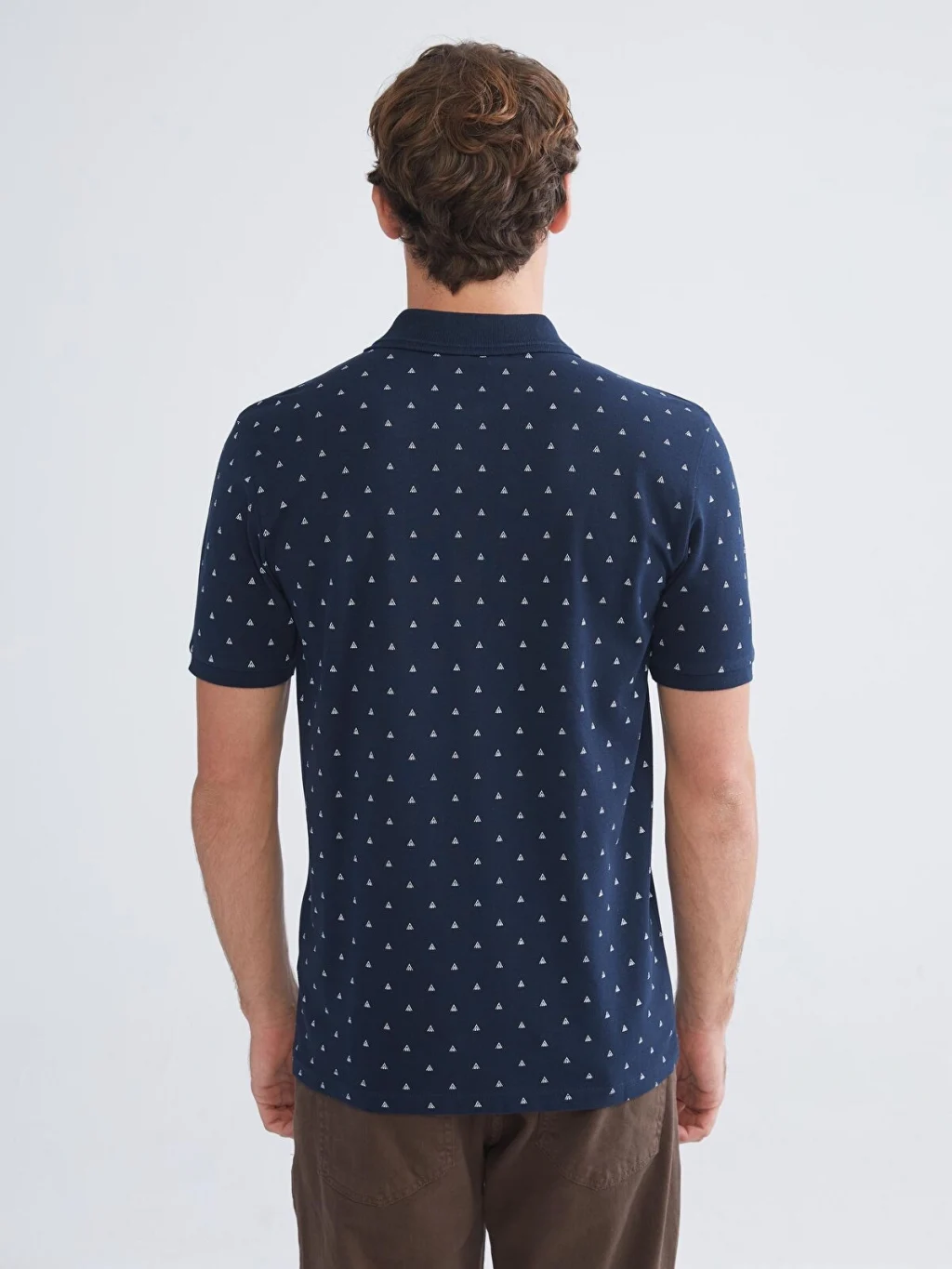 Polo yaka tasarıma sahiptir. Desenli pike kumaştan üretilmiş olup kısa kolludur.