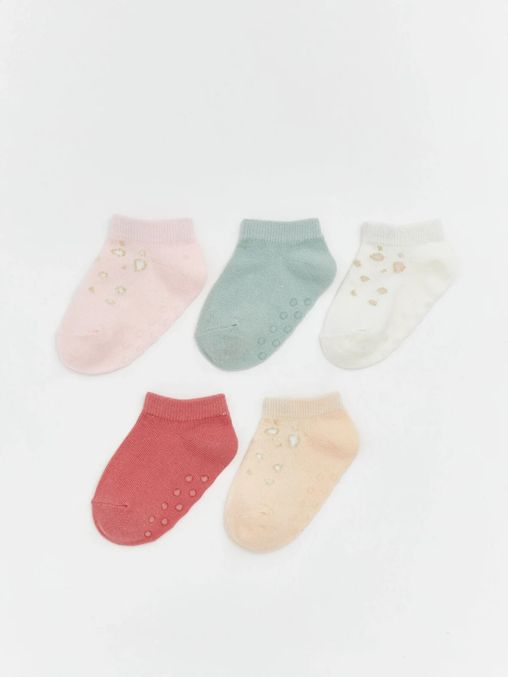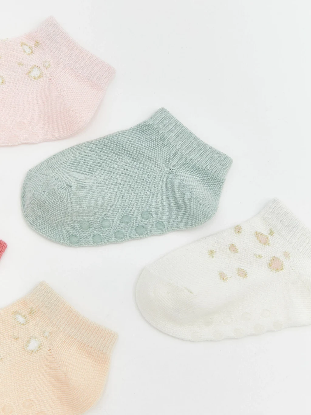 Kız bebek patik çorap, kaydırmaz tabana sahiptir. Set, desenli ve düz dokulu farklı modeller içerir.