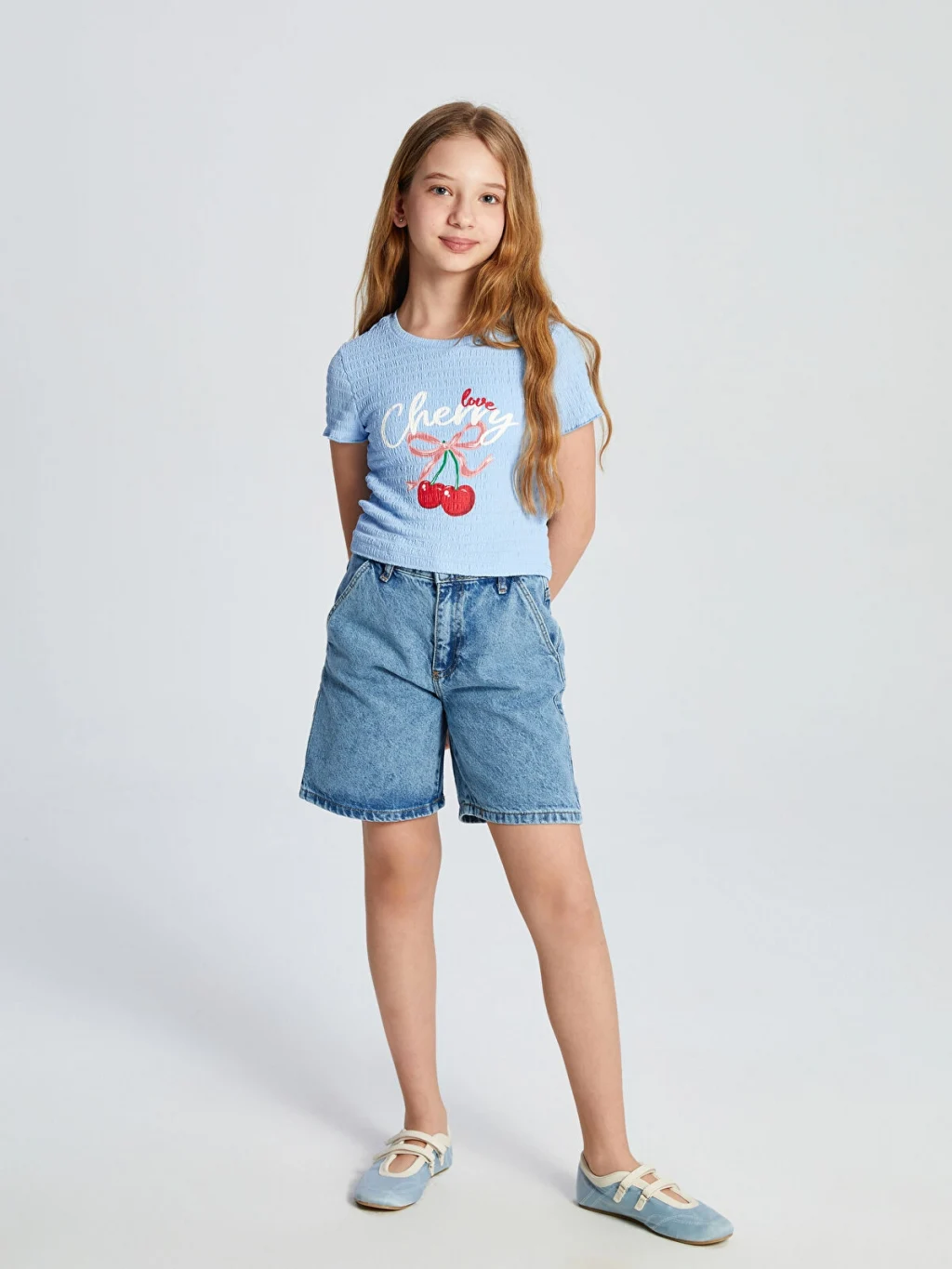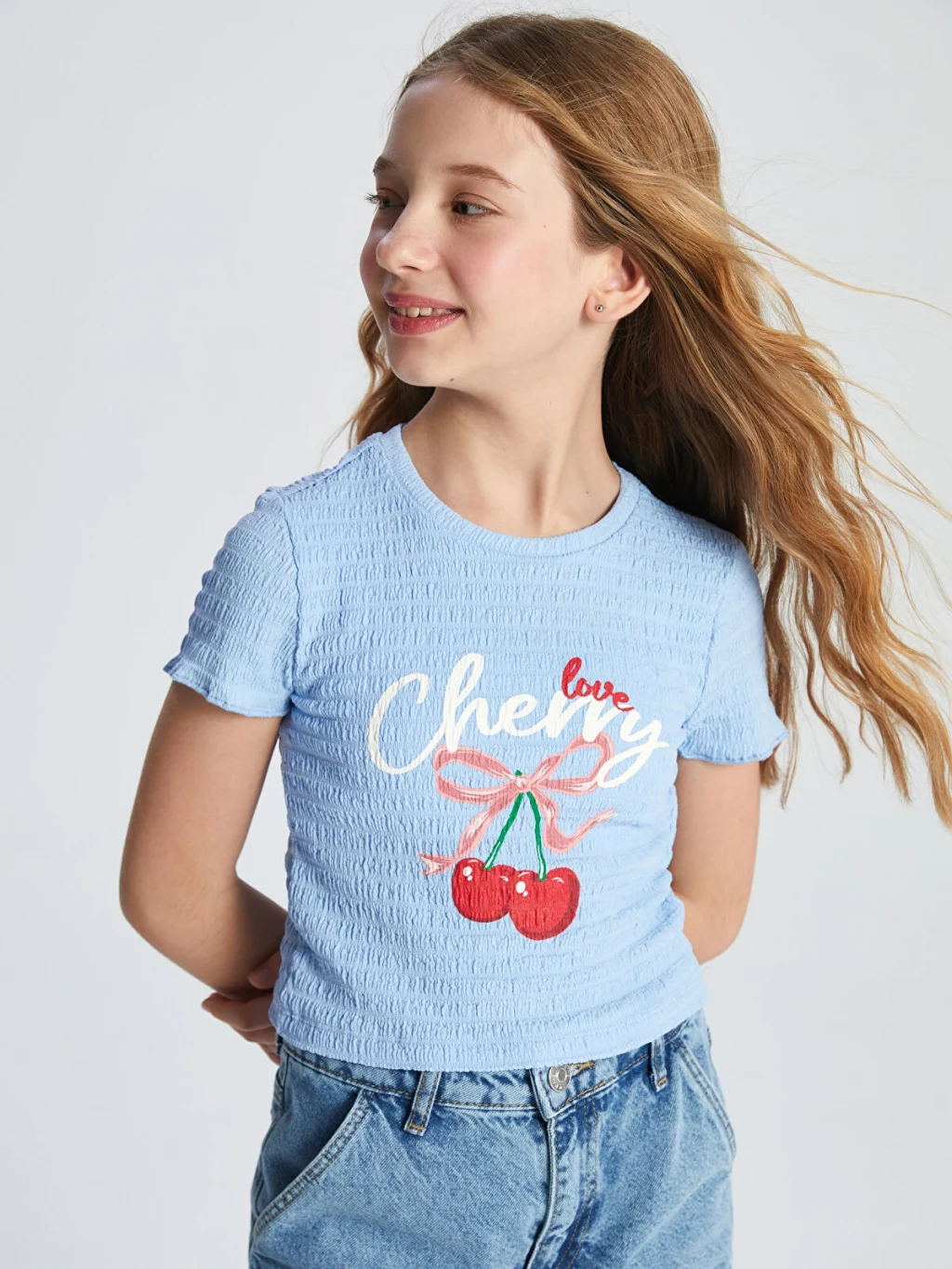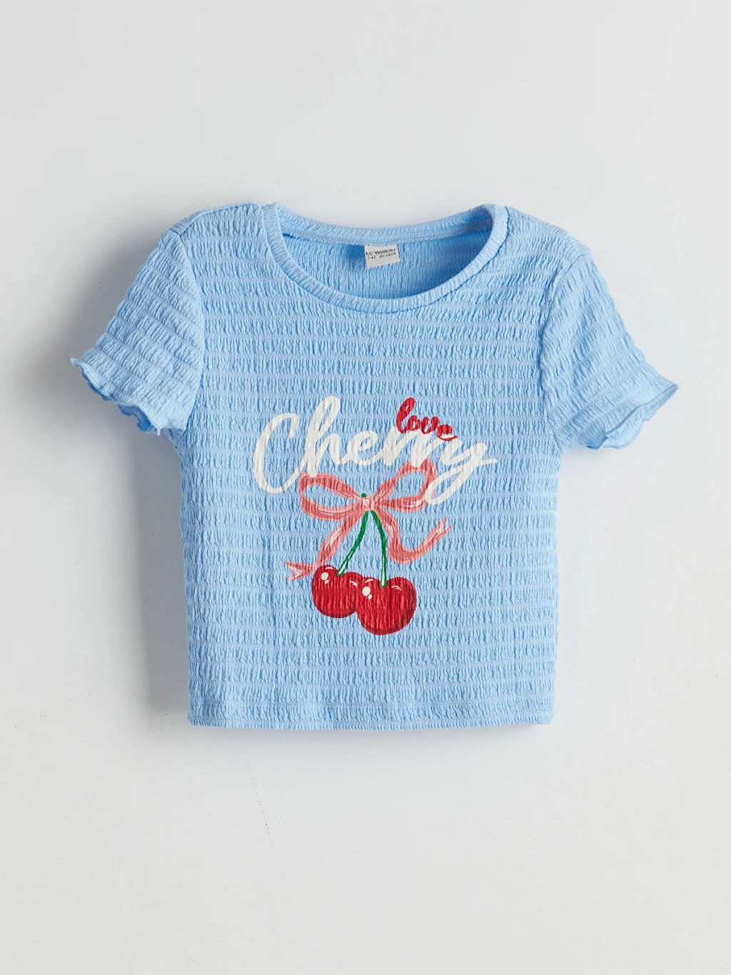 Dar kalıp kız çocuk tişört, gofre kumaştan üretilmiştir. Bisiklet yakalı, kısa kollu ve önü yazı ve kiraz nakışlıdır.