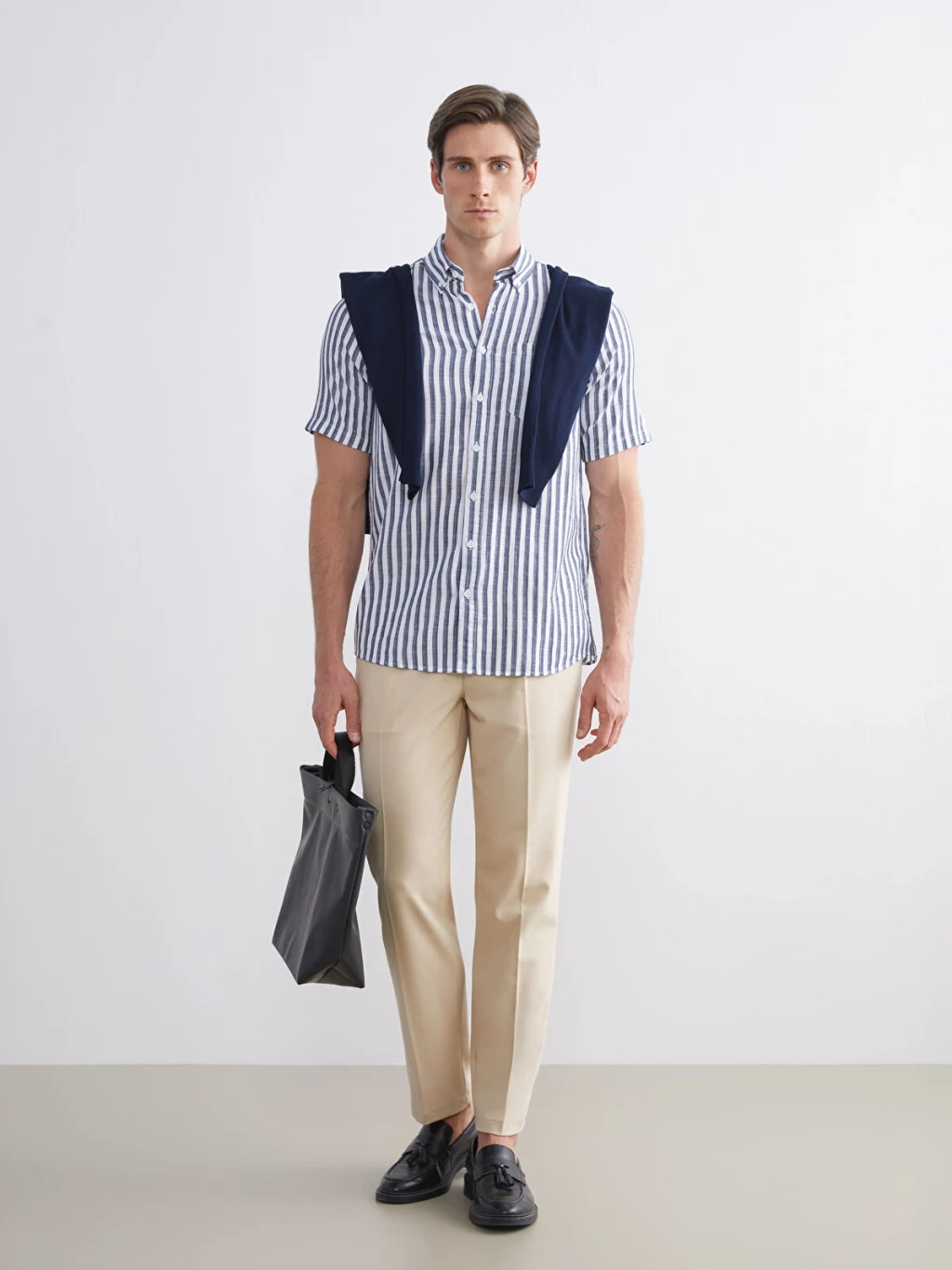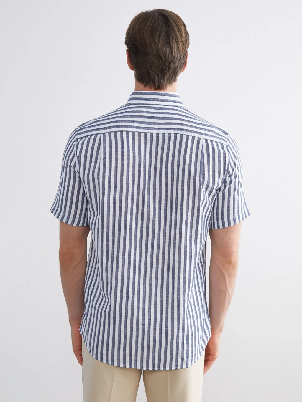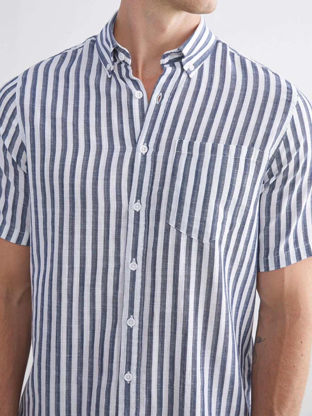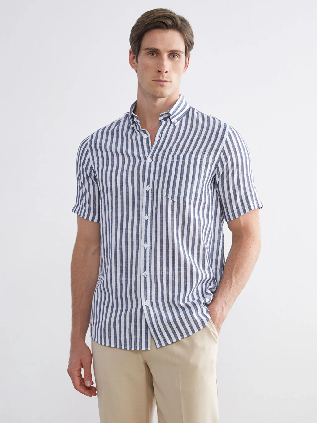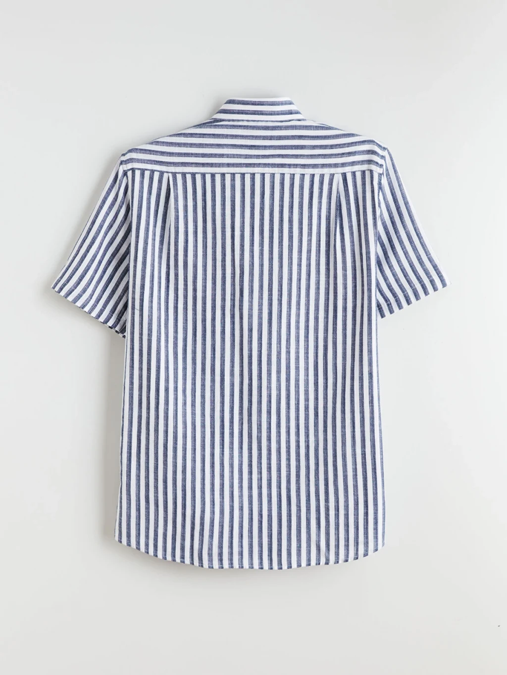 Çizgili desenli, kısa kollu erkek gömlek, %100 pamuklu kumaştan üretilmiştir. Gömlek yakalıdır, önden düğme kapamalıdır ve göğüs cebi bulunur.