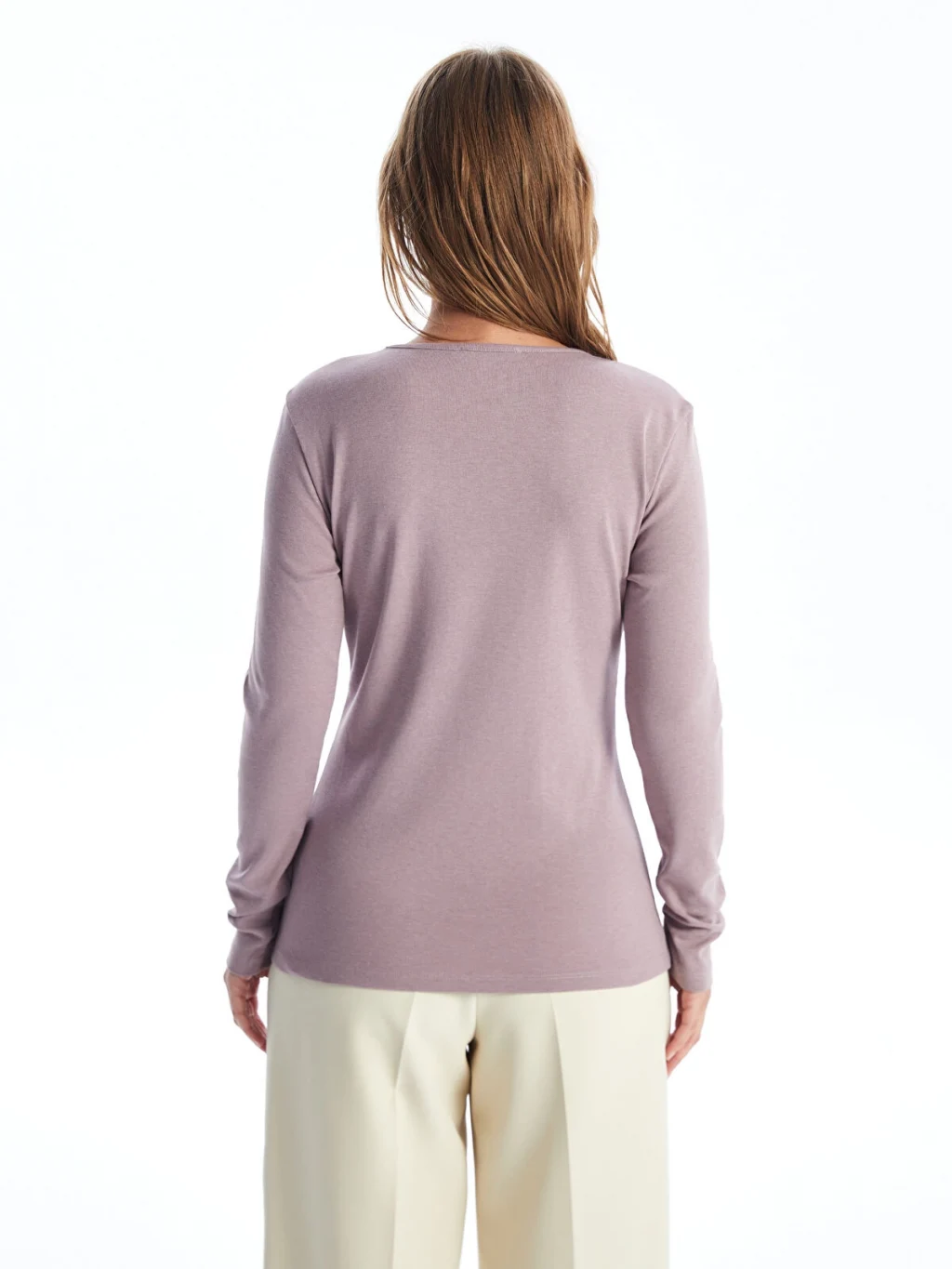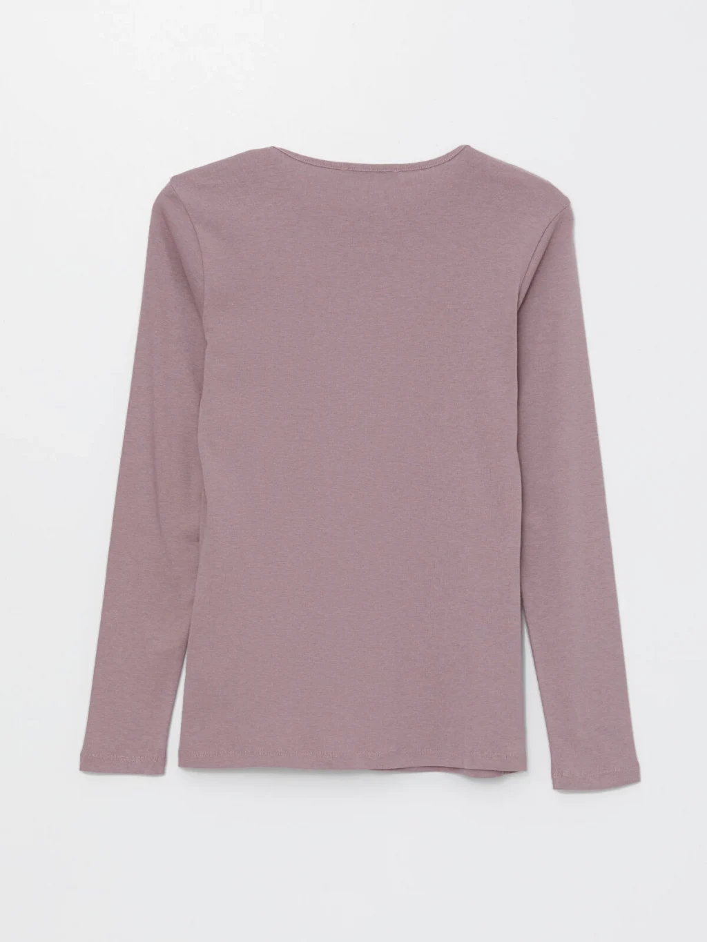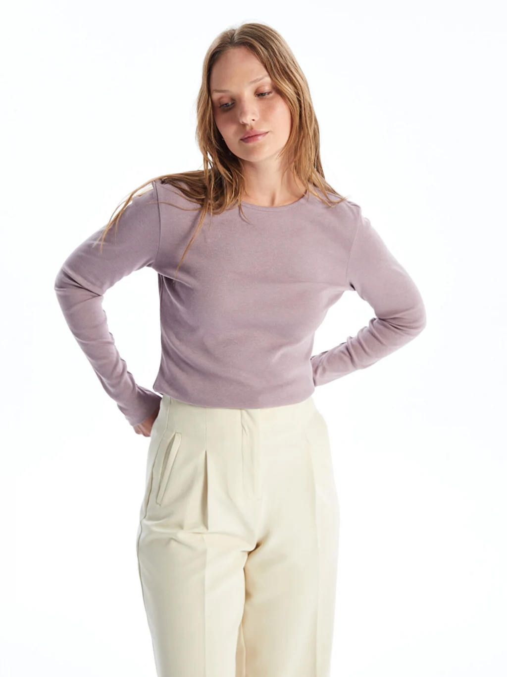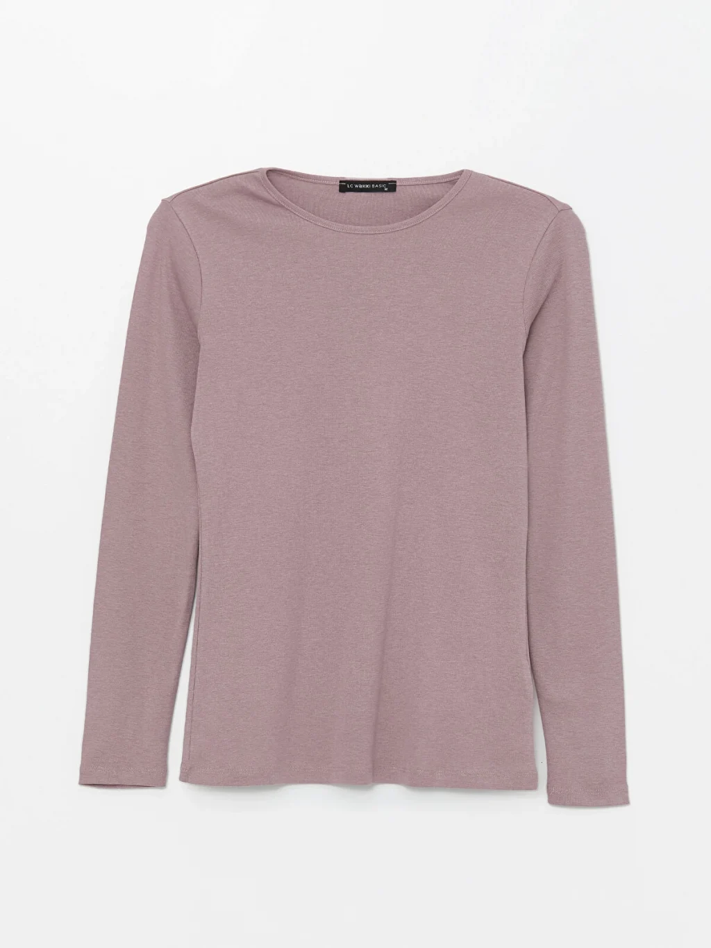 Dar kalıplı, bisiklet yaka ve uzun kollu kadın tişört, ribana kumaştan üretilmiştir.