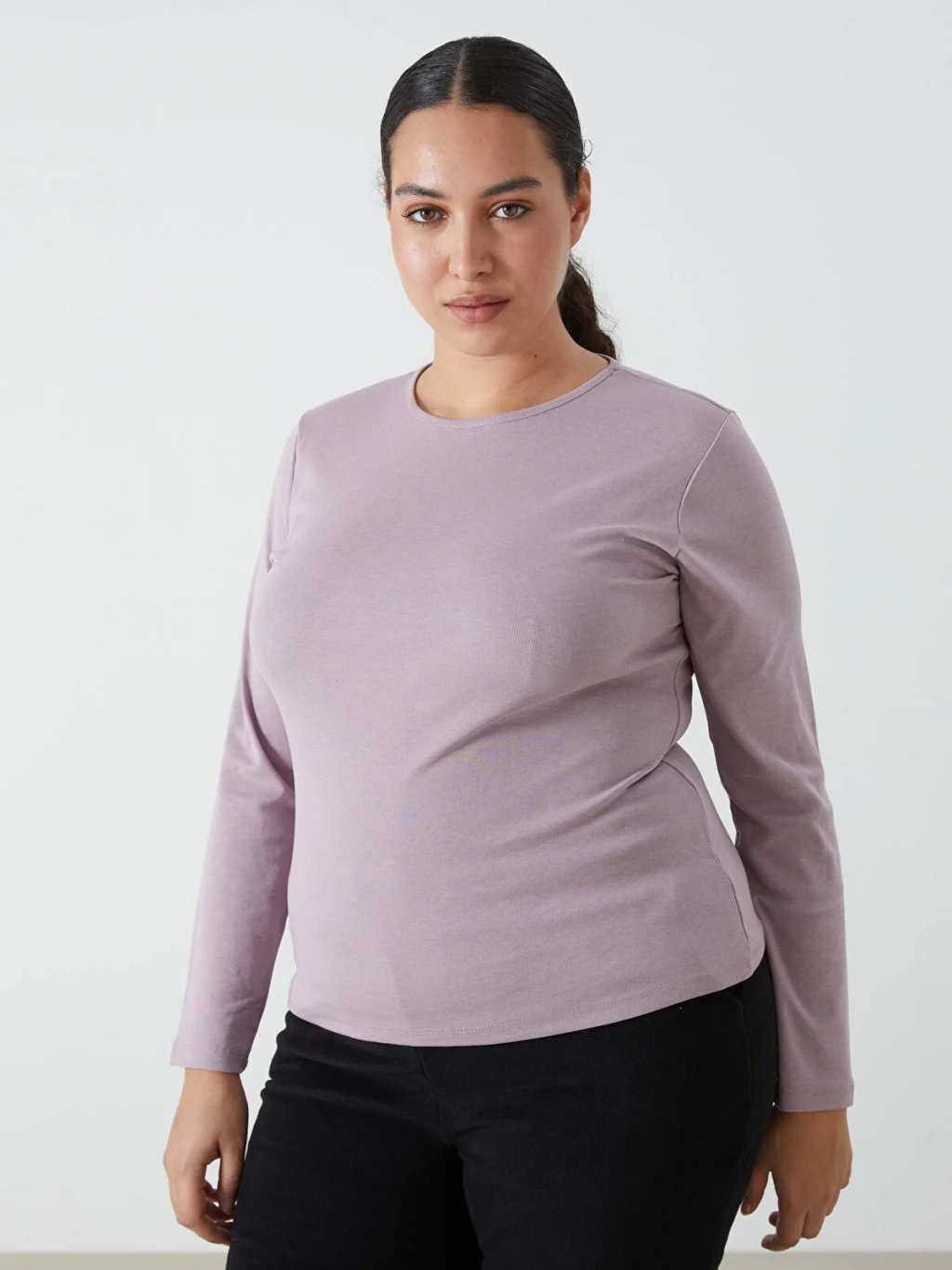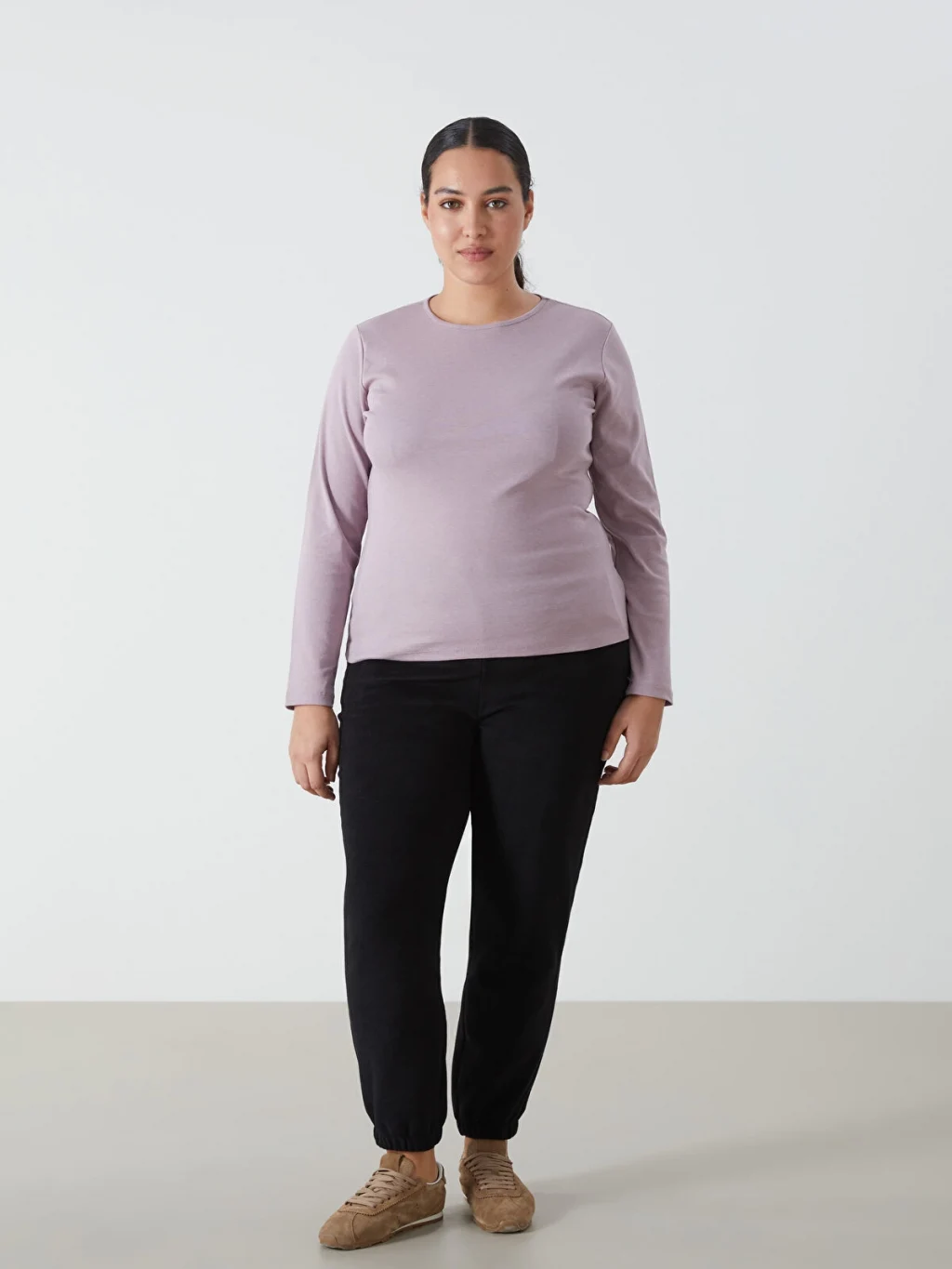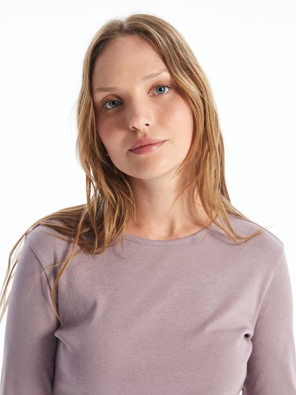 Dar kalıplı, bisiklet yaka ve uzun kollu kadın tişört, ribana kumaştan üretilmiştir.