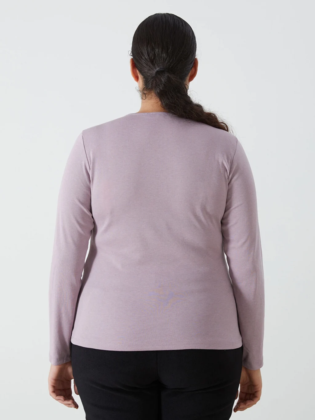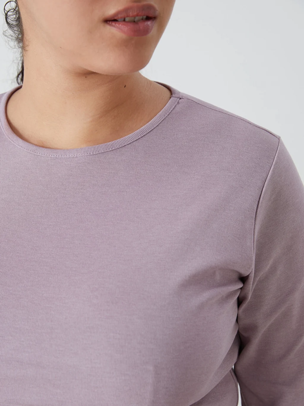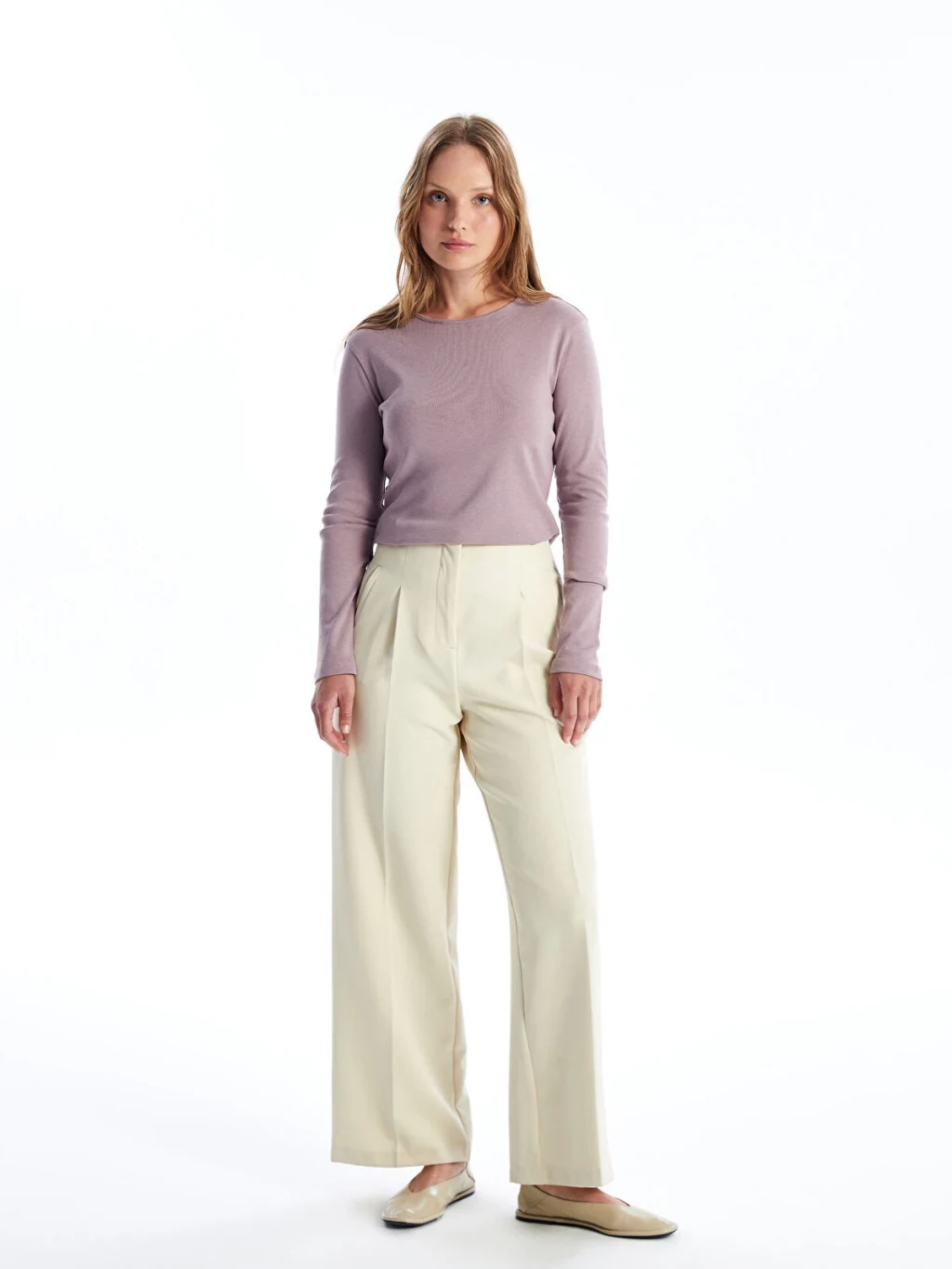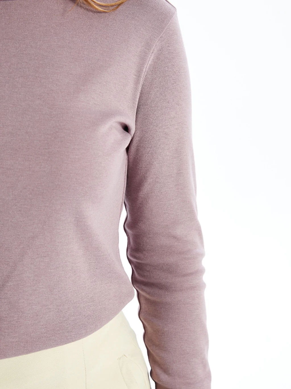Dar kalıplı, bisiklet yaka ve uzun kollu kadın tişört, ribana kumaştan üretilmiştir.