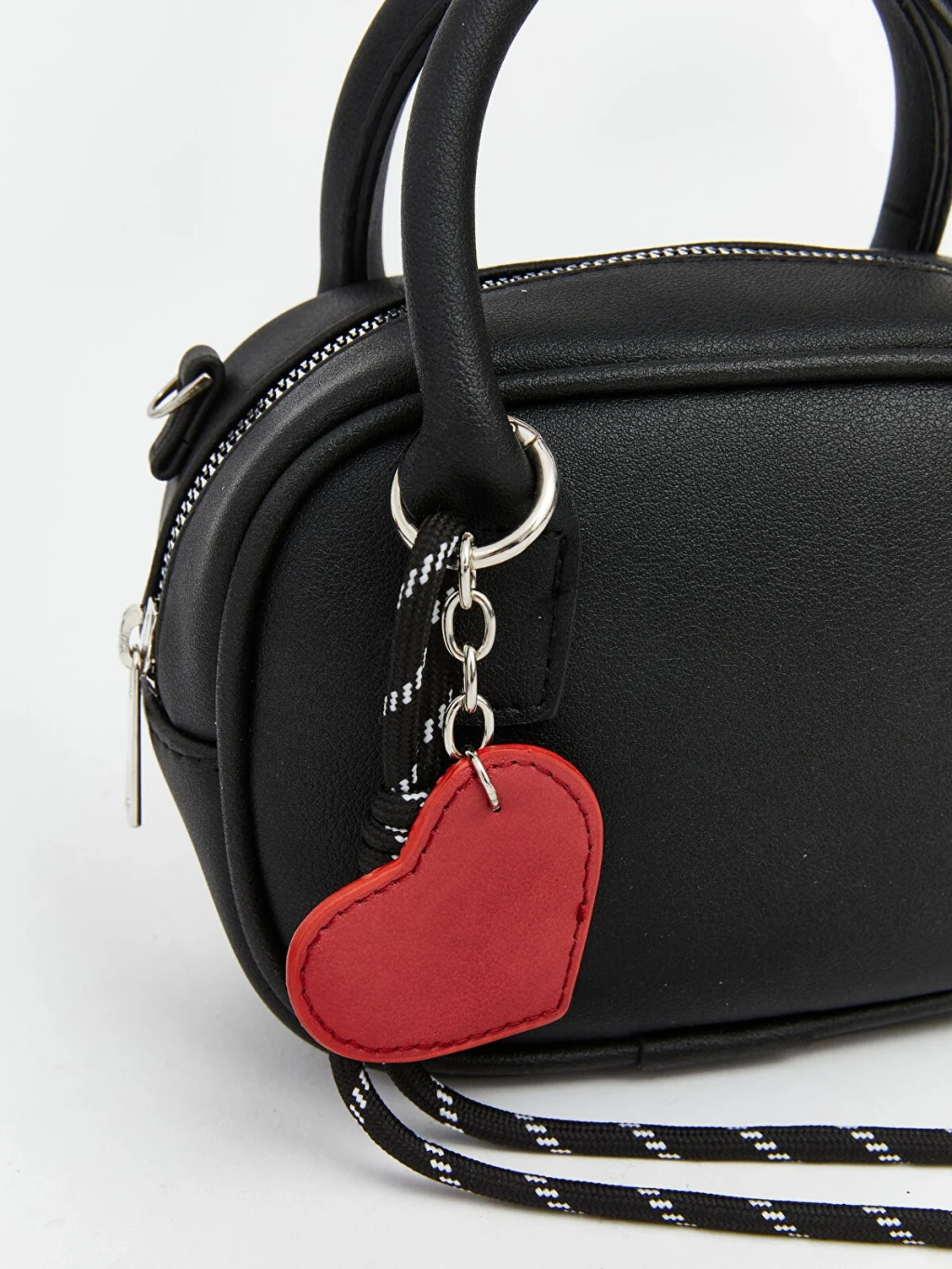 Kadın omuz çantası, el taşıma sapı ve ayarlanabilir omuz askısına sahiptir. Fermuar kapamalı tek ana bölmesi ve aksesuar detayı bulunur.