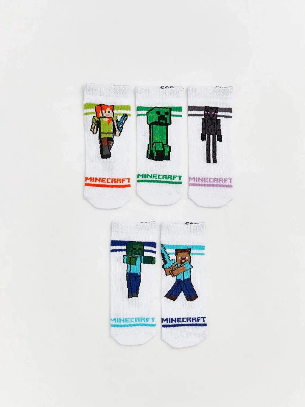 Minecraft lisanslı erkek çocuk patik çorap, farklı karakter baskılarına sahip beş çiftten oluşan bir pakettir.