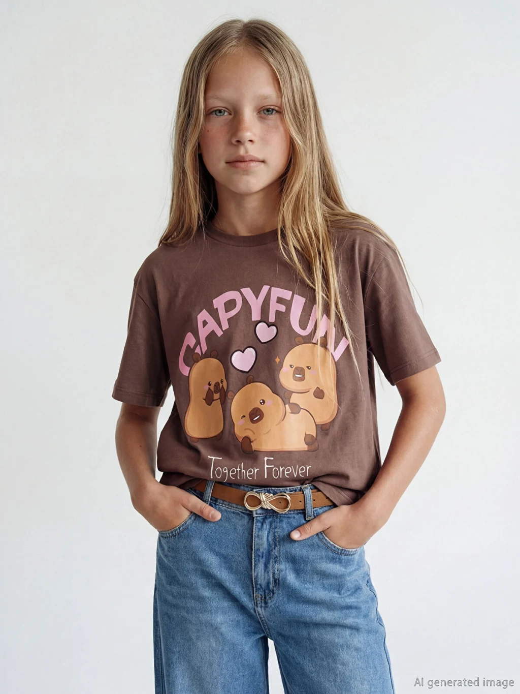 Kız çocuk tişört, bisiklet yaka ve kısa kolludur. Bol kalıplı ürün, pamuklu penye kumaştan üretilmiştir ve önü baskılıdır.