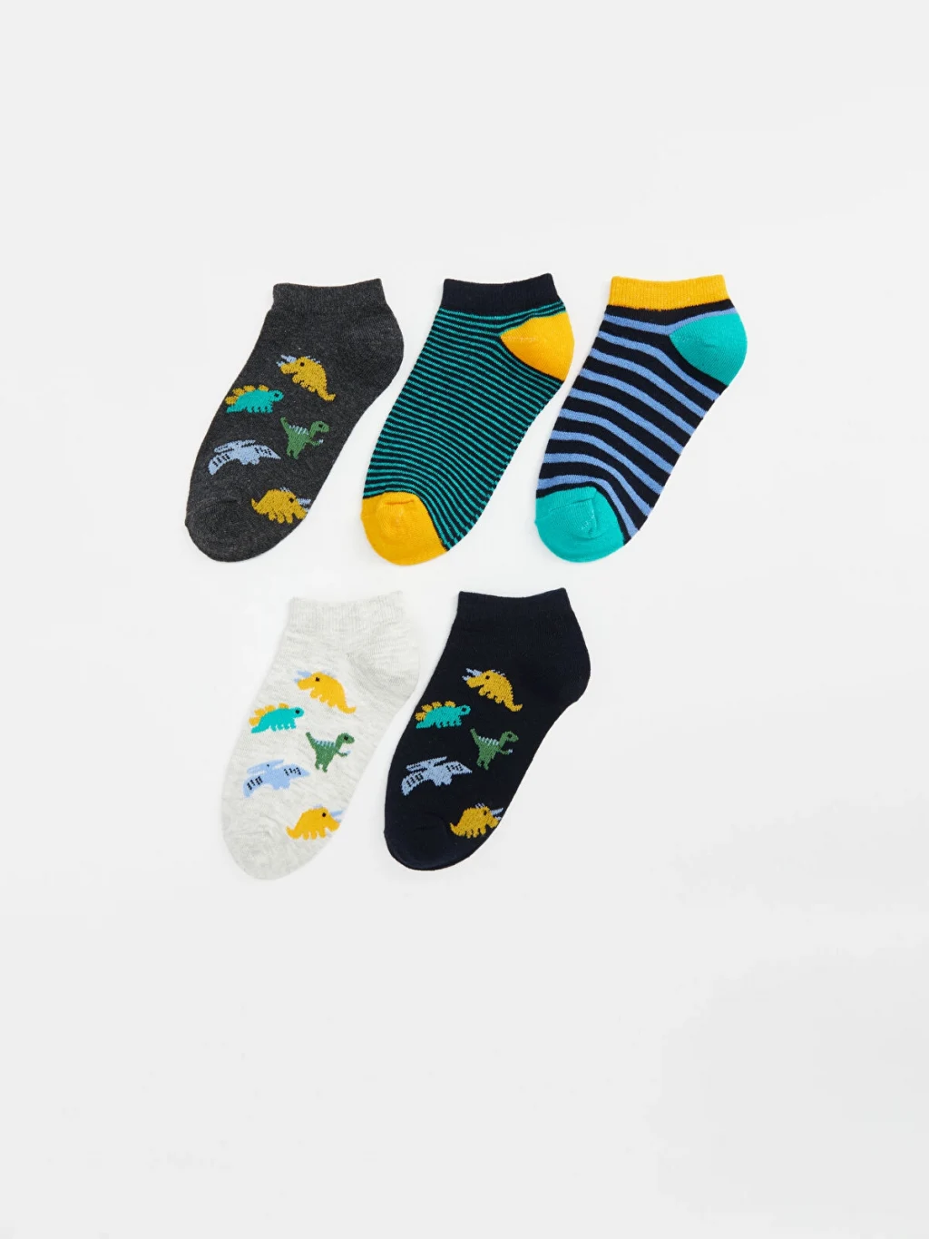 Beş çiftten oluşan erkek çocuk patik çorap seti, dinozor desenli ve çizgili modellere sahiptir.